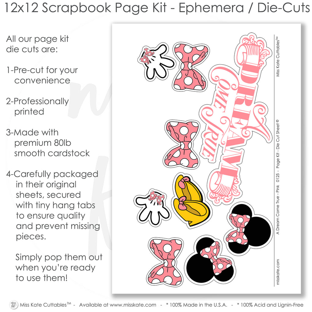 Die Cuts: All the die cuts you see on our layout picture, all cut out for you and ready to embellish your page kit!