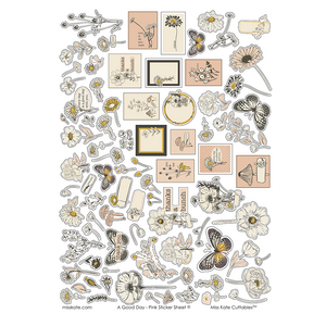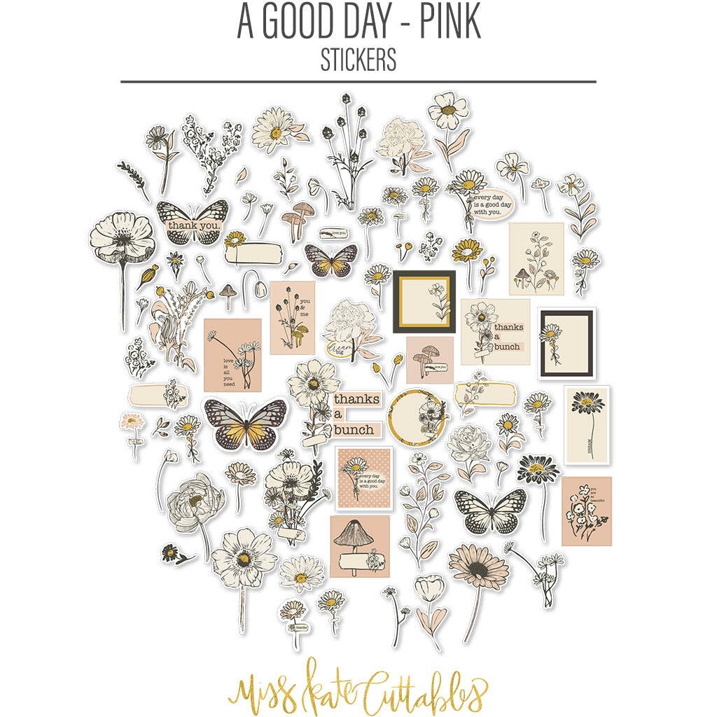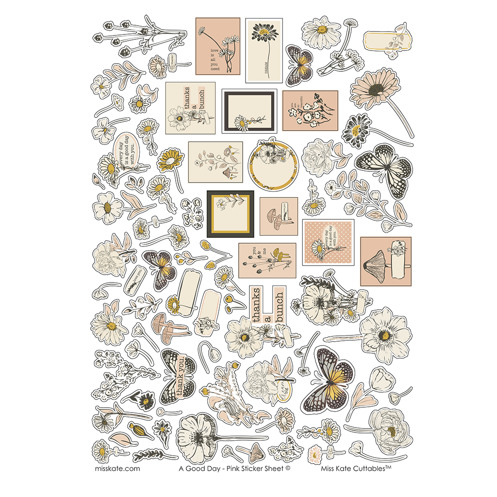 A Good Day Stickers - has a wide variety of designs, including flowers, journaling cards, butterflies, mushrooms, baby theme, foliage, floral, daisies, and phrases including "Thanks a Bunch". "Love is all You need", "Thank You", "Love You", "Every Day is a Good Day with You" and more.