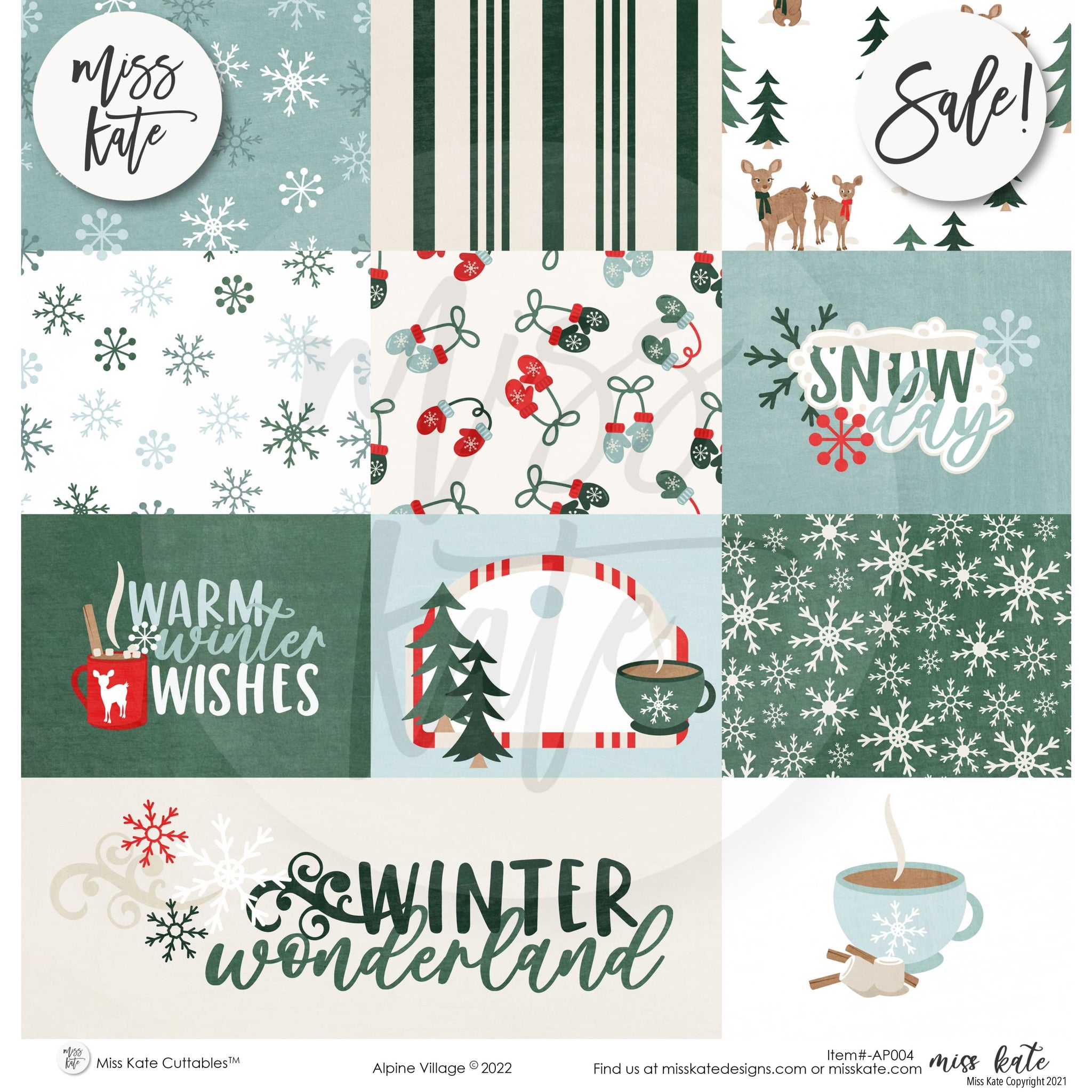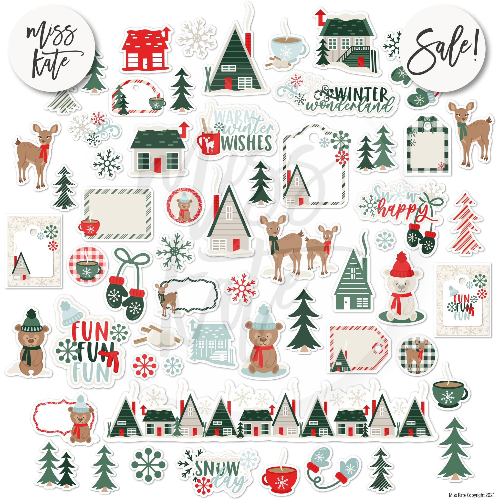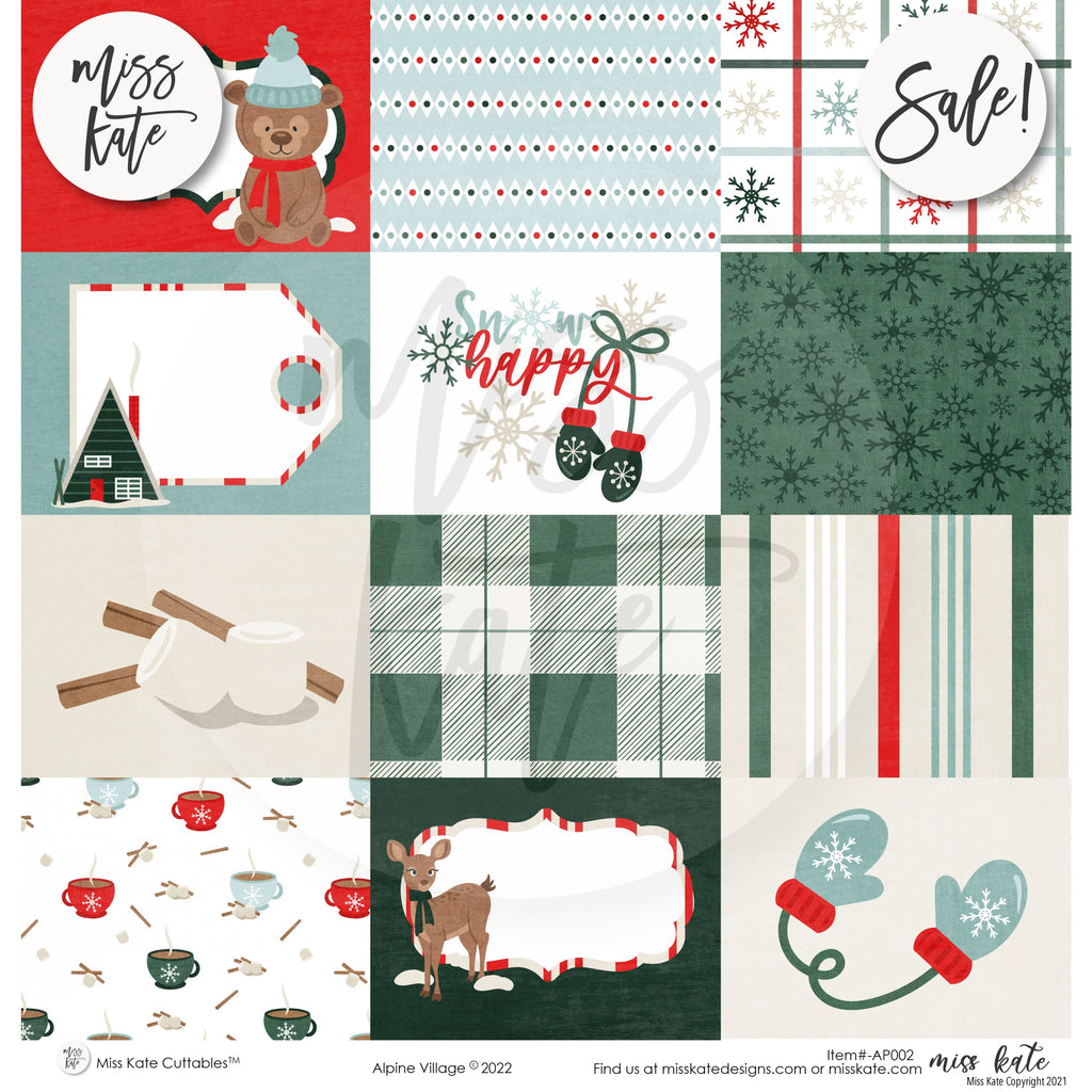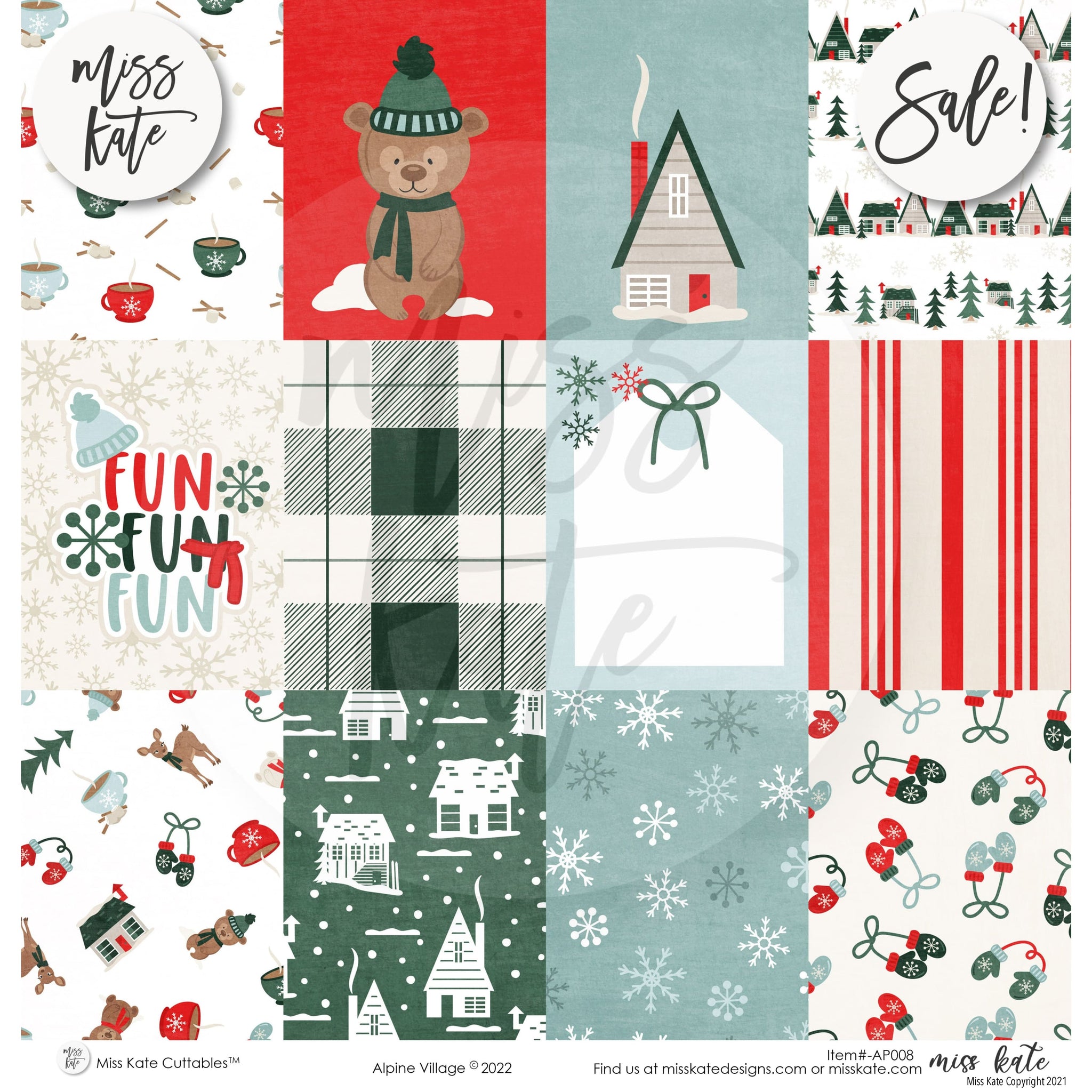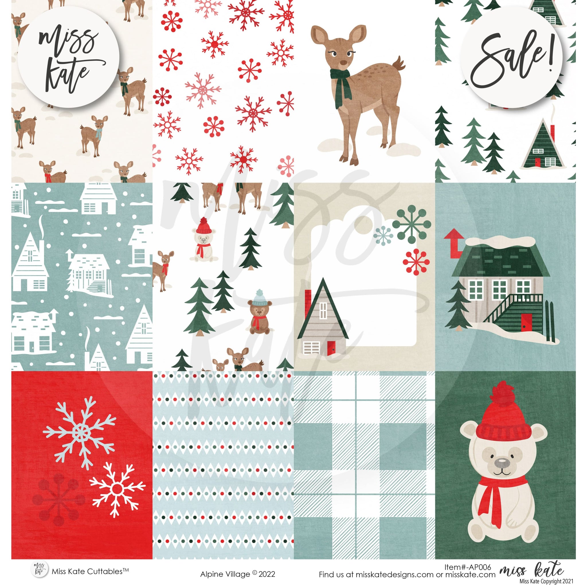 Alpine Village Double Sided Paper- Alpine Village is perfect for outdoor winter activities including skiing, snowboarding, tubing, snowmobiling, etc. With some blues, reds, and greens it evokes a modern take on winter. Includes some outdoor life including a mom deer, a baby deer, a bear, and a polar bear. It would be cute for a cozy, snowed in winter cabin drinking hot cocoa after some snow fun! It has 4-3X4 elements for embellishing and journaling, (if you don't want to use those there is always printing on the back). Stickers would be perfect for a planner!