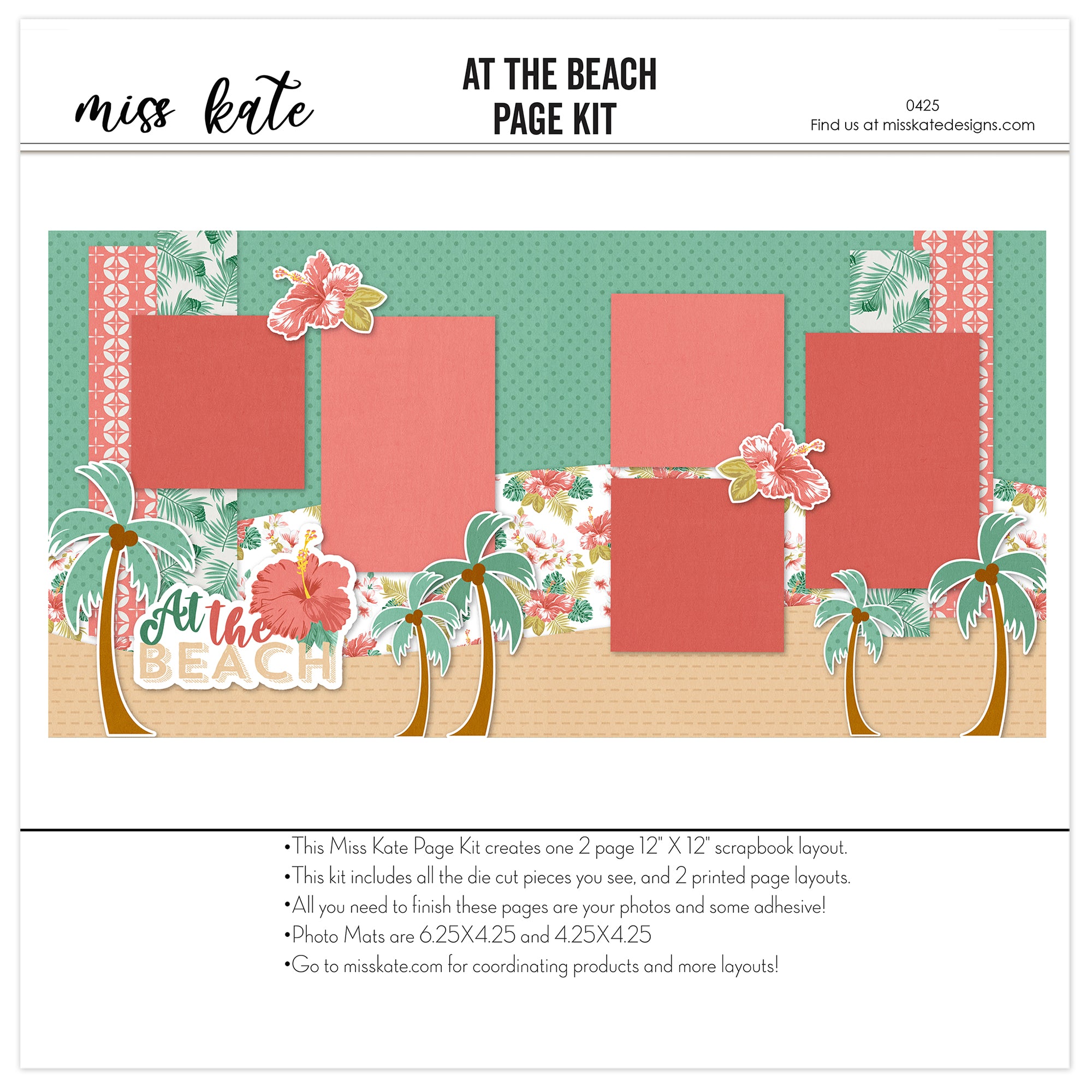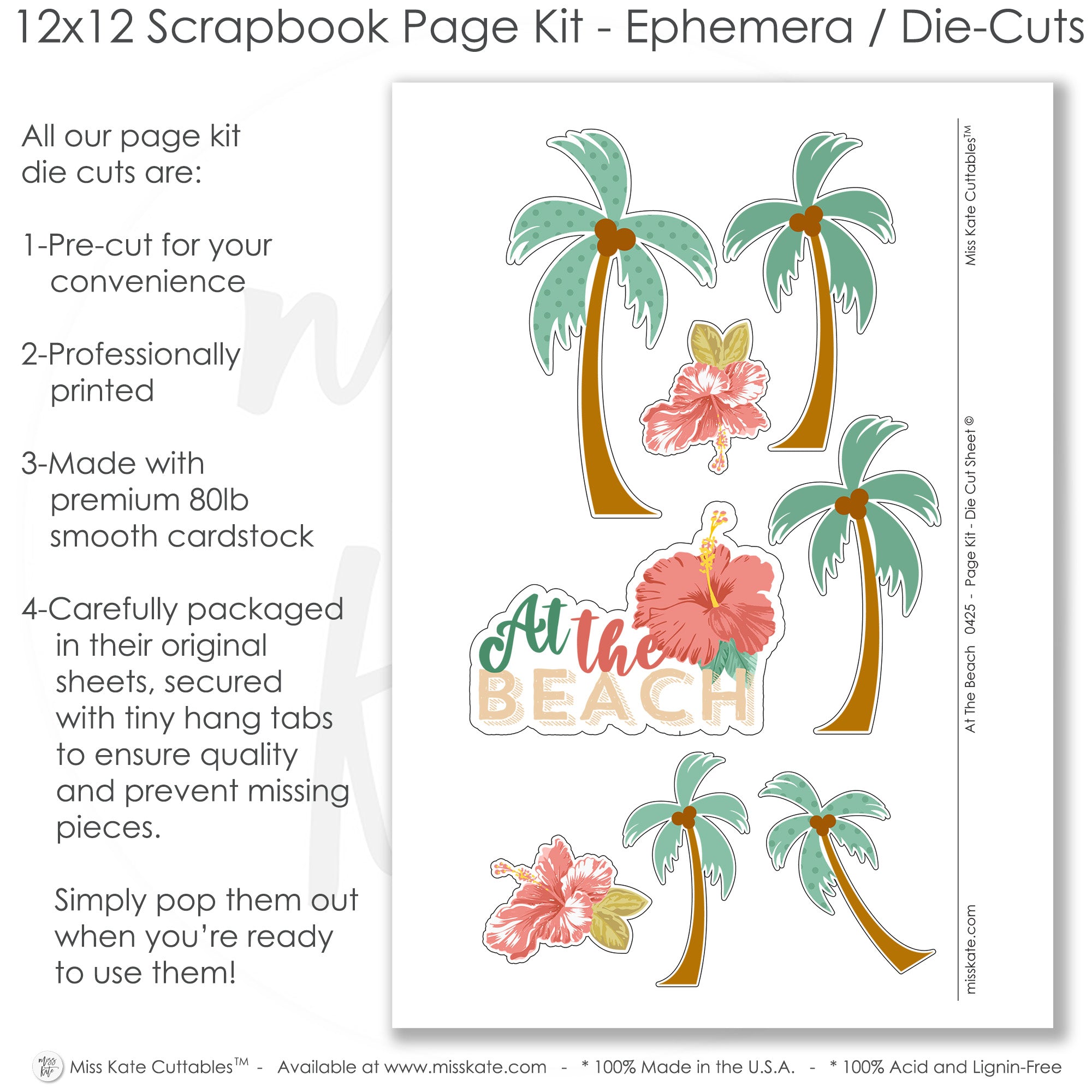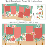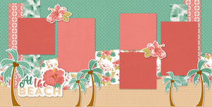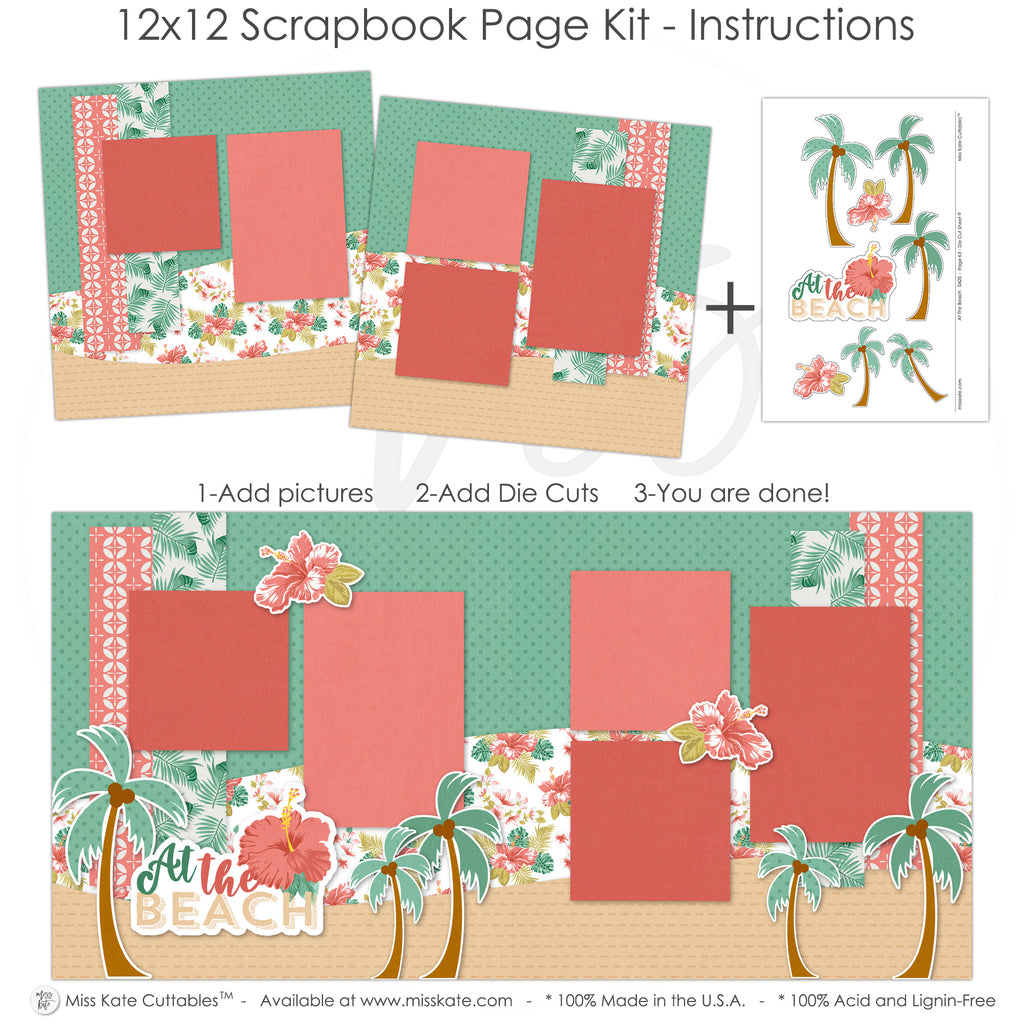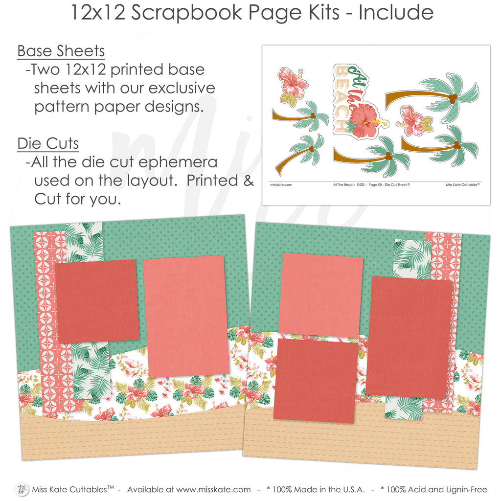 What to Expect• Two 12x12 base sheets with green polka dot and kraft sand backgrounds, coral and floral pattern layers • Die cuts: 3 palm trees with coconuts, 3 layered hibiscus flowers, 'At the Beach' title piece |