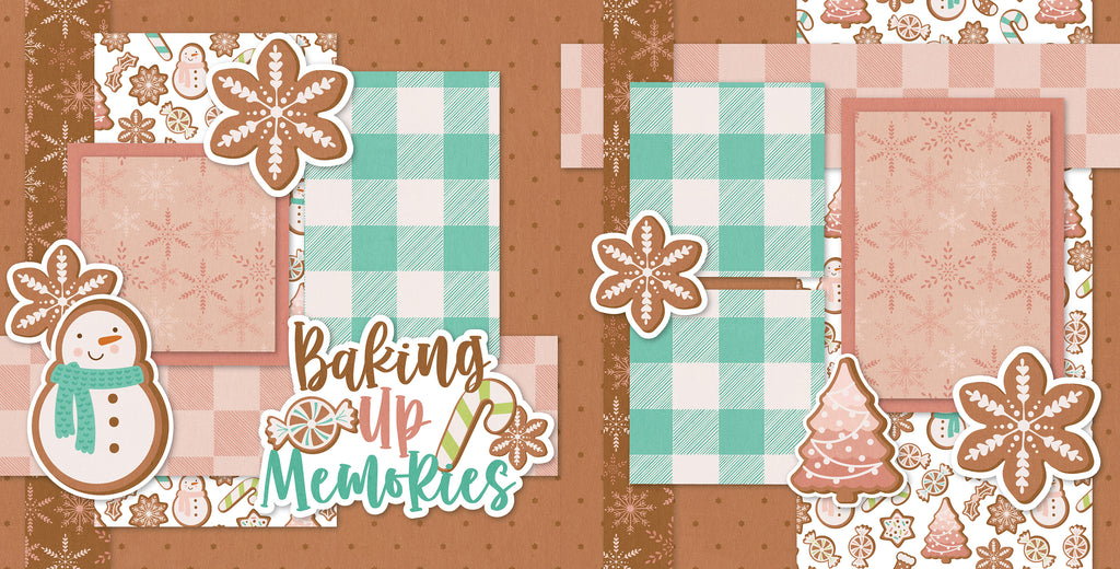 This delightful scrapbook layout captures the warmth and sweetness of the holiday season with a cozy baking theme. The background layers blend soft gingerbread brown, blush pink, and mint green hues, creating a charming, homey aesthetic. Playful patterns of snowflakes, plaid, and festive cookie motifs—like gingerbread men, snowmen, and Christmas trees—fill the pages with whimsy. The left page features a cheerful snowman and the title “Baking Up Memories” accented with a candy cane and cookie embellishments, perfectly setting the tone for holiday fun. Across both pages, cookie-shaped snowflakes and decorative clusters frame the photo mats, giving a frosted, handcrafted feel. The combination of rustic tones and sweet details makes this layout ideal for documenting cookie-baking traditions, family gatherings, or cozy winter days filled with laughter and love.