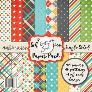 The Back to School Paper Pack has a wide variety of Patterns including Polka Dots, Stripes, Stars, Wrapping Paper, Plaid, Argyle, Checks, Red, White, Green, Yellow, Blue
