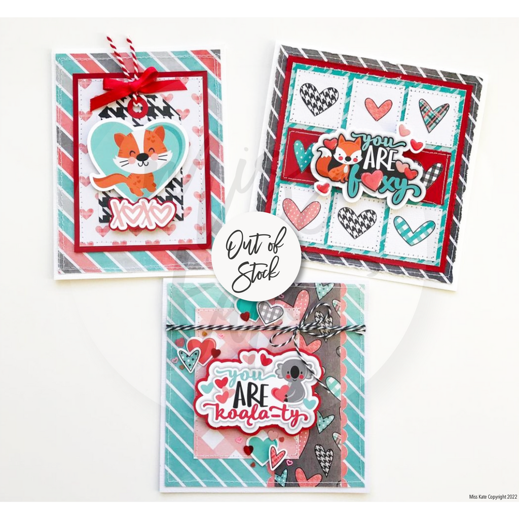 The Be Mine Die Cuts pack has a wide variety of shapes including XOXO, I Love You A Ton, Love, Kiss, You are Purrr-fect, You are Foxy, You are Udder-ly Amazing, You are so Deer to me, You are so Koala-ty, I Otter-ly Adore You Titles, Hearts Valentines, Fox, Otter, Cow, Deer, Koala, Elephant, Cat.