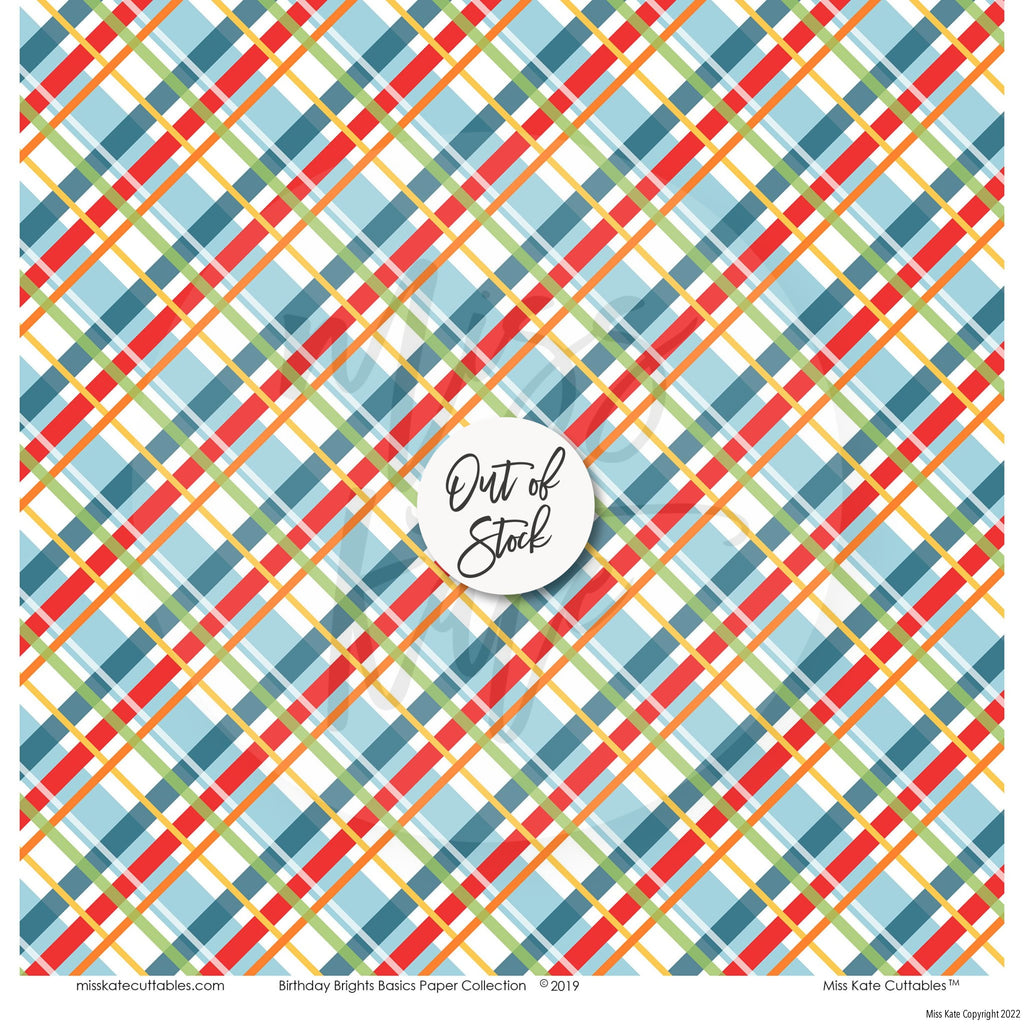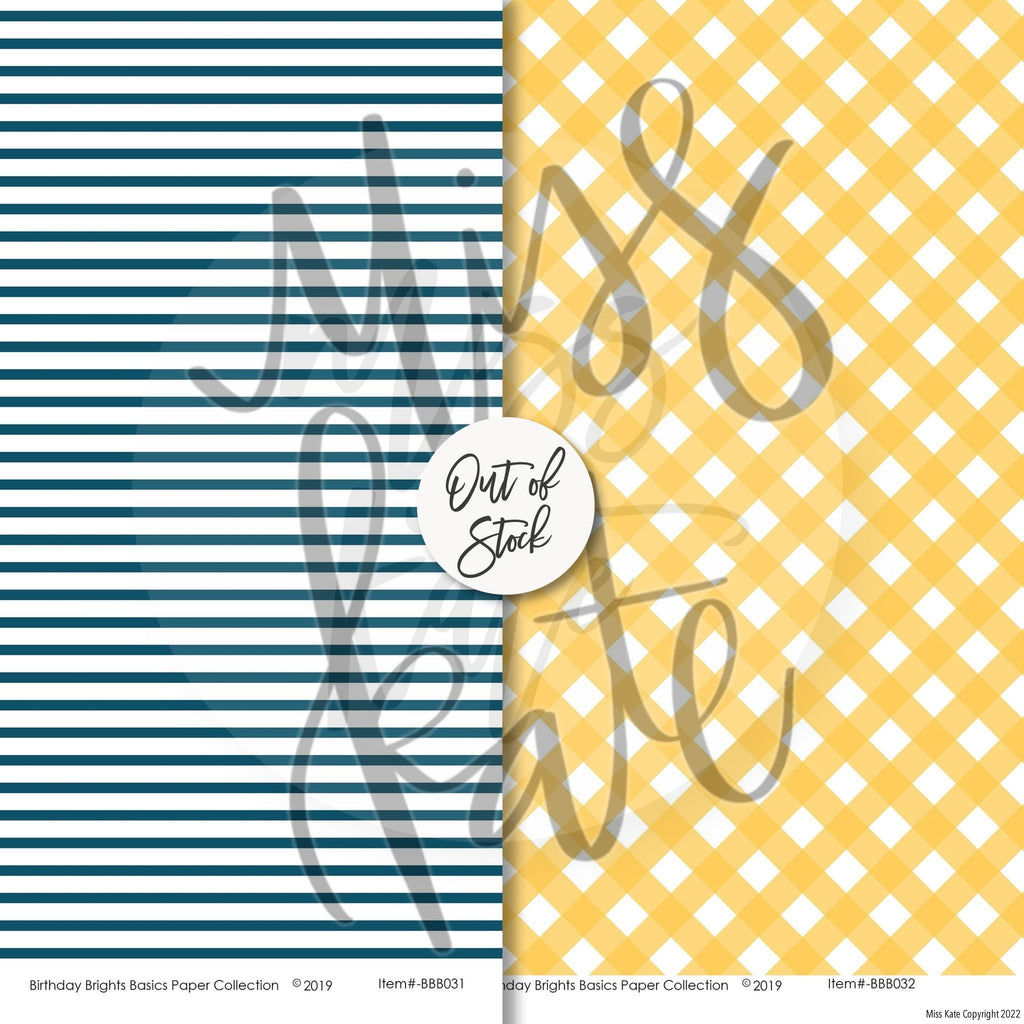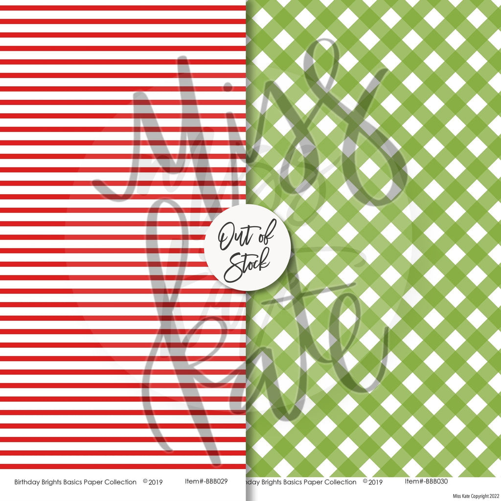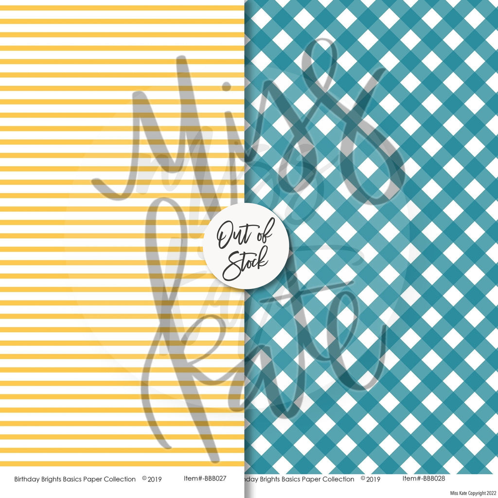 The Birthday Brights Basics Paper Pack features designs include polka dots, plaid, stripes.