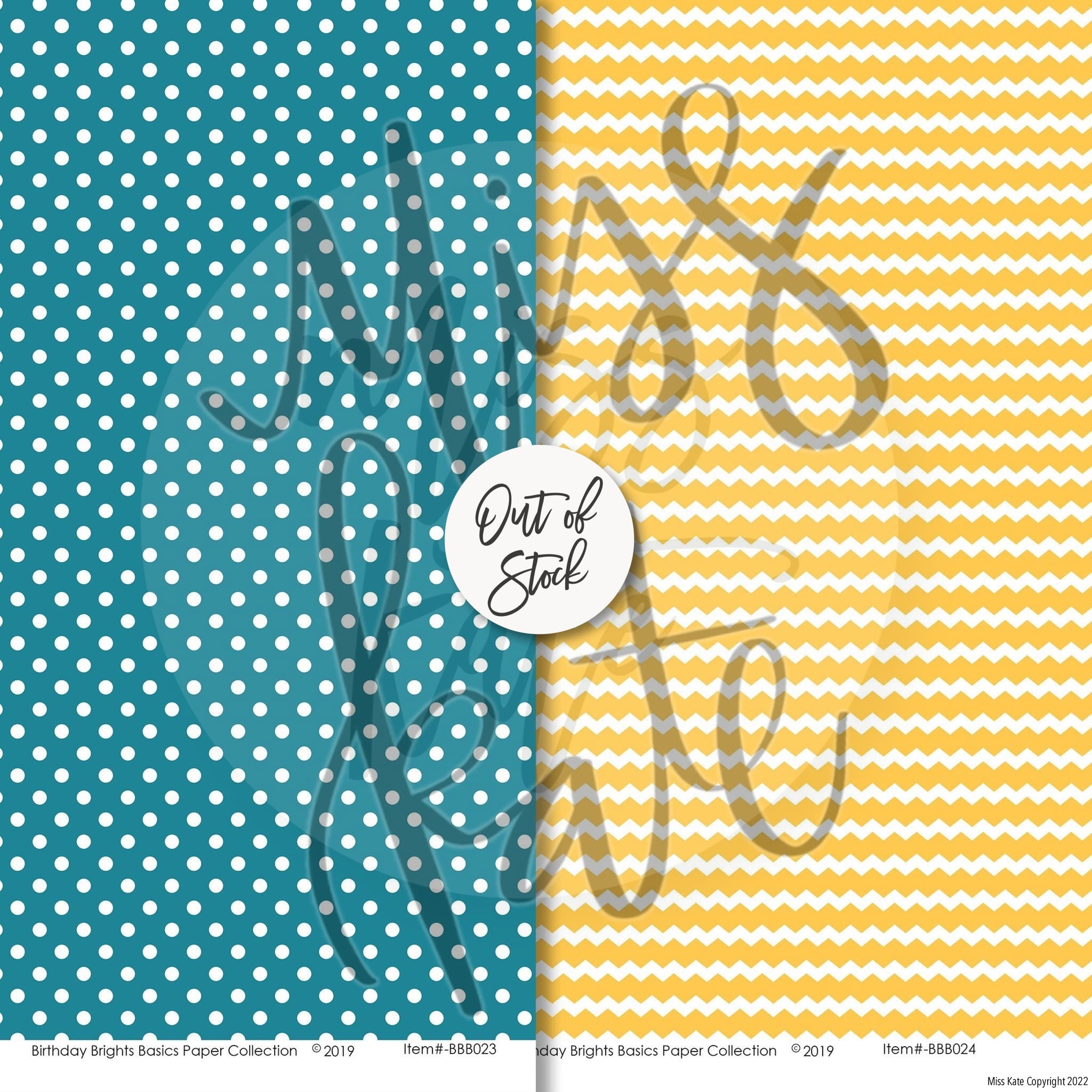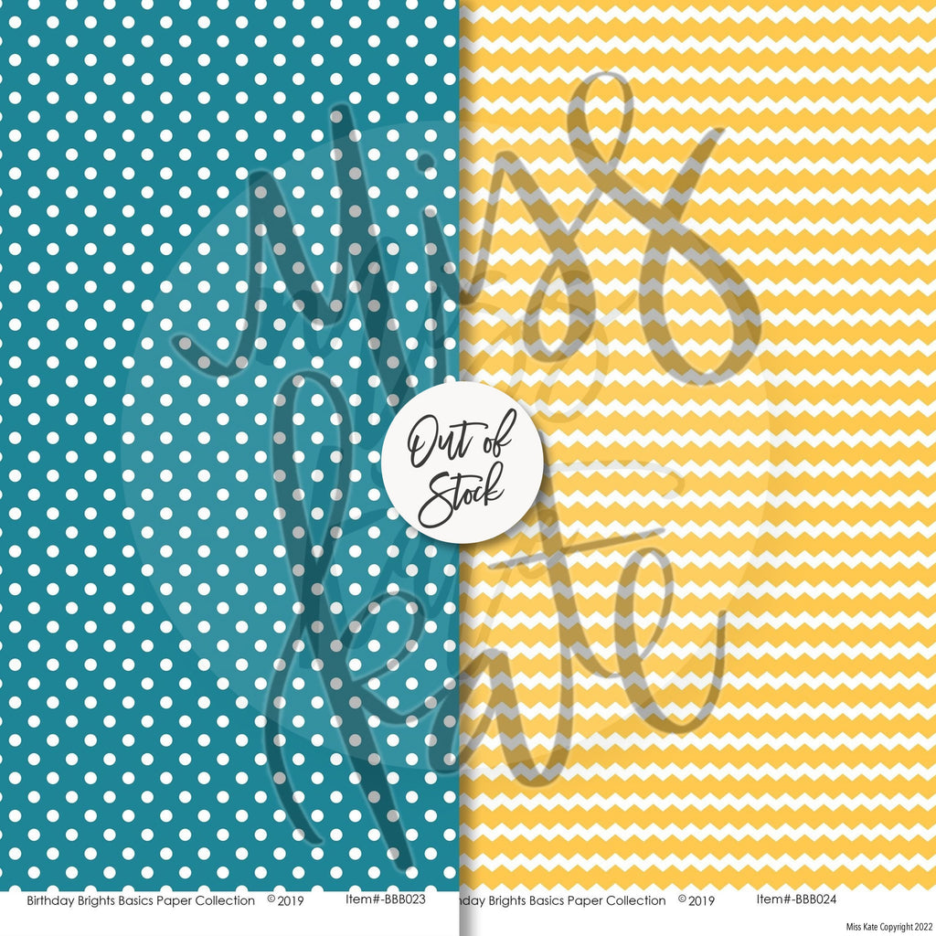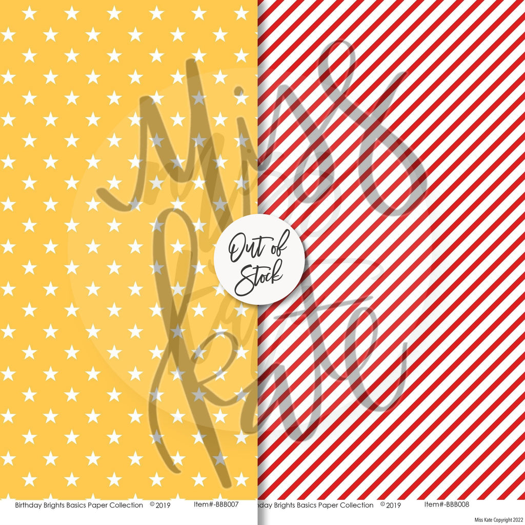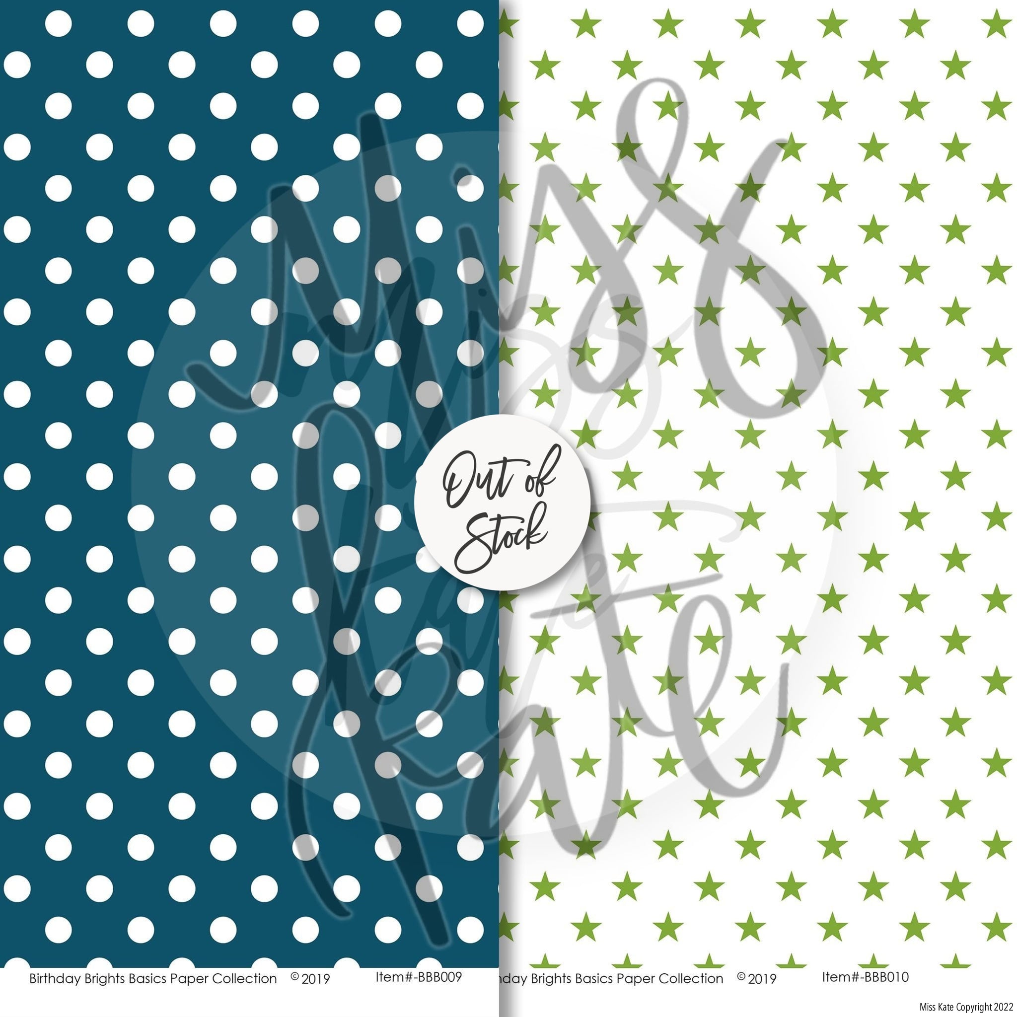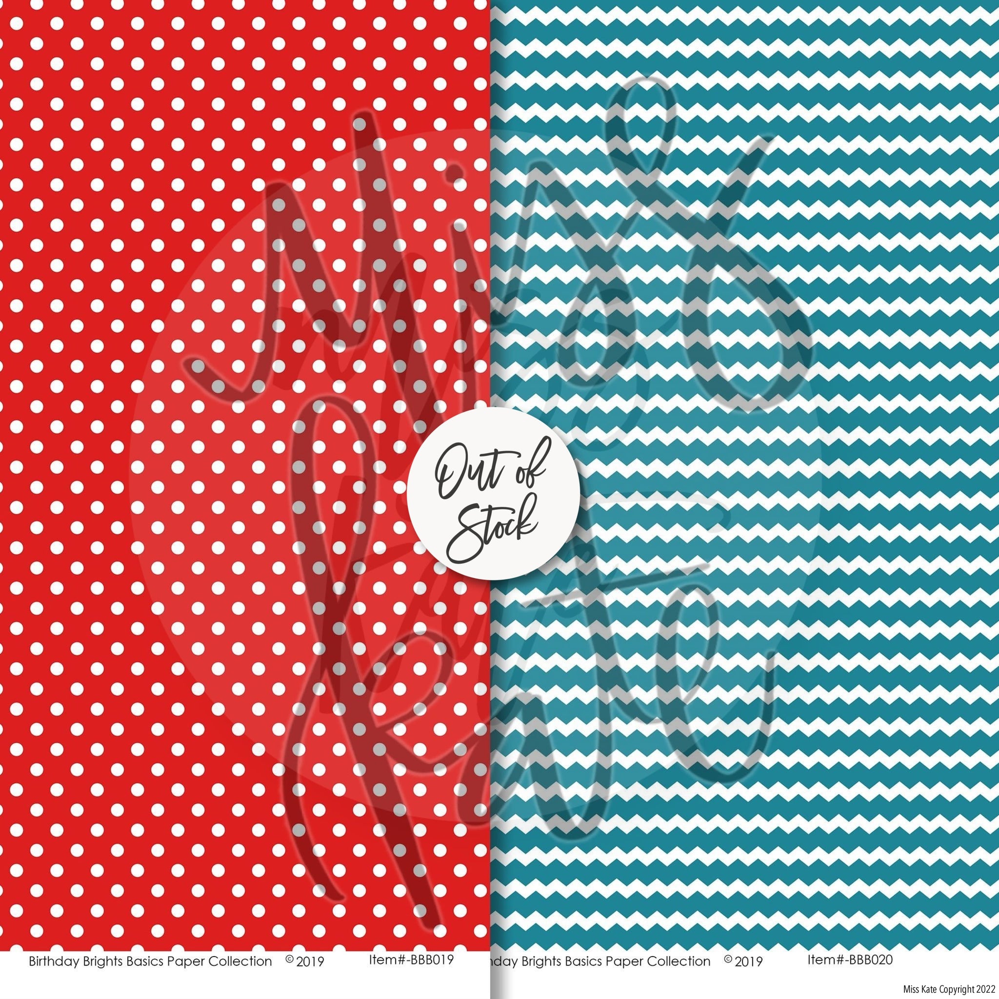 The Birthday Brights Basics Paper Pack features designs include polka dots, plaid, stripes.
