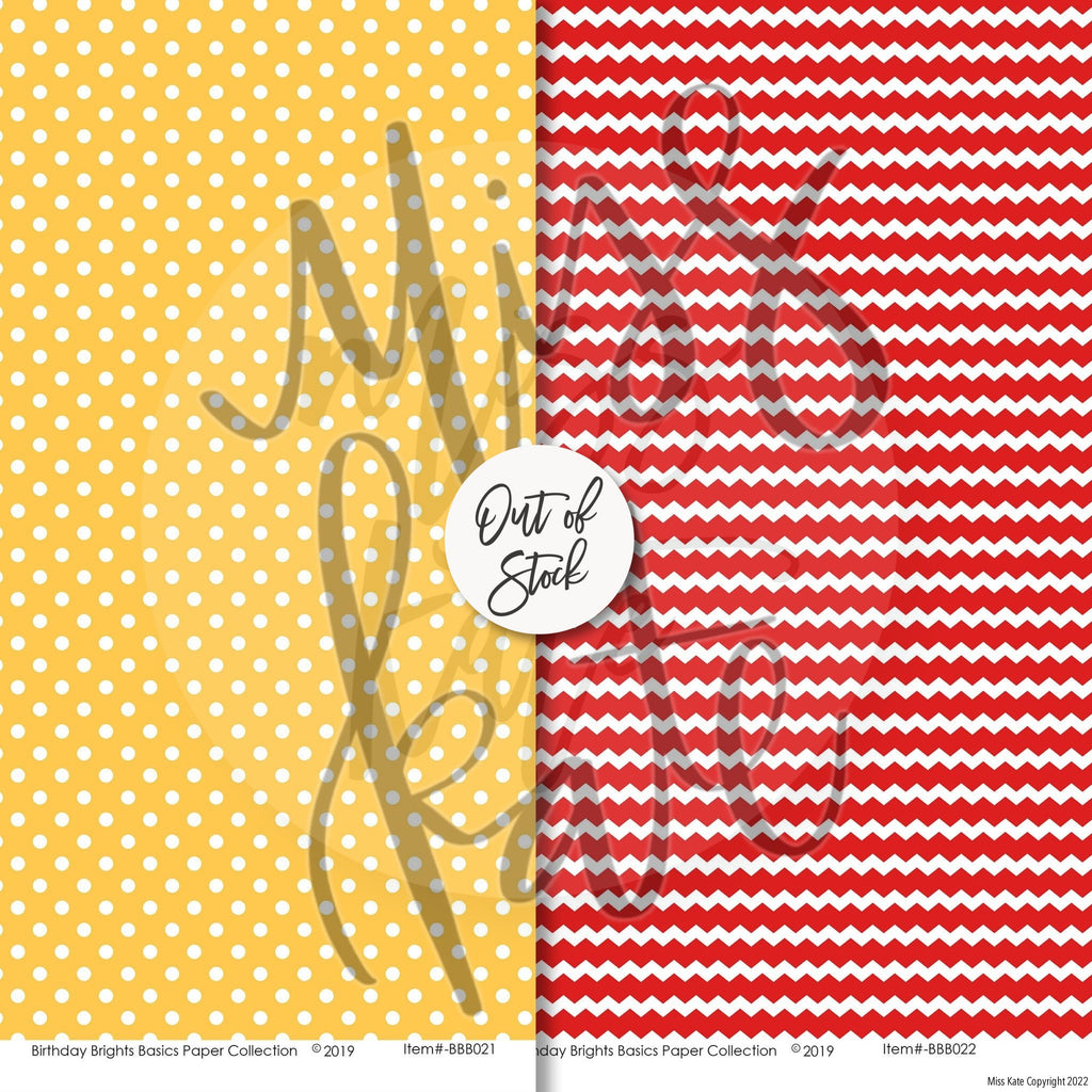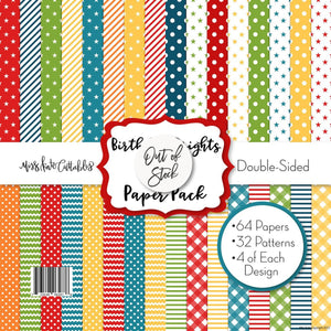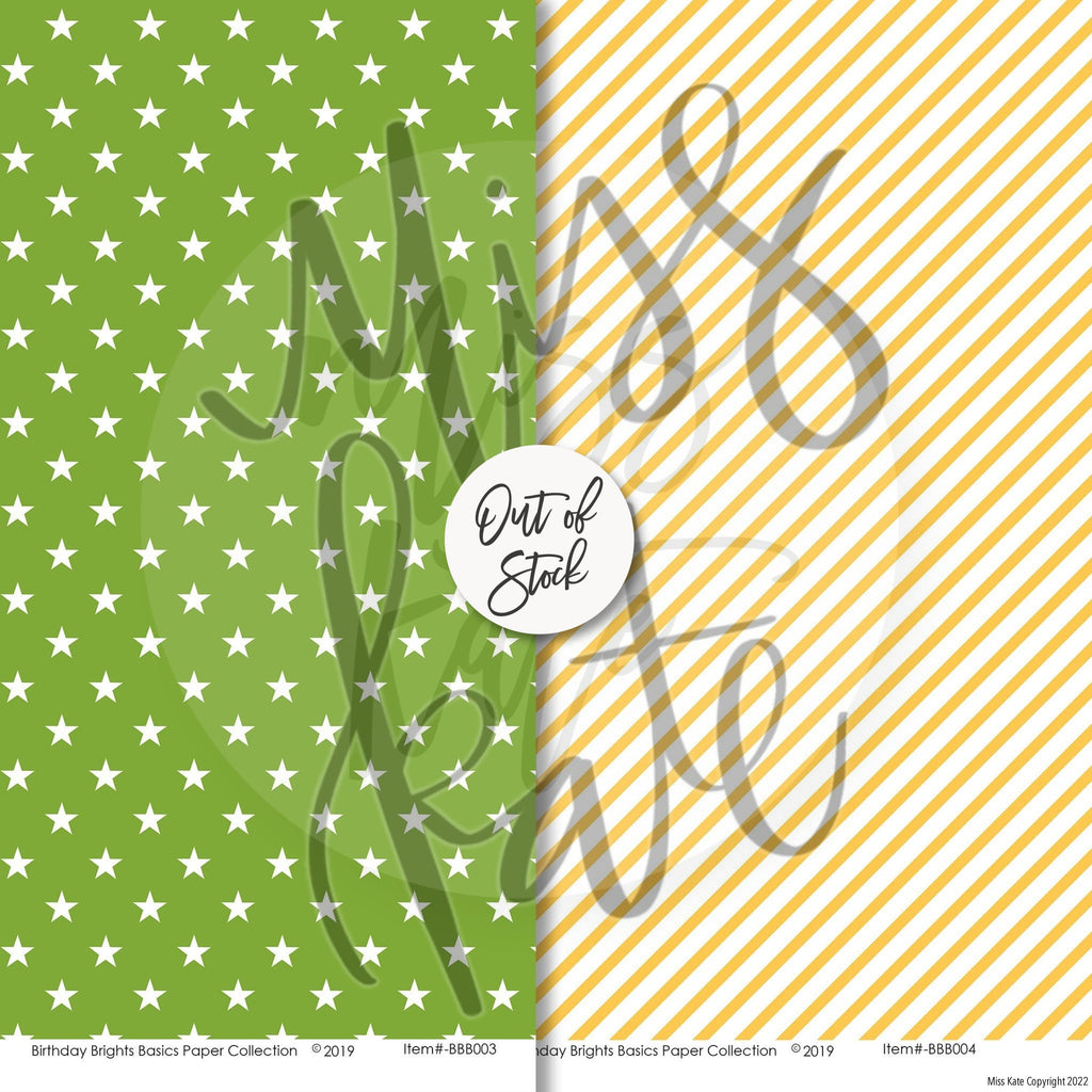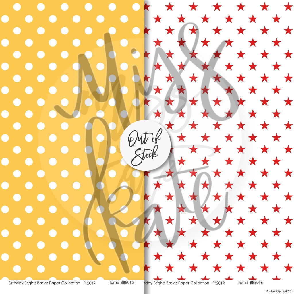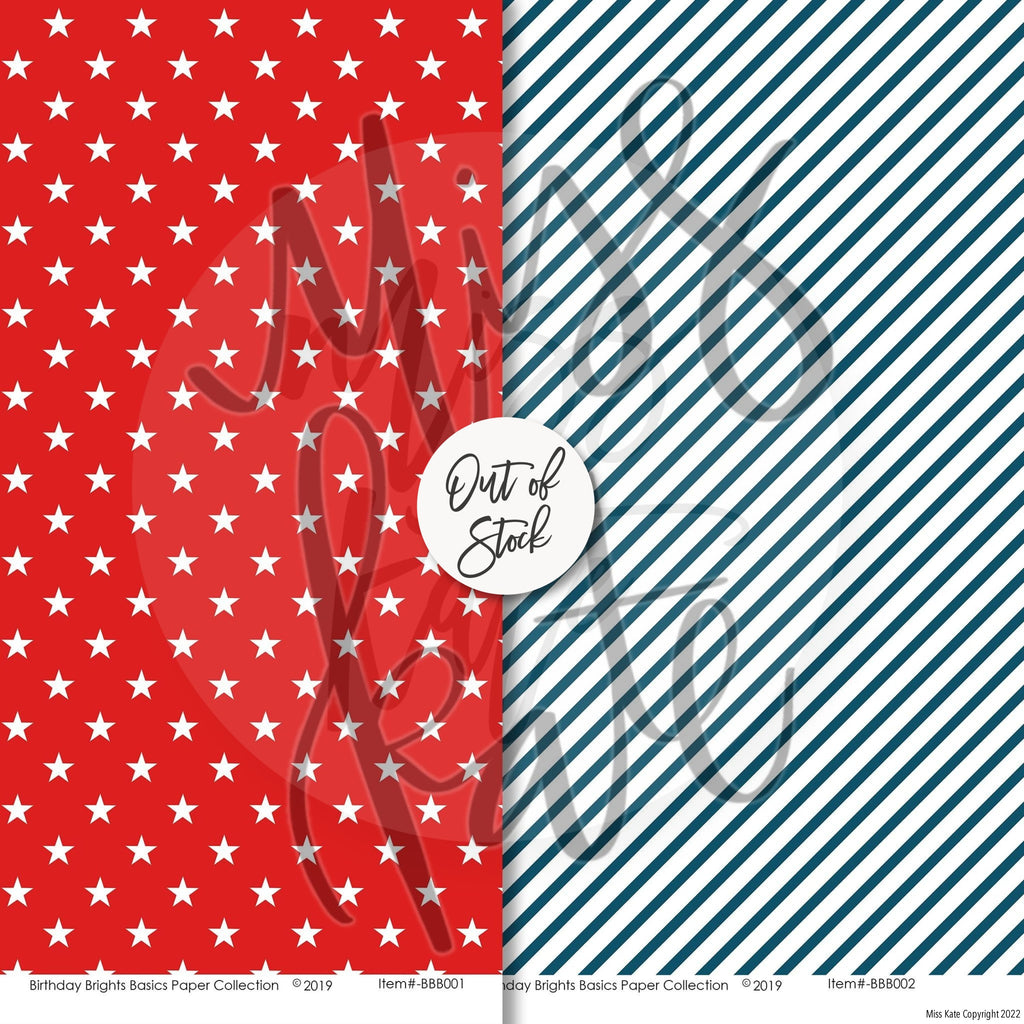 The Birthday Brights Basics Paper Pack features designs include polka dots, plaid, stripes.