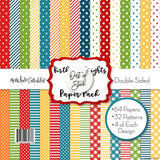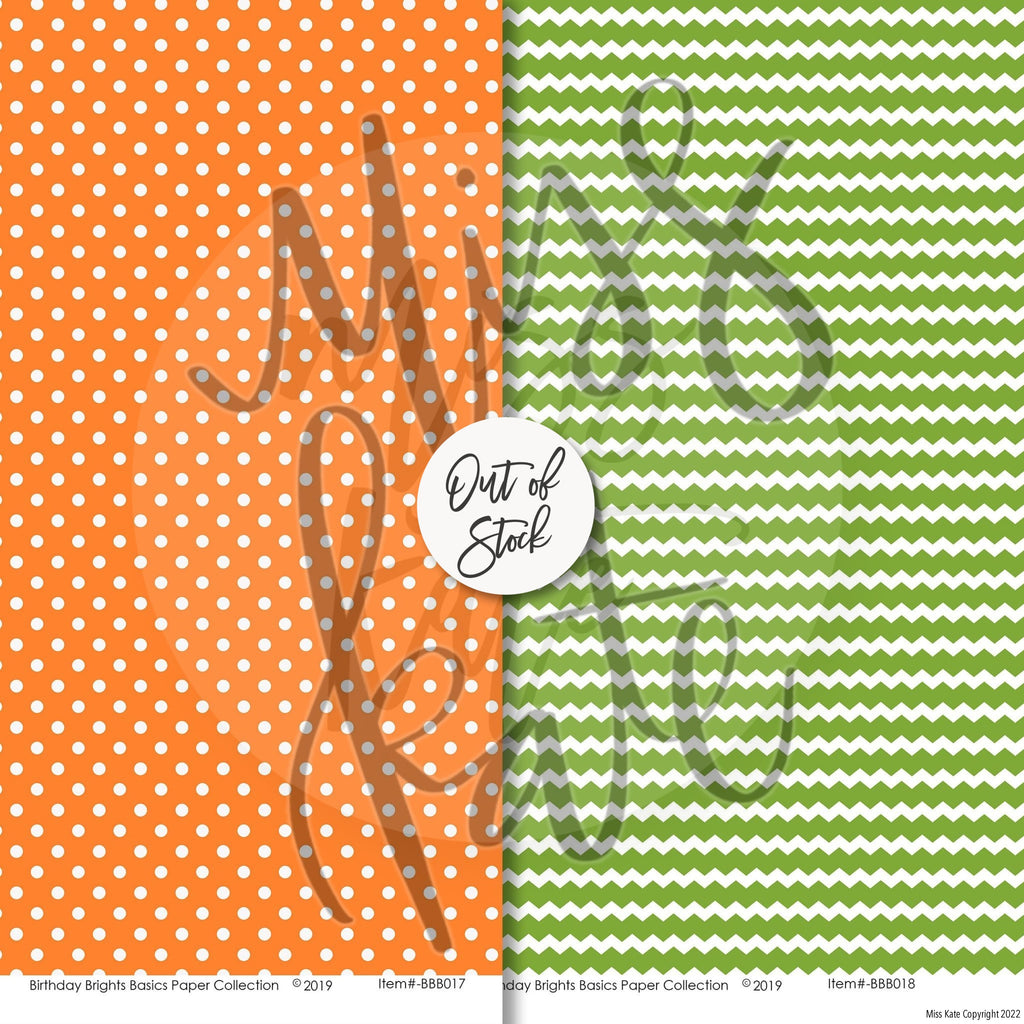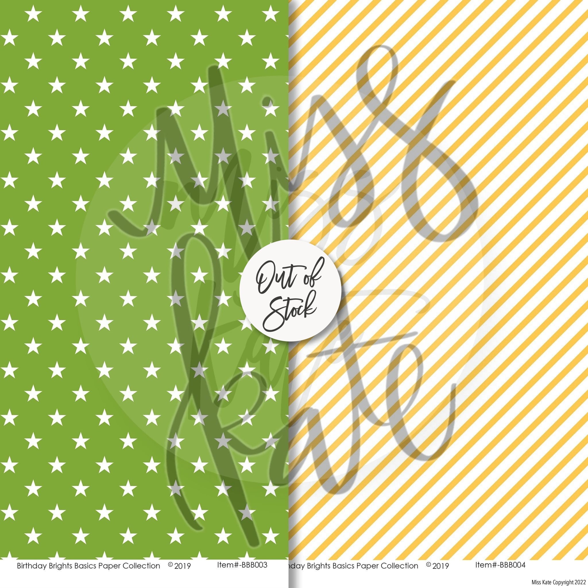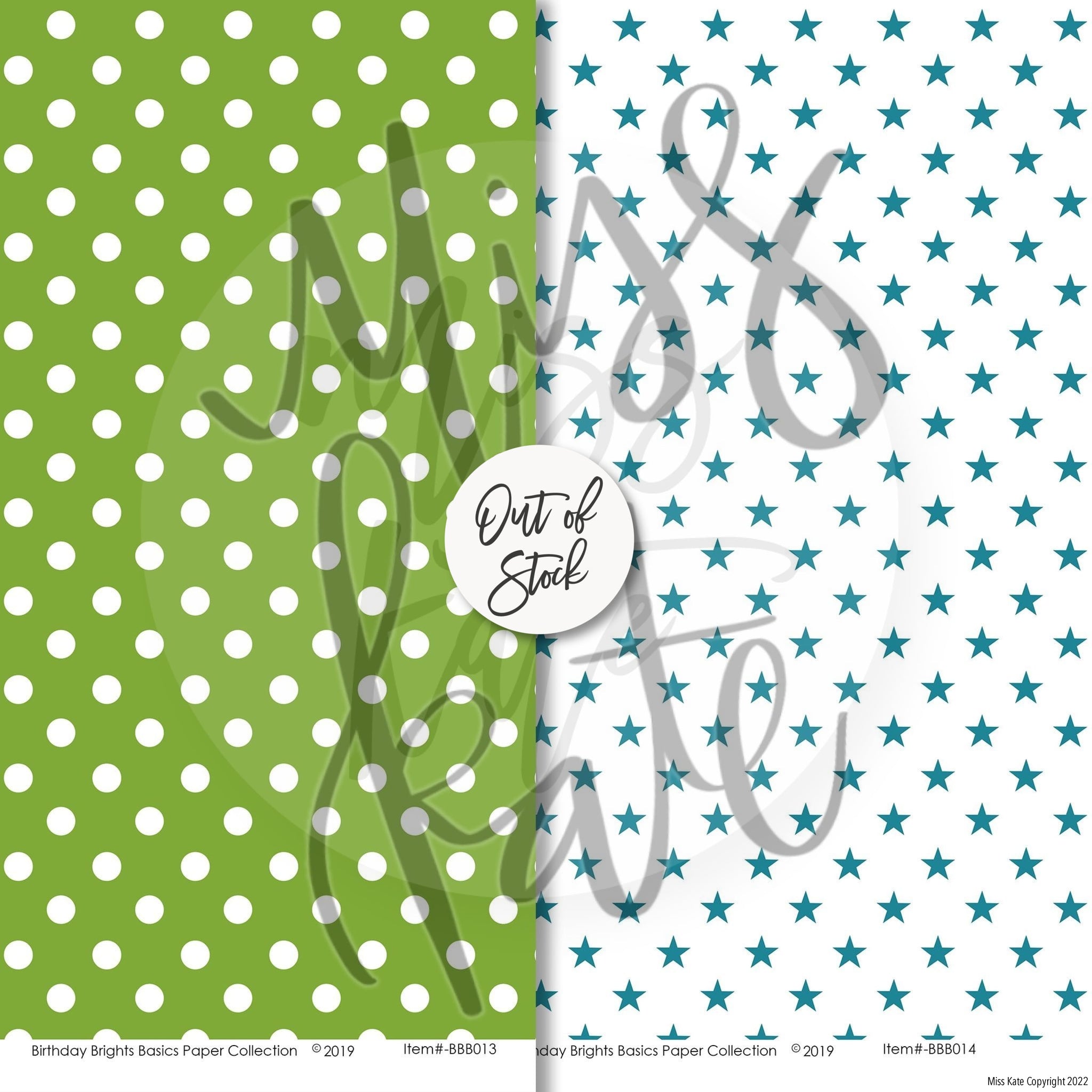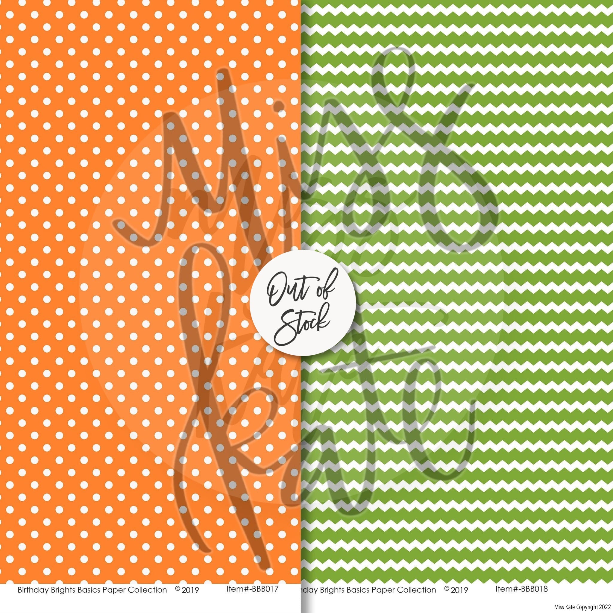 The Birthday Brights Basics Paper Pack features designs include polka dots, plaid, stripes.
