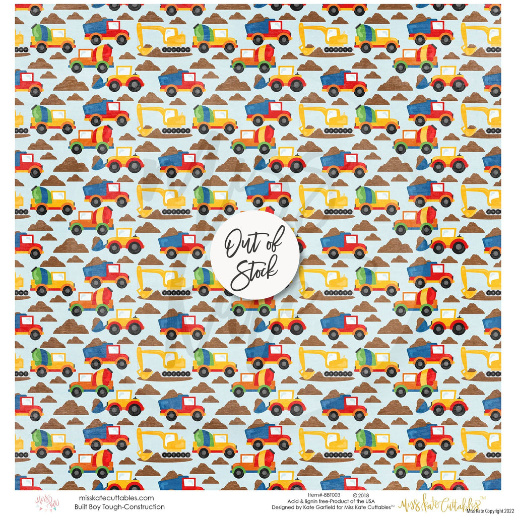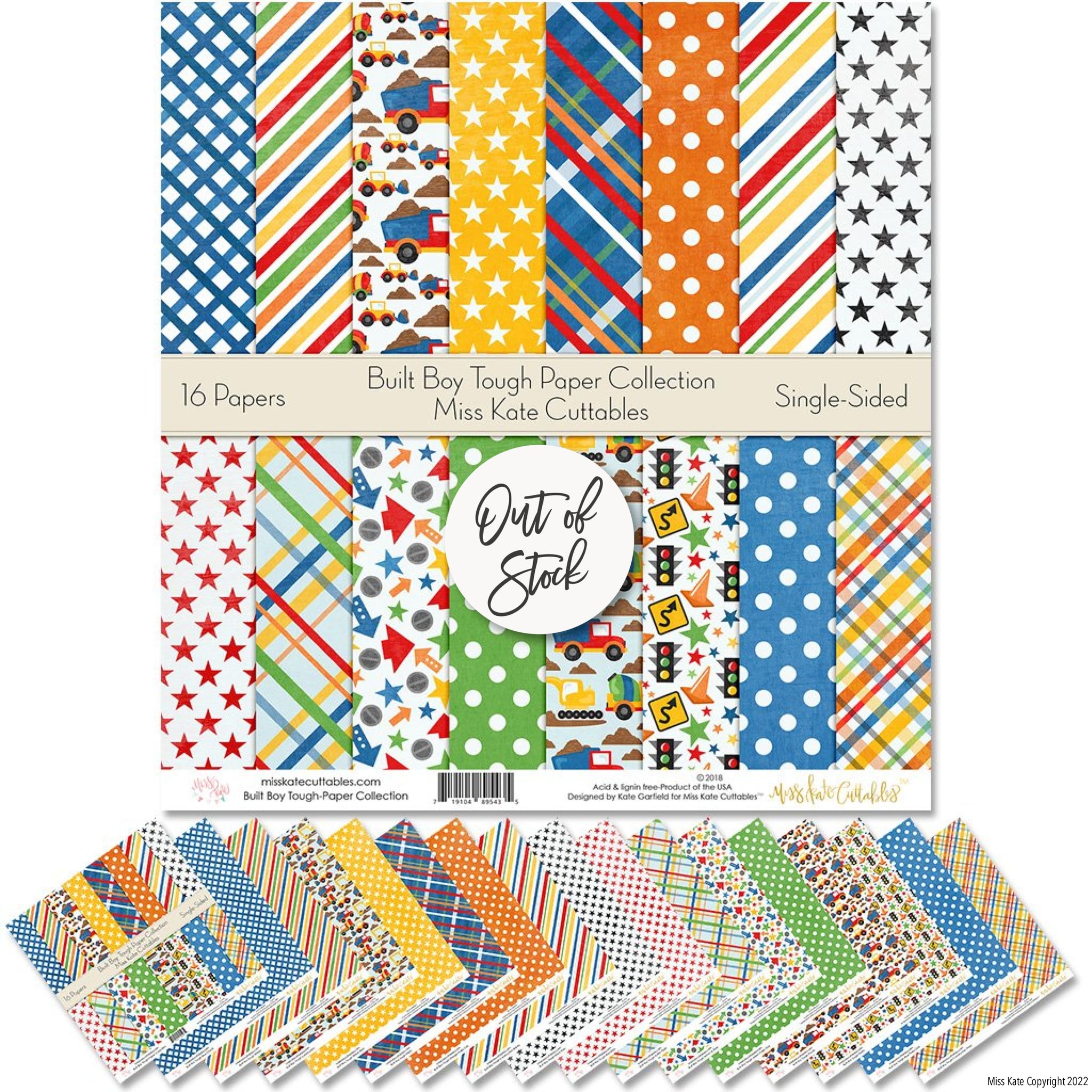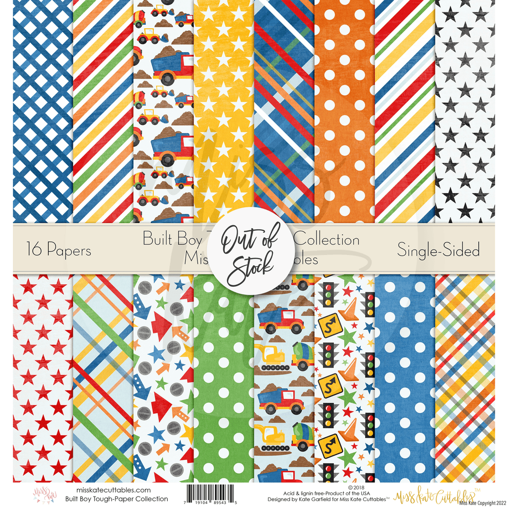 The Built Boy Tough paper pack has a wide variety of Patterns including Polka Dots, Stripes, Plaid, Check, Stars, Dump Truck, Bulldozer, Excavator, Dirt, Stop Lights, Traffic Signs and Traffic Cones. Kids Play Time Construction Theme Playtime