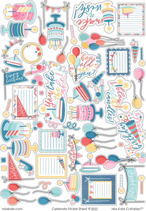 Celebrate Stickers - have a wide variety of designs, including birthday titles, balloons, cakes, candles, presents, gifts, party hats, streamers, confetti, number candles, stars, swirls, sparkles, cupcakes, banners, journaling tags, and more!