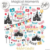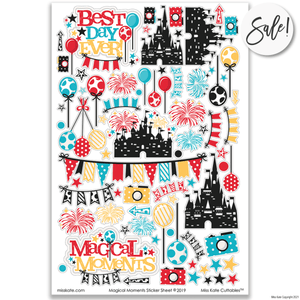 The Magical Moments Sticker Sheet has a variety of shapes: "Best Day Ever" "Magical Moments" Titles, Camera, Balloons, Fireworks, Banners, Arrows, Castle, Stars