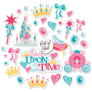 The Once Upon a Time Die Cuts has a castle, crowns, jewels, hearts, wands, glass slipper, title and bows.