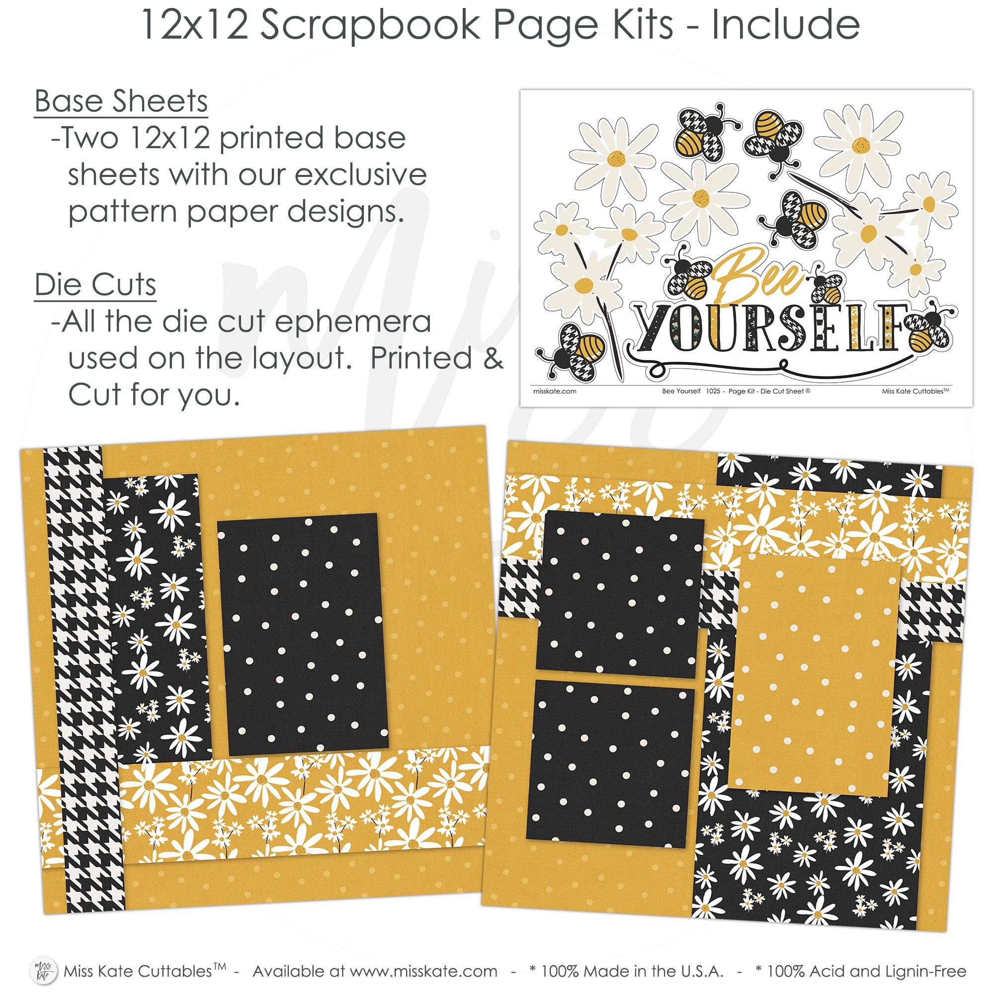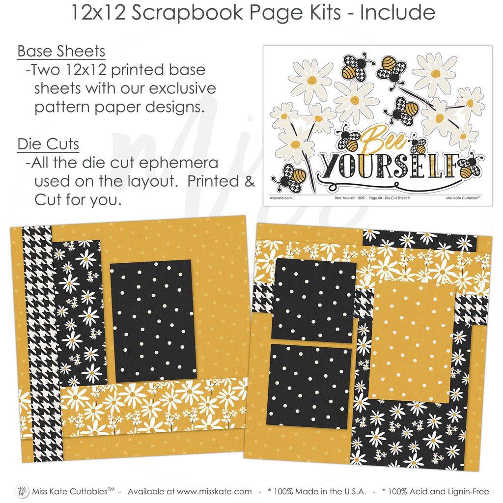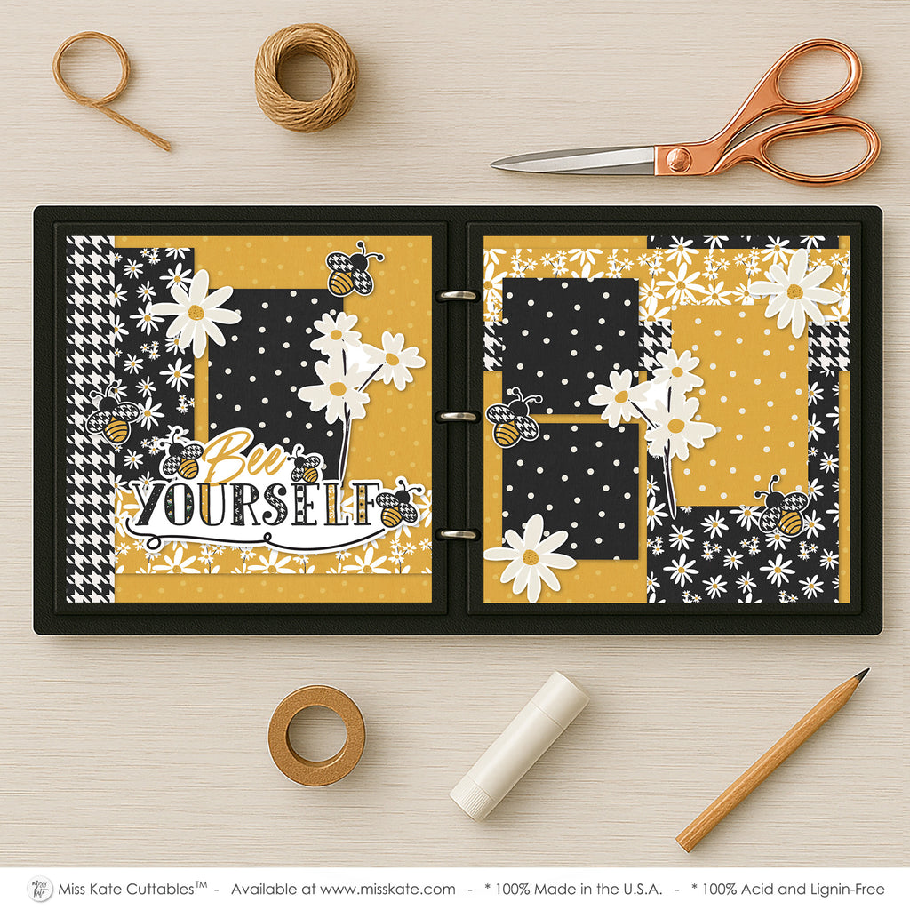 This scrapbook layout titled “Bee Yourself” is bright, cheerful, and full of uplifting charm. The design features a fresh color palette of golden yellow, black, and white, with playful polka dots, bold houndstooth patterns, and daisy prints that bring a mix of modern flair and natural beauty. Sweet daisies with golden centers are scattered throughout the pages, paired with whimsical bees buzzing around to tie the theme together. The large title, “Bee Yourself,” stands out beautifully with its mix of bold and script fonts, accented by tiny bees for extra personality. The photo mats provide ample space for favorite pictures, framed by fun patterns and floral details. With its joyful theme and stylish design, this layout is perfect for capturing moments of happiness, positivity, and self-expression.