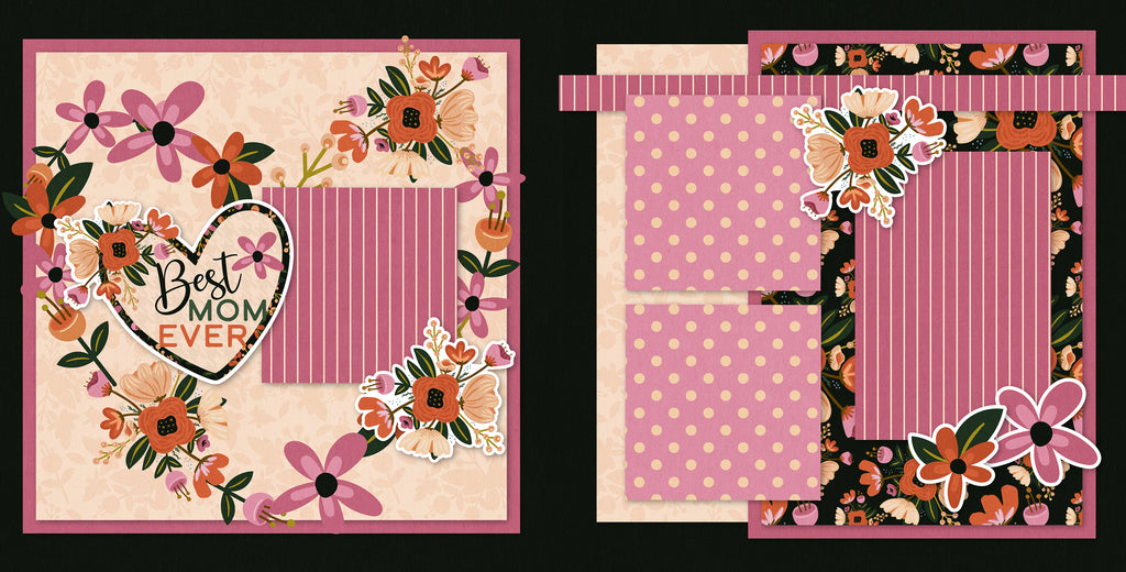 This warm and elegant scrapbook layout features a rich floral theme with shades of pink, coral, cream, and deep green. The left page highlights a heart-shaped “Best Mom Ever” title surrounded by soft, hand-drawn flowers, while the right page balances layered photo mats in coordinating polka dots, stripes, and bold floral prints. Delicate embellishment clusters and a soft vintage-style background give the design a heartfelt, feminine feel—perfect for celebrating special memories with mom.