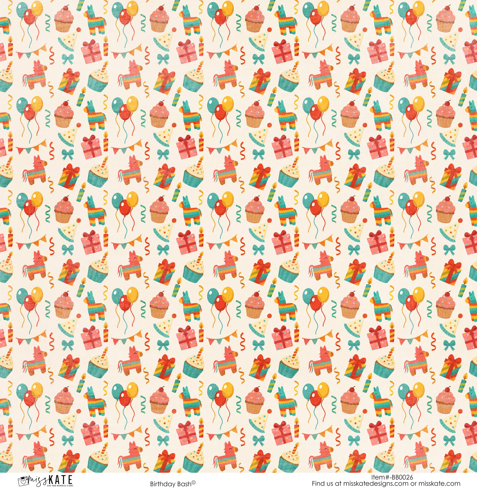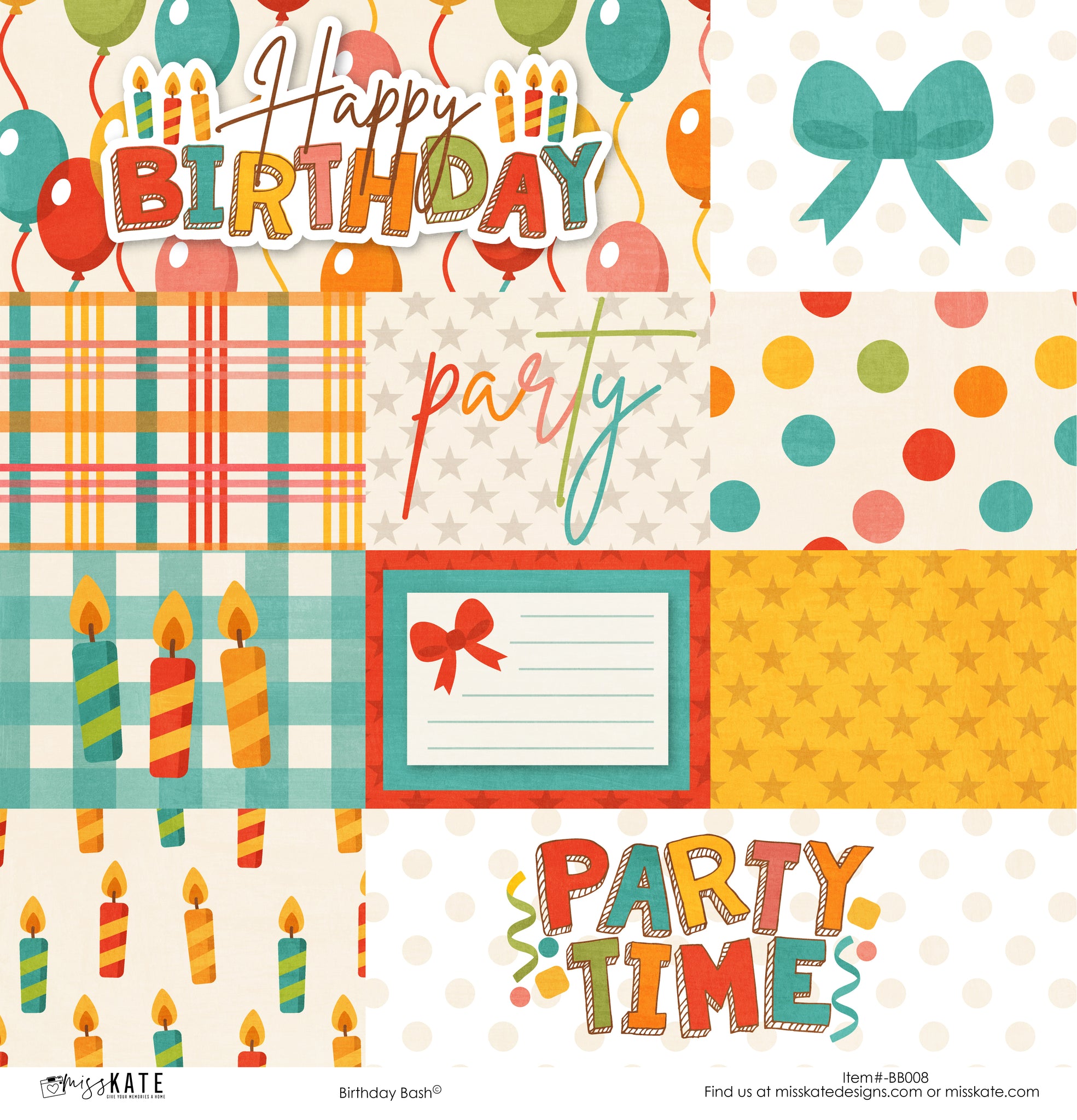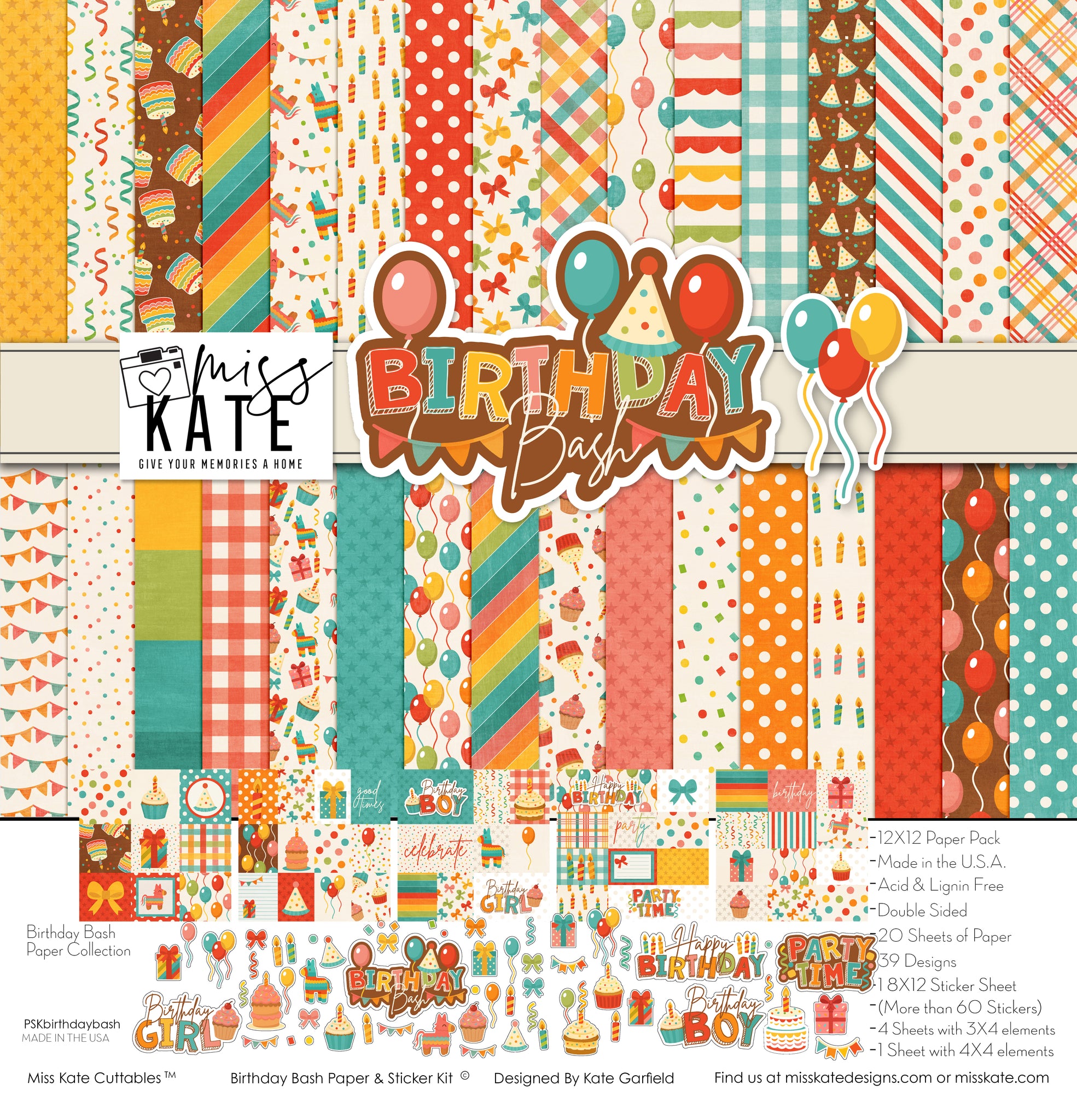 This lively “Birthday Bash” paper collection bursts with cheerful color and festive celebration. The cover sheet showcases a vibrant mix of patterned papers in oranges, yellows, aquas, pinks, and greens, featuring balloons, candles, cakes, confetti, stripes, plaids, and playful polka dots. Across the center, a bold “Birthday Bash” title—decorated with balloons and a slice of cake—sets a joyful tone. Below, an array of coordinating stickers and die-cut elements highlights everything you’d need for birthday crafting: cupcakes, presents, banners, party hats, numbers, bows, and themed phrases for both boys and girls. With 20 double-sided sheets and more than 60 stickers, this kit offers a fun, cohesive palette perfect for scrapbooking birthday parties, making cards, or crafting party decorations. The whole set feels bright, happy, and ready to celebrate life’s sweetest moments.