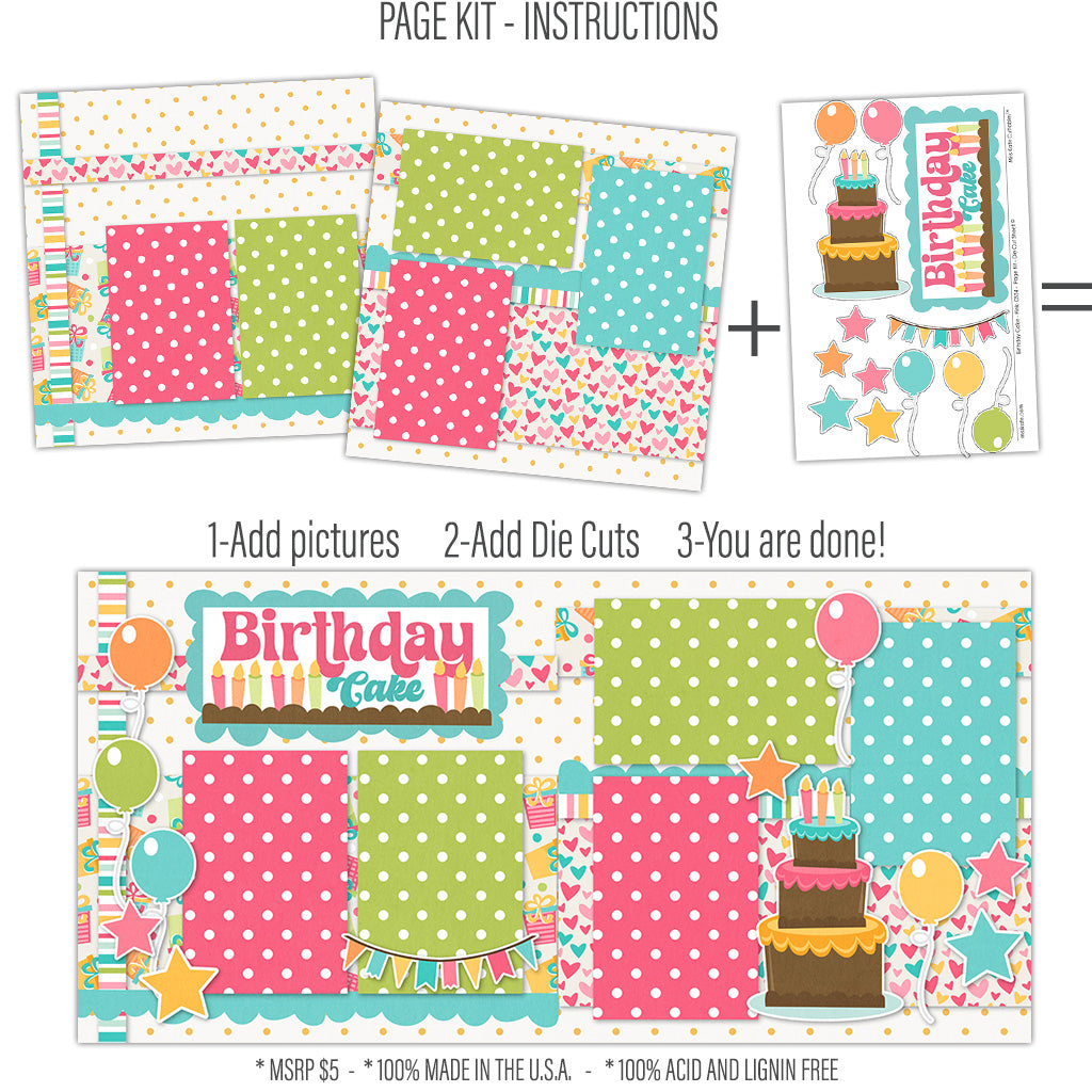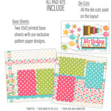 Die Cuts: All the die cuts you see on our layout picture, all cut out for you and ready to embellish your page kit!