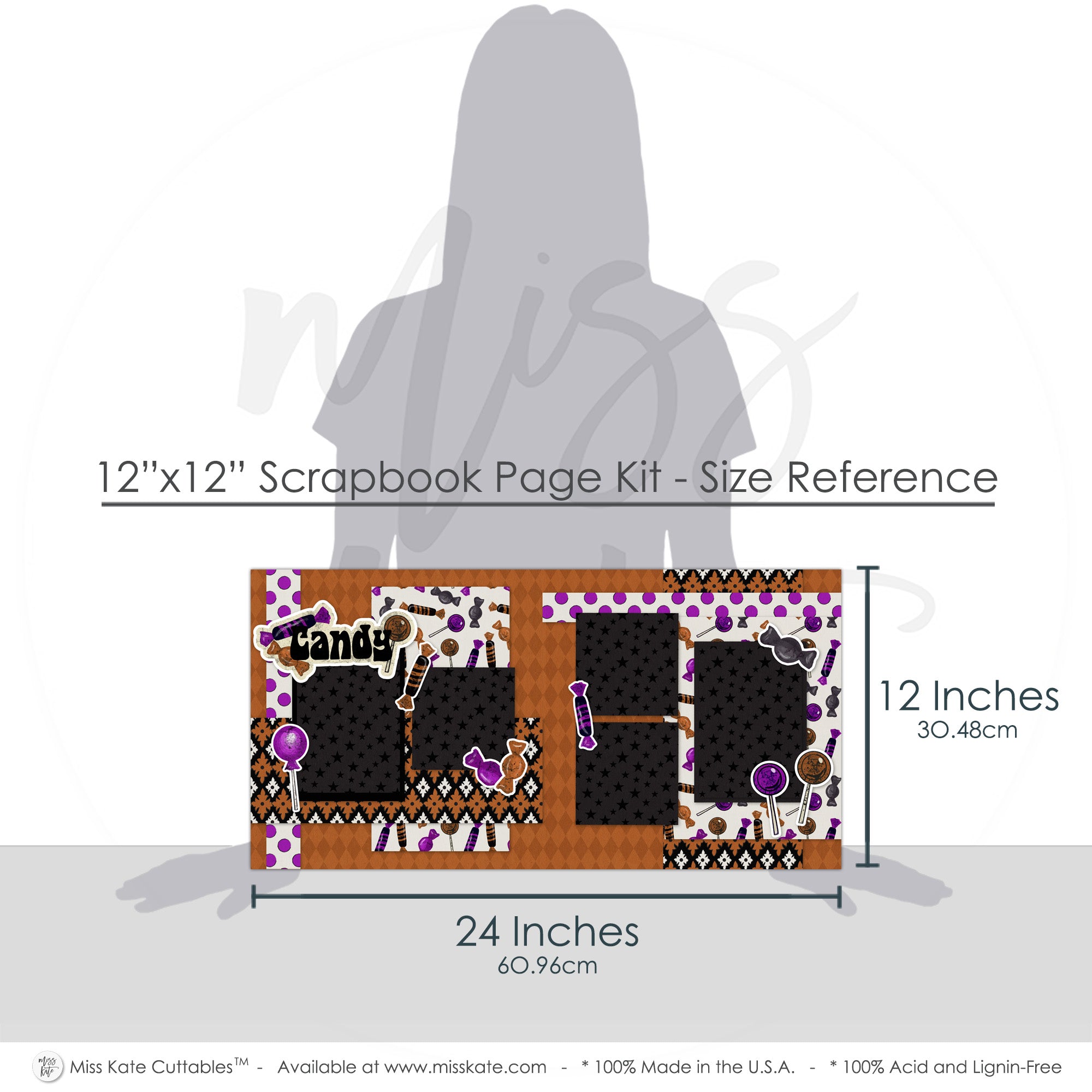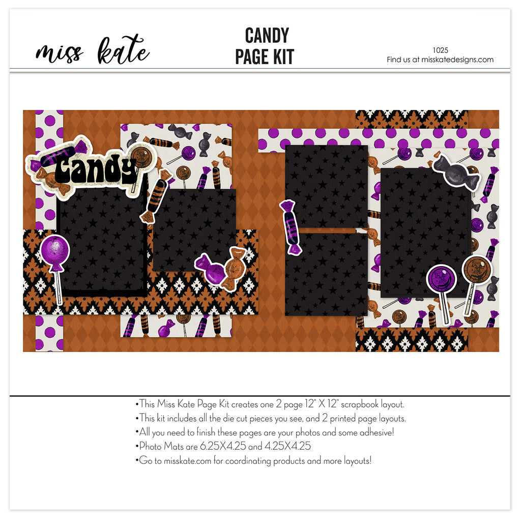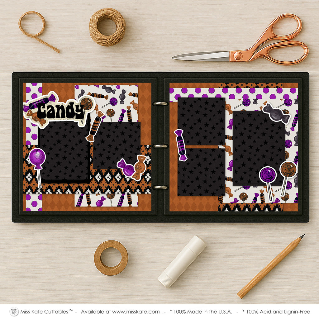 This scrapbook layout titled “Candy” bursts with playful Halloween sweetness, featuring a bold mix of orange, black, and pops of bright purple. The background patterns include diamond prints, polka dots, and star-filled mats that create a fun, festive backdrop for your photos. Scattered throughout are colorful candy embellishments—wrapped sweets, striped candy pieces, and round lollipops—that bring a whimsical, sugary vibe to the design. The large “Candy” title is highlighted with treats, making it the perfect focal point. With its vibrant colors and fun mix of patterns, this layout is ideal for capturing trick-or-treating adventures, candy hauls, or any festive Halloween memories.