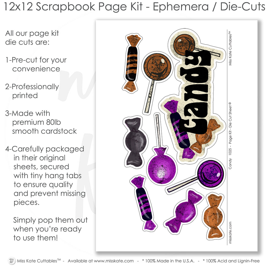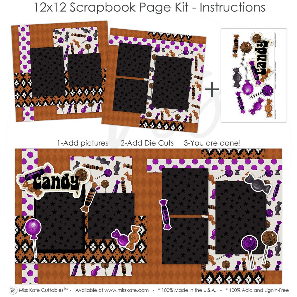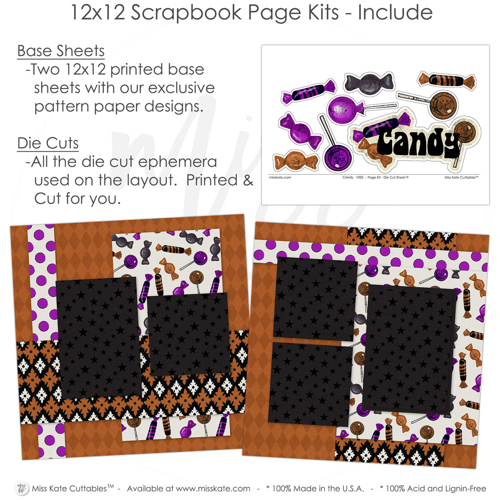 This scrapbook layout titled “Candy” bursts with playful Halloween sweetness, featuring a bold mix of orange, black, and pops of bright purple. The background patterns include diamond prints, polka dots, and star-filled mats that create a fun, festive backdrop for your photos. Scattered throughout are colorful candy embellishments—wrapped sweets, striped candy pieces, and round lollipops—that bring a whimsical, sugary vibe to the design. The large “Candy” title is highlighted with treats, making it the perfect focal point. With its vibrant colors and fun mix of patterns, this layout is ideal for capturing trick-or-treating adventures, candy hauls, or any festive Halloween memories.