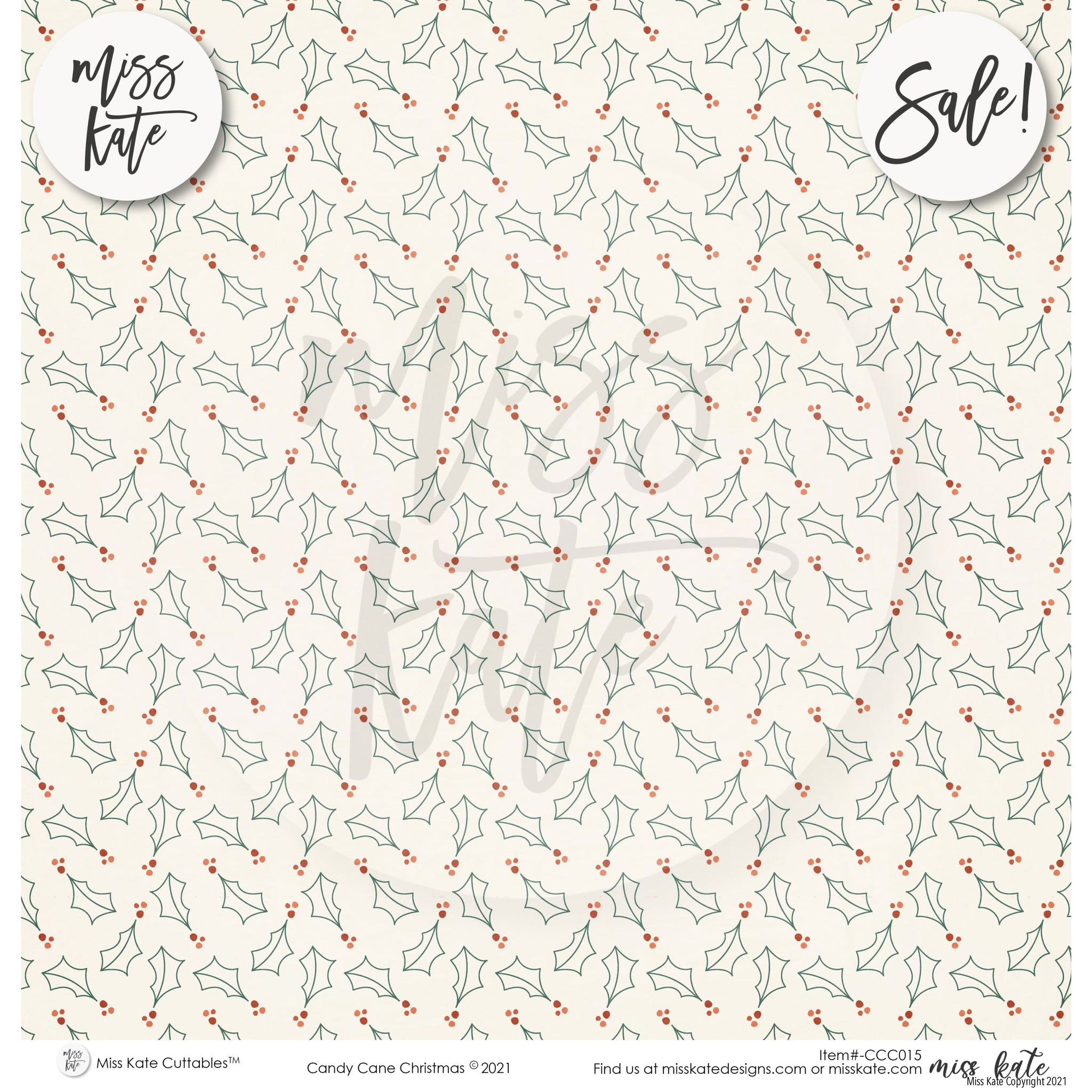 The Candy Cane Christmas Paper has a wide variety of patterns including Pine Boughs, Polka Dots, Flowers, Plaid, Snowmen, Stripes, Snowflakes, Holly Berry, Mint, Bows, Christmas Trees, Candy Canes, 4x4 & 4x6 Elements, Red, Green, and Pink.