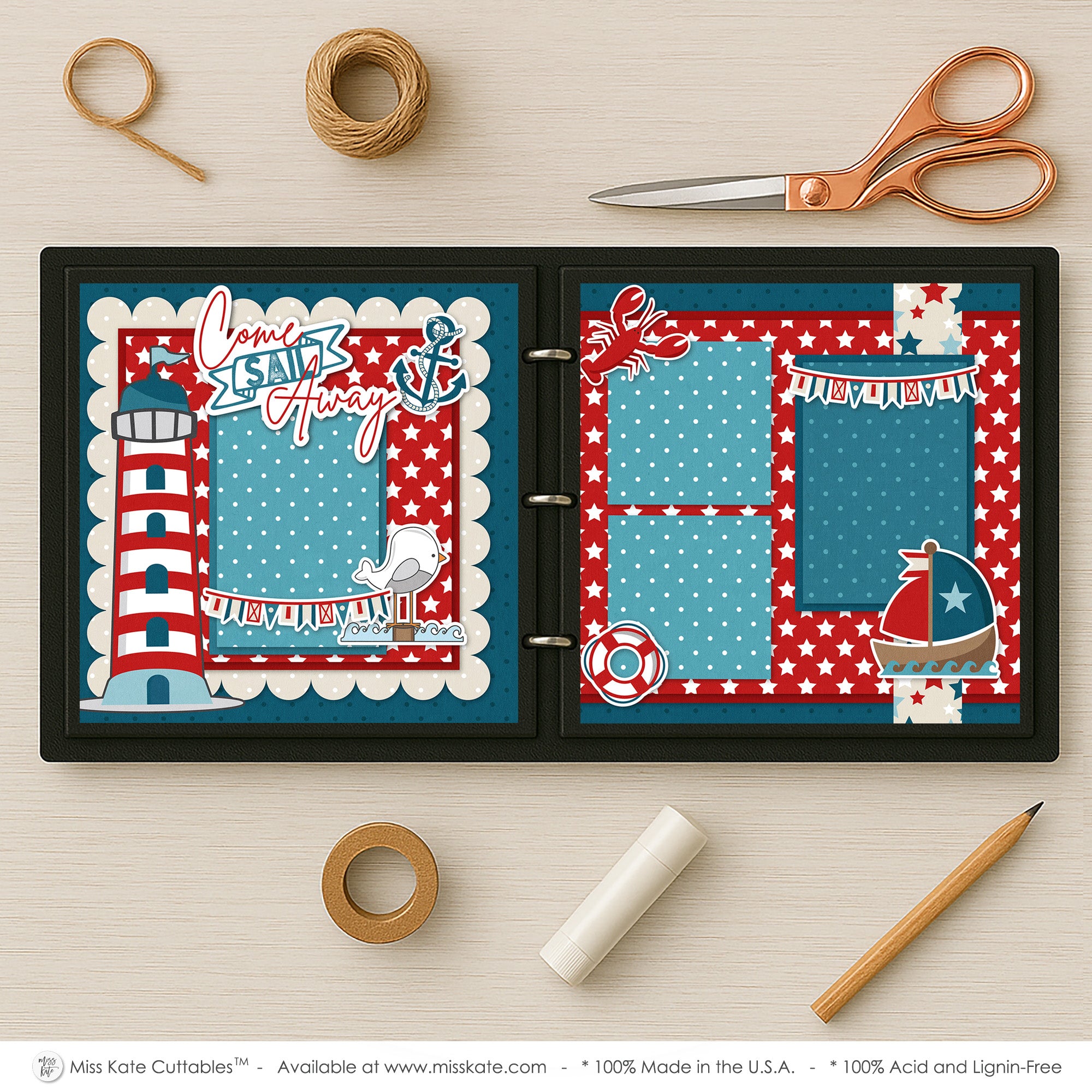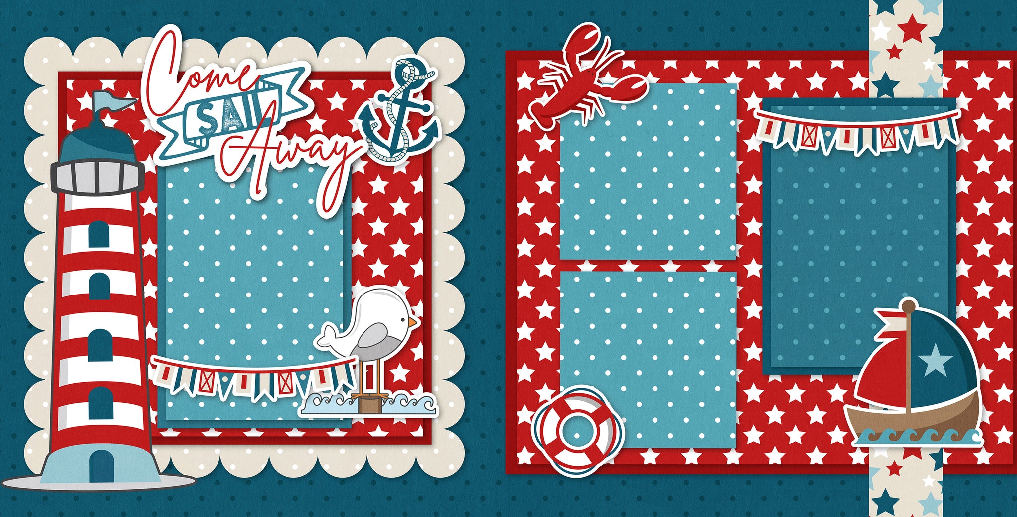Description:Set sail on a wave of summer memories with this patriotic nautical-themed double-page scrapbook layout! Featuring bold red, white, and blue tones with playful star and polka dot patterns, this layout is anchored by charming embellishments like a striped lighthouse, sailboat, anchor, seagull, life preserver, and a festive lobster. The title “Come Sail Away” adds a fun, adventurous flair, perfect for beach days, boat rides, coastal vacations, or 4th of July outings. |
