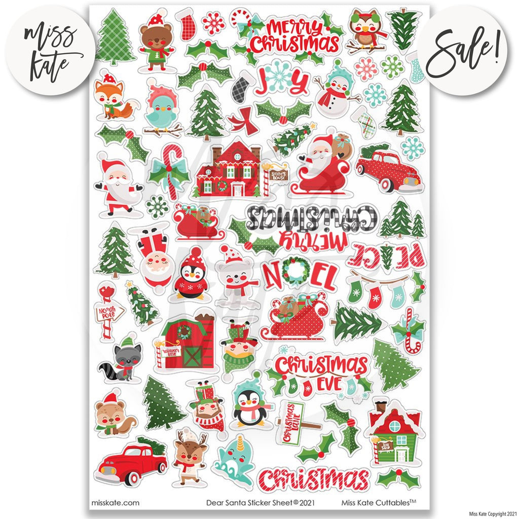 The Dear Santa Paper Sticker Sheet- The Dear Santa Sticker Sheet has a wide variety of designs, including Holly Berry, Stockings, "Merry Christmas", "Joy", "NOEL", "Christmas Eve" Titles, Owl wearing Ear Muffs, Christmas Trees, Blue Bird Wearing Beanie, Candy Canes, Santa Claus, Sleigh, Racoon with Hat, Barn, Penguin with Sweaters, Fox, Boy, Girl, Snowflakes, Bows, Reindeer, Snowman, House, Narwhal, Bear.