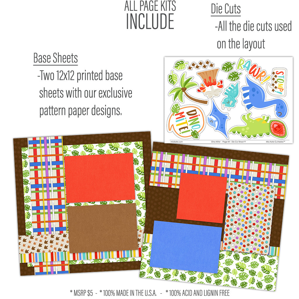 About our Page Kits Our Page Kits include proprietary Miss Kate Pattern Paper and Miss Kate Die Cuts. The cover page features full-color high-resolution pictures of the assembled layouts. Die cuts are left in the sheet and ready for you to easily pop out, this allows you to see them all spread out and helps prevent any accidental loss. These page kits are adorable, easy to do, and at such a great price! We love our Page Kits and think you will too! |