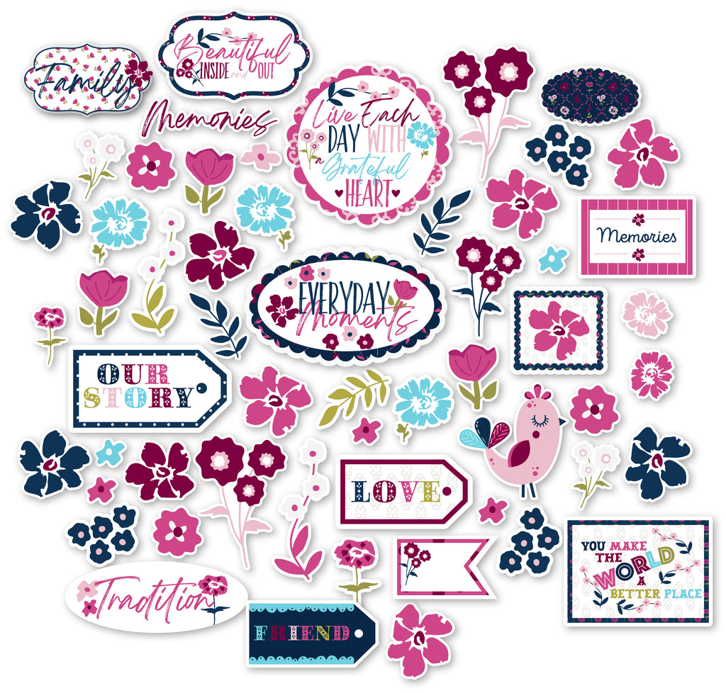 The "Everyday Moments" die-cut from Miss Kate Designs — is a vibrant, heartfelt collection of paper embellishments perfect for memory keeping, scrapbooking, journaling, or card making. Collection Overview:A curated mix of floral icons, sentiment tags, and positive quotes designed in a coordinated color scheme of navy blue, magenta, raspberry pink, rose, soft teal, and crisp white. Featured Sentiments: