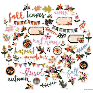 The Fall Floral Die Cuts have a wide variety of designs, including "Fall" "Leaves" "Autumn" "Harvest" "Pumpkins" "Blessed" Titles, Maple Leaf, Tags, Flowers