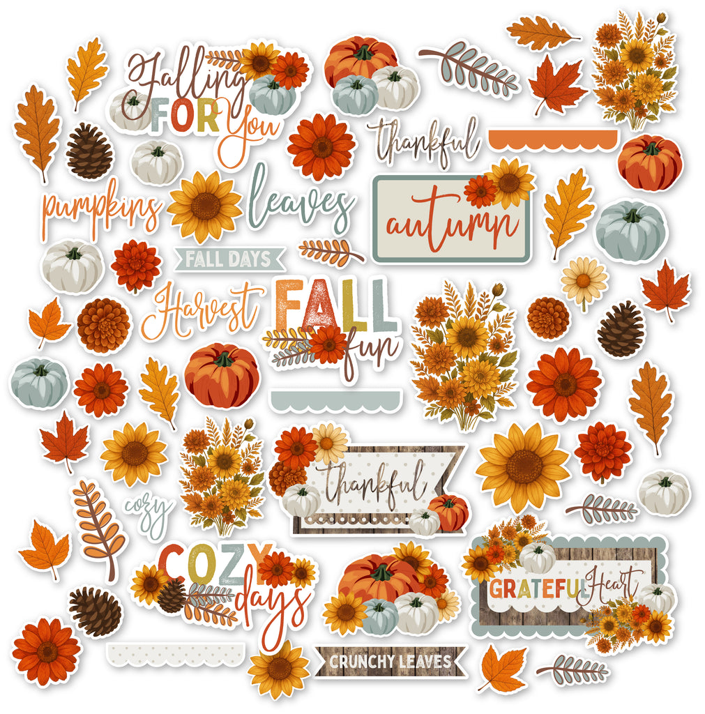 Collection Overview:This “Fall Fun” die-cut set perfectly captures the warmth and coziness of autumn through a mix of cheerful illustrations and inspiring seasonal sentiments. The collection includes pumpkins in shades of orange and soft blue, golden sunflowers, rust-colored daisies, pinecones, acorns, and vibrant fall leaves. Phrases like “Falling for You,” “Harvest,” “Cozy Days,” “Thankful,” and “Grateful Heart” add charm and heartwarming emotion, ideal for enhancing scrapbook pages or handmade cards. The color palette blends burnt orange, mustard yellow, cream, and muted teal tones, evoking the beauty of crisp fall days and cozy gatherings. Each element is designed with a soft drop shadow, giving it a dimensional, layered look that makes every piece feel lively and full of texture. The set radiates rustic elegance and joyful autumn spirit, perfect for documenting treasured fall memories.Perfect For: