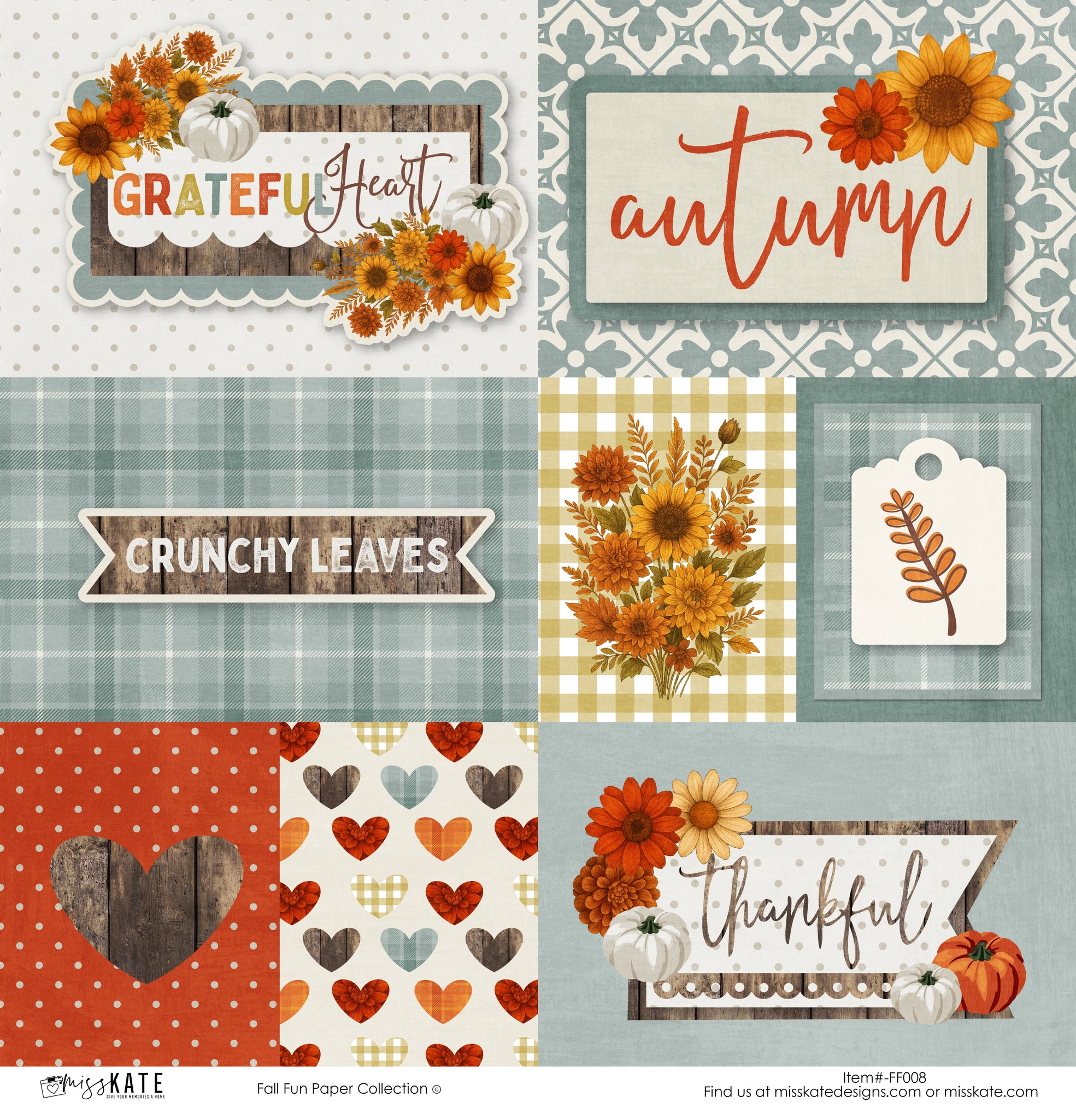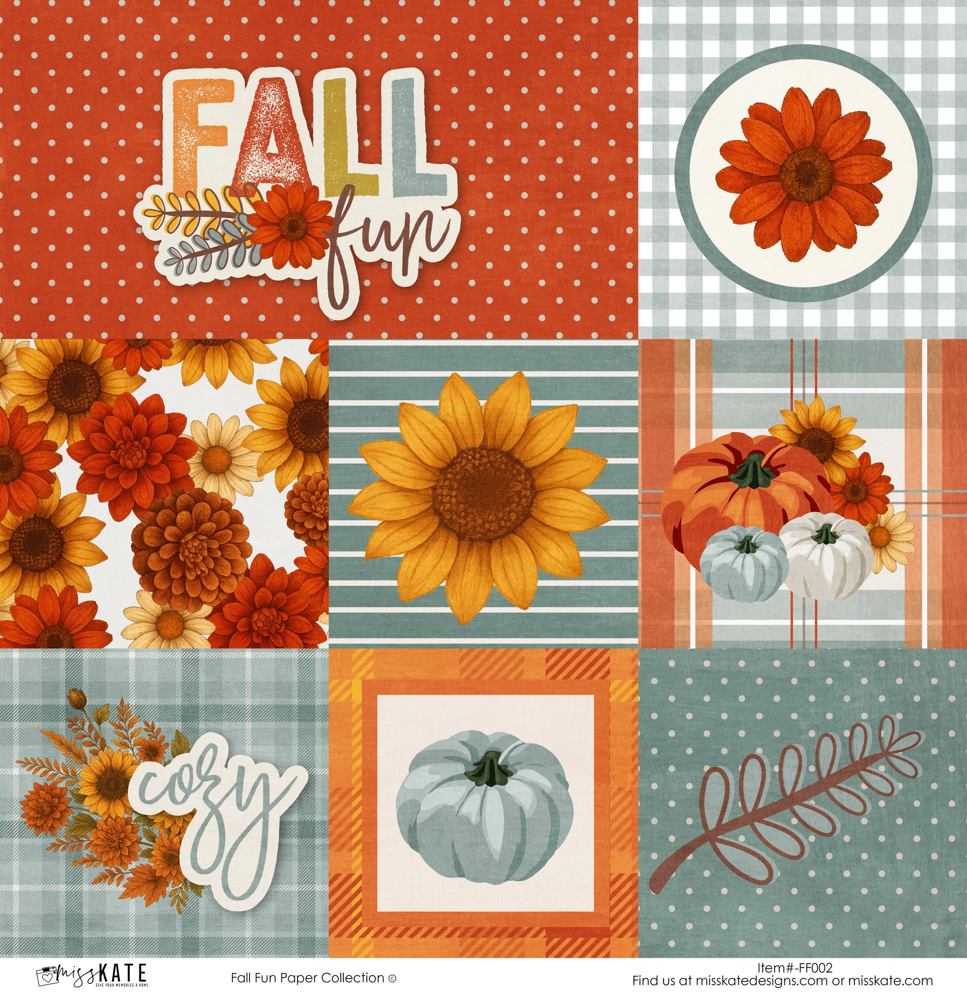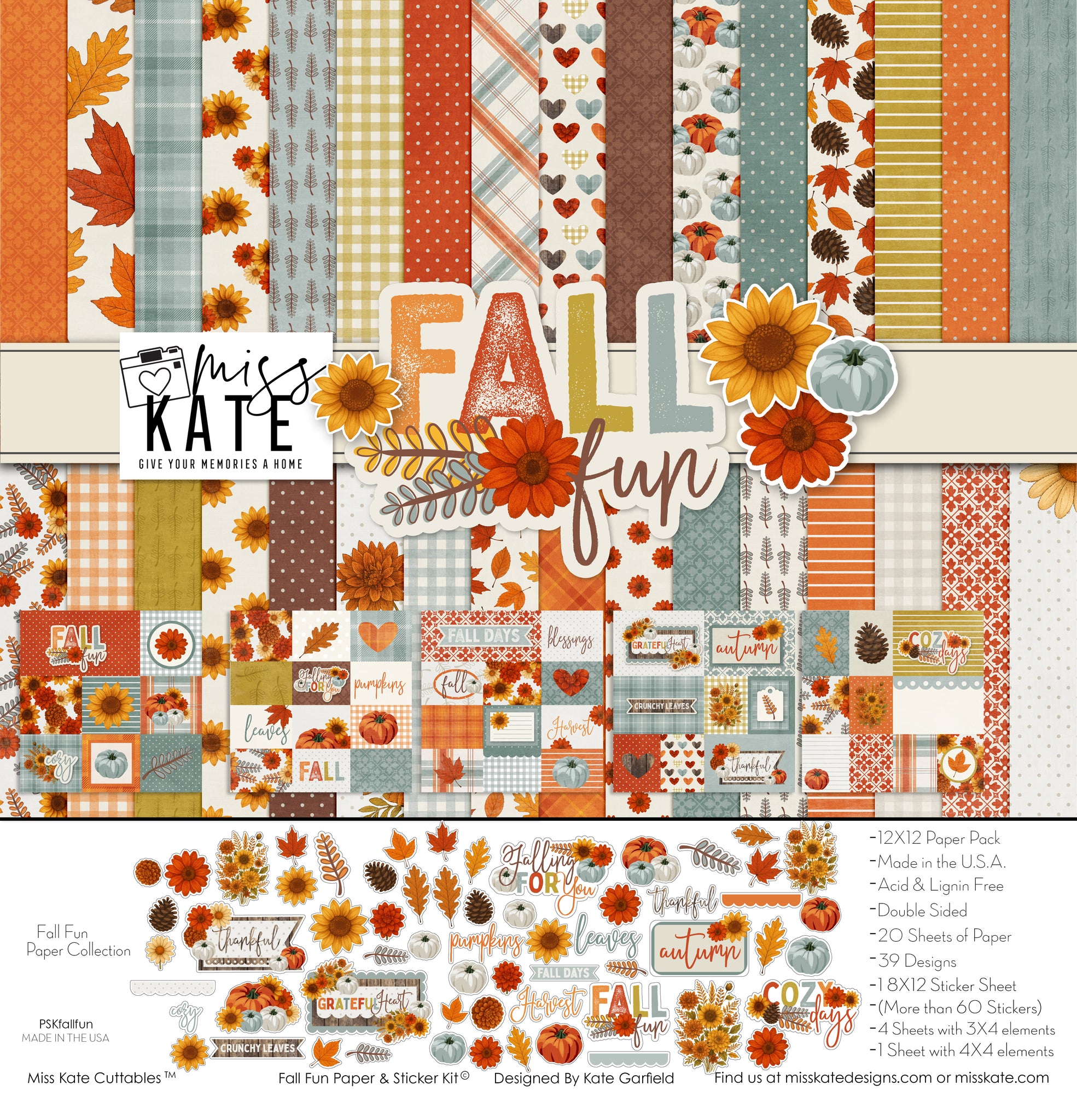 This “Fall Fun” paper collection by Miss Kate captures the cozy, colorful essence of autumn through a warm palette of burnt orange, mustard yellow, soft teal, cream, and chocolate brown. The pack features 12x12 patterned papers with charming fall motifs including leaves, pumpkins, plaids, hearts, and gingham designs. Accented by playful textures and layered patterns, the collection evokes feelings of crisp autumn days and cozy gatherings. The coordinating stickers and die-cut elements include cheerful phrases like “Fall Fun,” “Grateful Heart,” and “Crunchy Leaves,” along with pumpkins, sunflowers, and acorns that bring each page to life. Perfect for scrapbooking, card making, or seasonal crafts, this kit beautifully blends rustic charm with modern design, creating a heartwarming celebration of everything that makes fall special.
