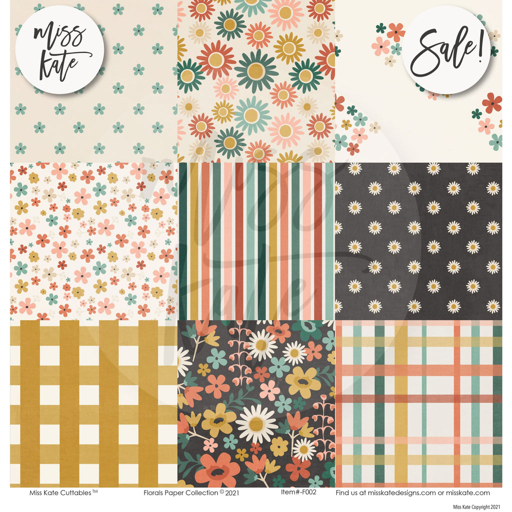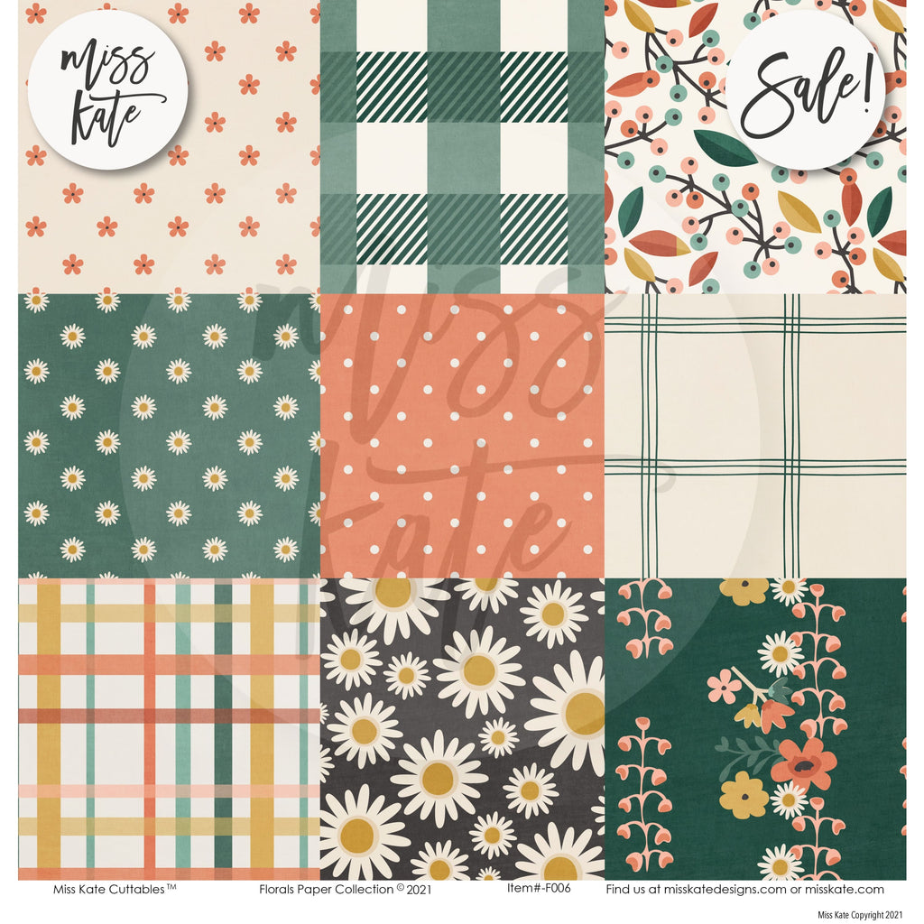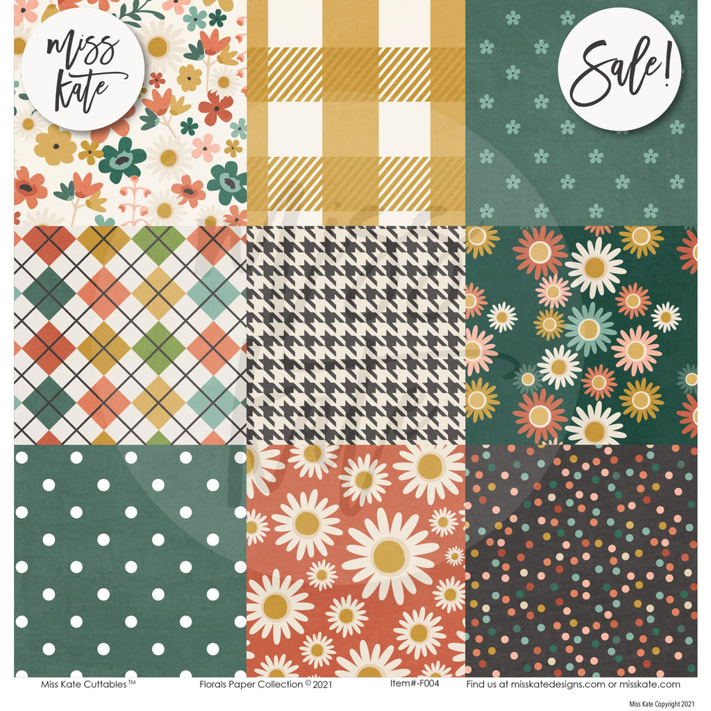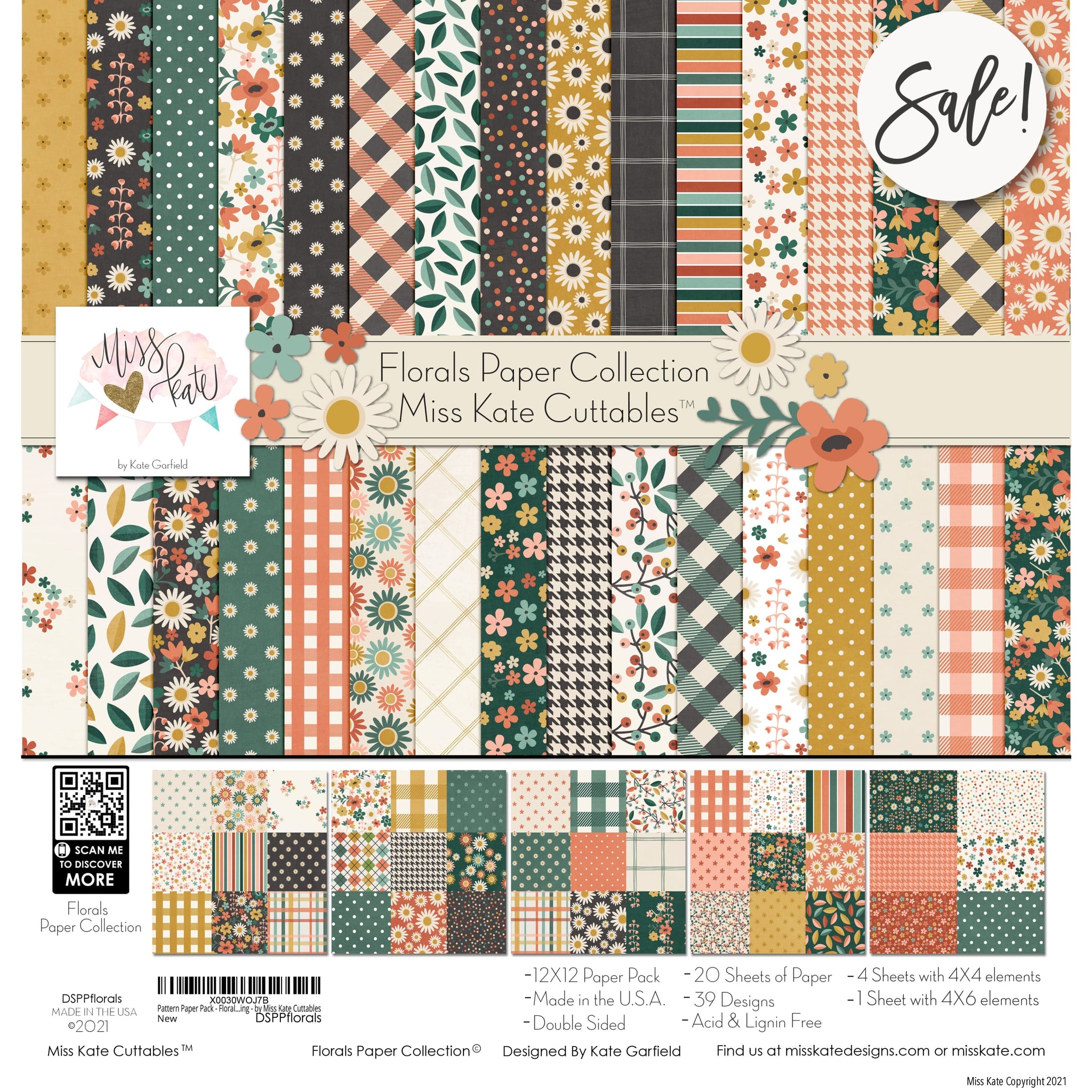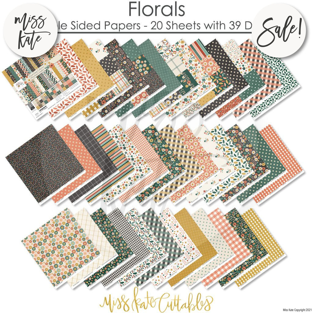 The Double Sided Florals Paper Pack has a wide variety of designs, including Flowers, Daisies, Polka Dots, Buffalo Check, Leaves, Plaid, Stripes, Hounds Tooth, Berries. Includes 4x4 & 4x6 Elements.