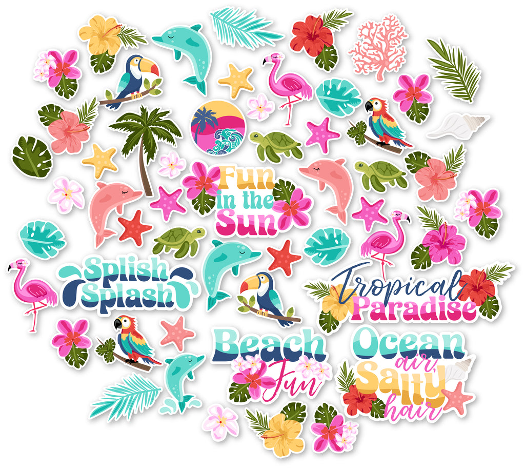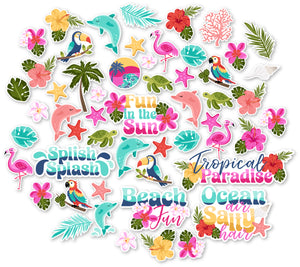 Collection Overview:This die cut set includes a variety of vibrant paper embellishments featuring dolphins, flamingos, sea turtles, toucans, palm trees, hibiscus flowers, starfish, coral, tropical leaves, seashells, and playful summer icons. There are also several cheerful phrases in stylish fonts, such as: - Fun in the Sun - Splish Splash -Tropical Paradise -Beach Fun - Ocean Air Salty Hair The die cuts are designed with coordinating bright hues like pink, coral, teal, yellow, and green, and each piece has a soft white shadow outline, perfect for layering on scrapbook pages, cards, or other paper crafts. The collection evokes a fun, sunny, beachy vibe ideal for documenting summer memories, vacations, and tropical adventures. Perfect For: