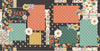 black background with small white floral dots, burnt orange polka dot rectangle, sage green polka dot square, mustard yellow polka dot frame, floral border featuring small multicolor flowers in orange, yellow, and white, striped decorative strip with warm autumn tones.