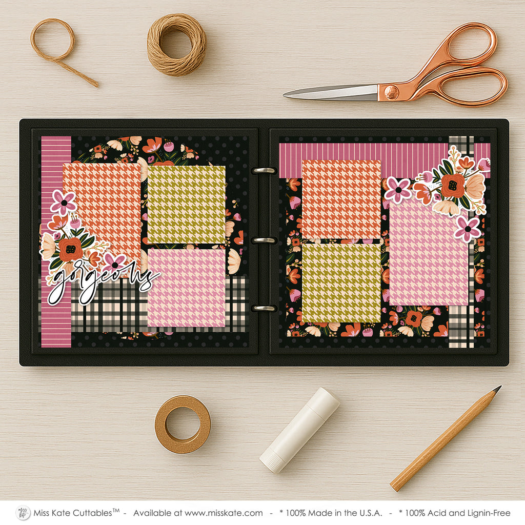 This scrapbook layout features a bold yet elegant design with a dark polka-dot background that creates striking contrast against the warm, patterned photo mats. The composition includes two mirrored pages, each showcasing a mix of coral-orange, olive-green, and blush-pink houndstooth rectangles arranged in balanced clusters for photo placement. Accents of plaid and striped papers add visual rhythm and a cozy, homespun feel, while layered floral embellishments in coordinating shades of peach, pink, and cream bring a lively, feminine touch. On the left page, the word “gorgeous” is beautifully scripted in white and black, anchoring the design with a sense of charm and affirmation. Overall, the spread combines classic patterns with modern flair—perfect for highlighting cherished memories with a fresh, stylish aesthetic.