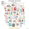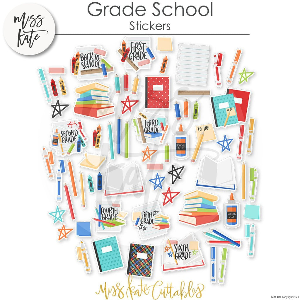 The Grade School Sticker Sheet has a variety of shapes: "Back to School", "First Grade", "Second Grade", "Third Grade", "Fourth Grade", "Fifth Grade", "Sixth Grade" Titles, Crayons, Colored Pencils, Erasers, Stars, Text Books, Books, School Glue, Post-It-Notes, Magic Markers, Rulers, Paper.