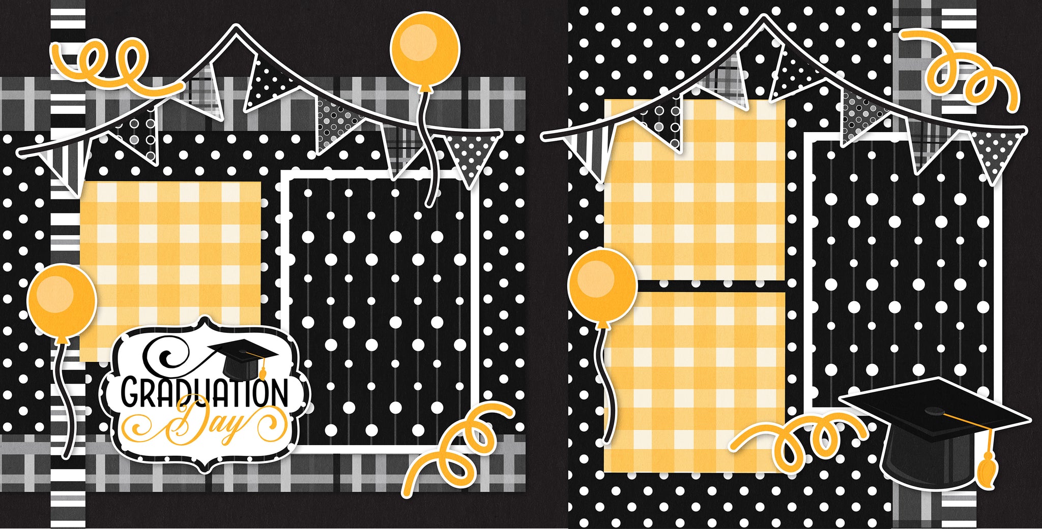 Description:Celebrate a milestone with this bold and festive double-page scrapbook layout, perfect for highlighting the proud moments of graduation day. The design features a striking black, white, and yellow color palette with playful polka dots, classic buffalo plaid, and crisp stripes layered to create visual contrast and celebration flair. Decorative banners, balloons, curly streamers, and a traditional graduation cap add fun dimensional elements. The title “Graduation Day” takes center stage in a stylized label, tying the pages together. With multiple photo mats for capturing cap tosses, speeches, and smiles, this layout is ready for your star graduate’s big day! |