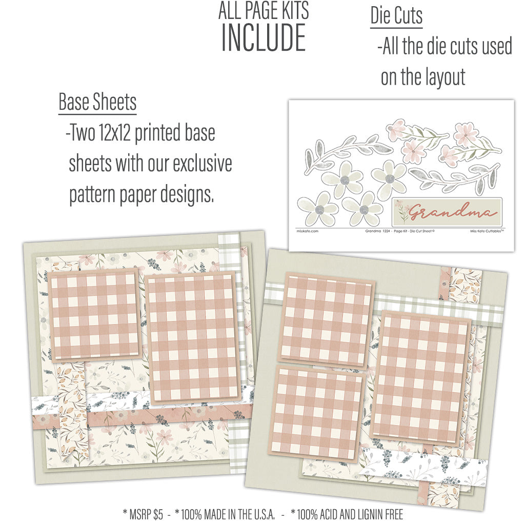 About our Page Kits Our Page Kits include proprietary Miss Kate Pattern Paper and Miss Kate Die Cuts. The cover page features full-color high-resolution pictures of the assembled layouts. Die cuts are left in the sheet and ready for you to easily pop out, this allows you to see them all spread out and helps prevent any accidental loss. These page kits are adorable, easy to do, and at such a great price! We love our Page Kits and think you will too! |