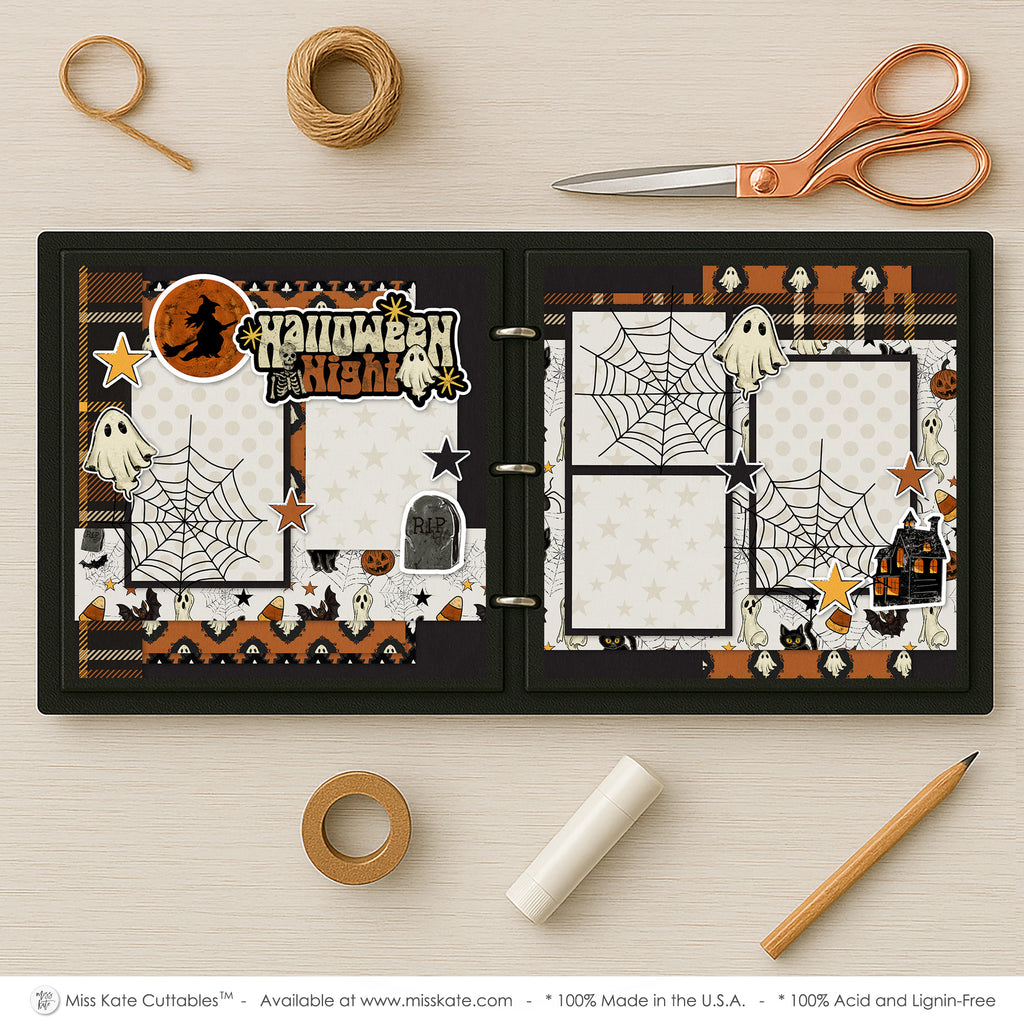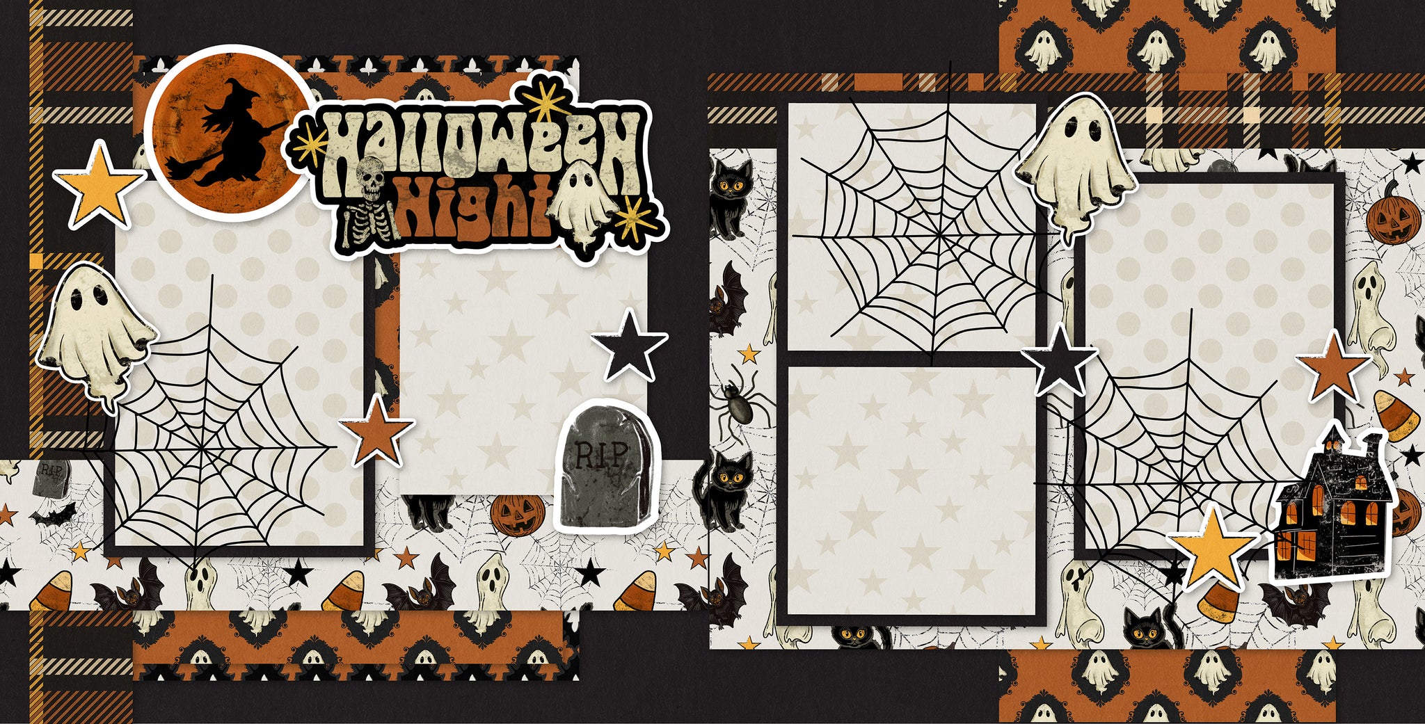 This scrapbook layout titled “Halloween Night” perfectly captures the spooky spirit of October with its haunting details and festive charm. The background combines plaid, polka dots, and starry prints in classic Halloween tones of orange, black, and cream. The bold title is accented with a flying witch silhouette, skeleton, and ghost, setting the eerie mood. Playful embellishments like floating ghosts, black cats with glowing eyes, bats, candy corn, and spiders crawling across webs bring a fun yet spooky atmosphere. Large cobweb designs overlay the photo mats, making them the perfect backdrop for Halloween memories. A tombstone and a haunted house illustration add just the right touch of fright, while scattered stars keep the design whimsical. This layout beautifully balances spooky and playful elements, making it an ideal setting to showcase Halloween night photos and trick-or-treating fun.