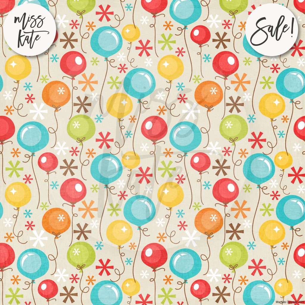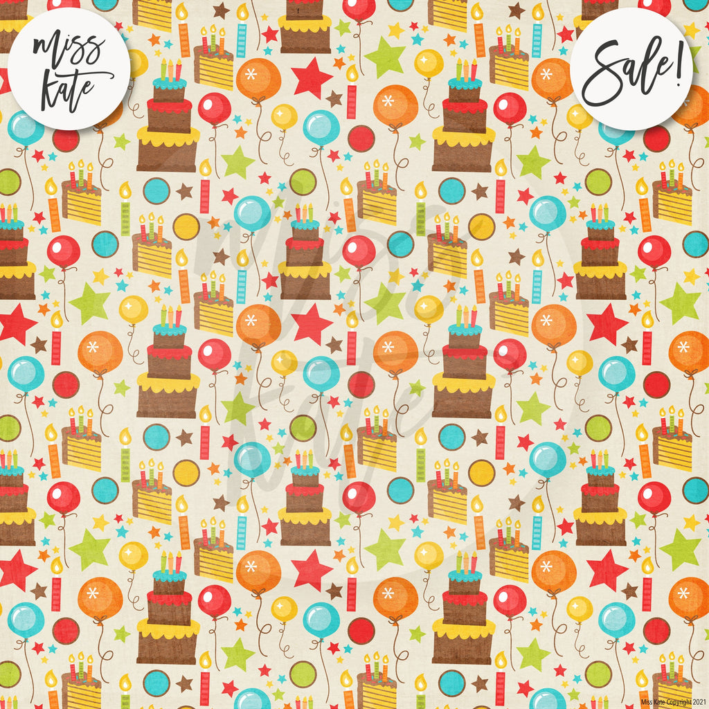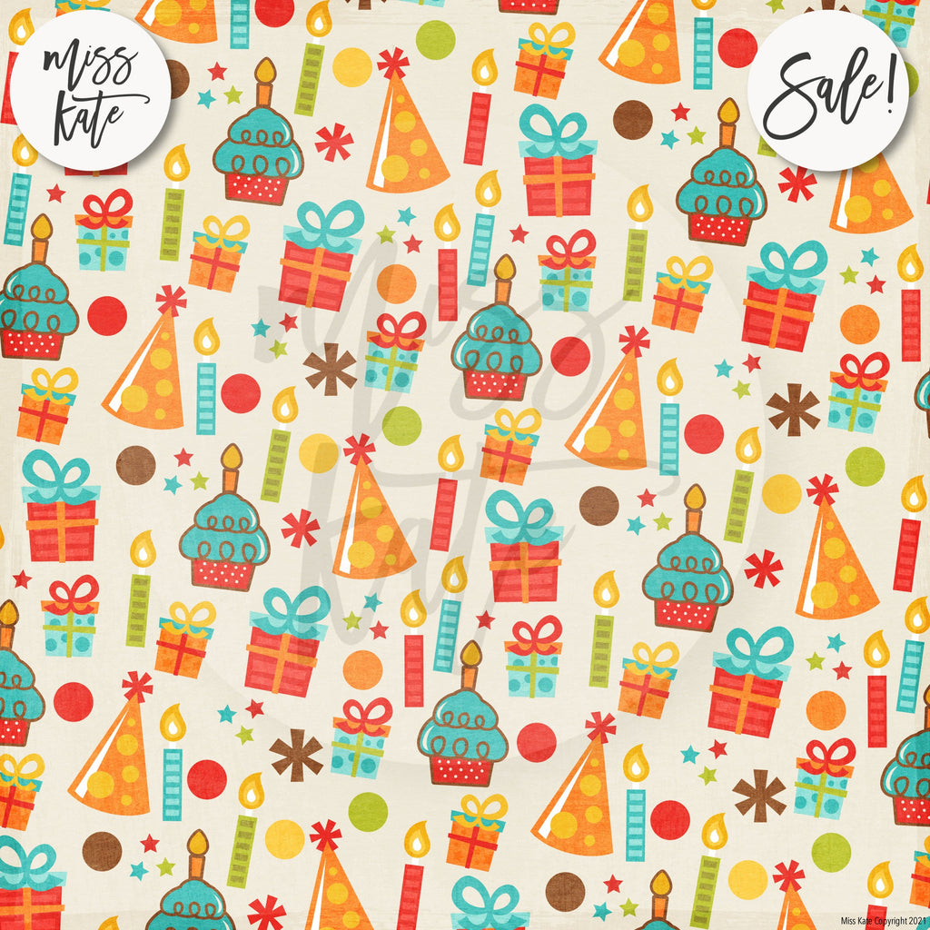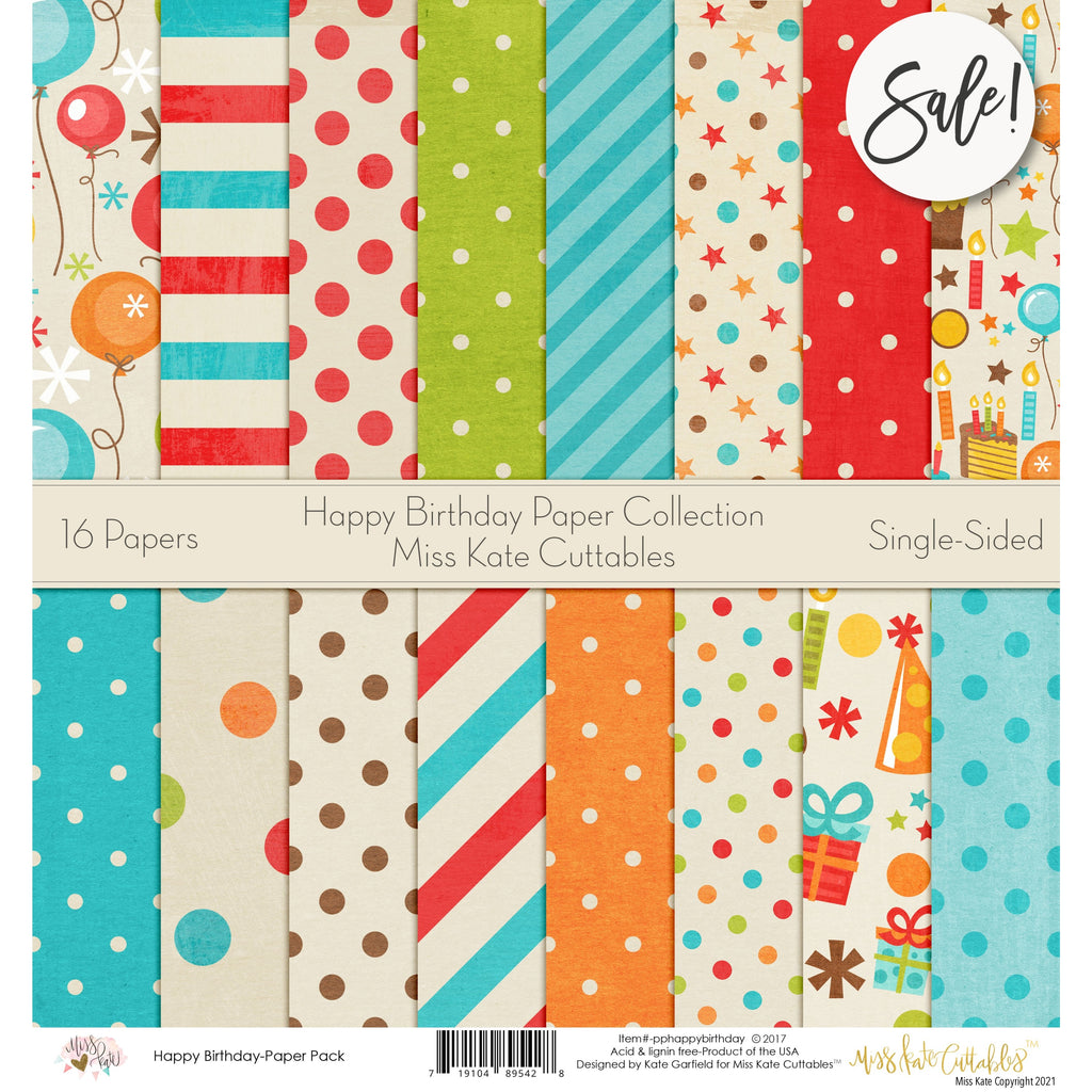 The Happy Birthday Paper Pack has a wide variety of Patterns including Polka Dots, Stripes, Stars, Balloons, Confetti, Birthday Cake, Presents, Candles, Party Hats, Wrapping Paper, First Birthday, 1-Year-Old, Red, White, Orange, Green, Cream, and Blue. Kids Party Celebrate Theme