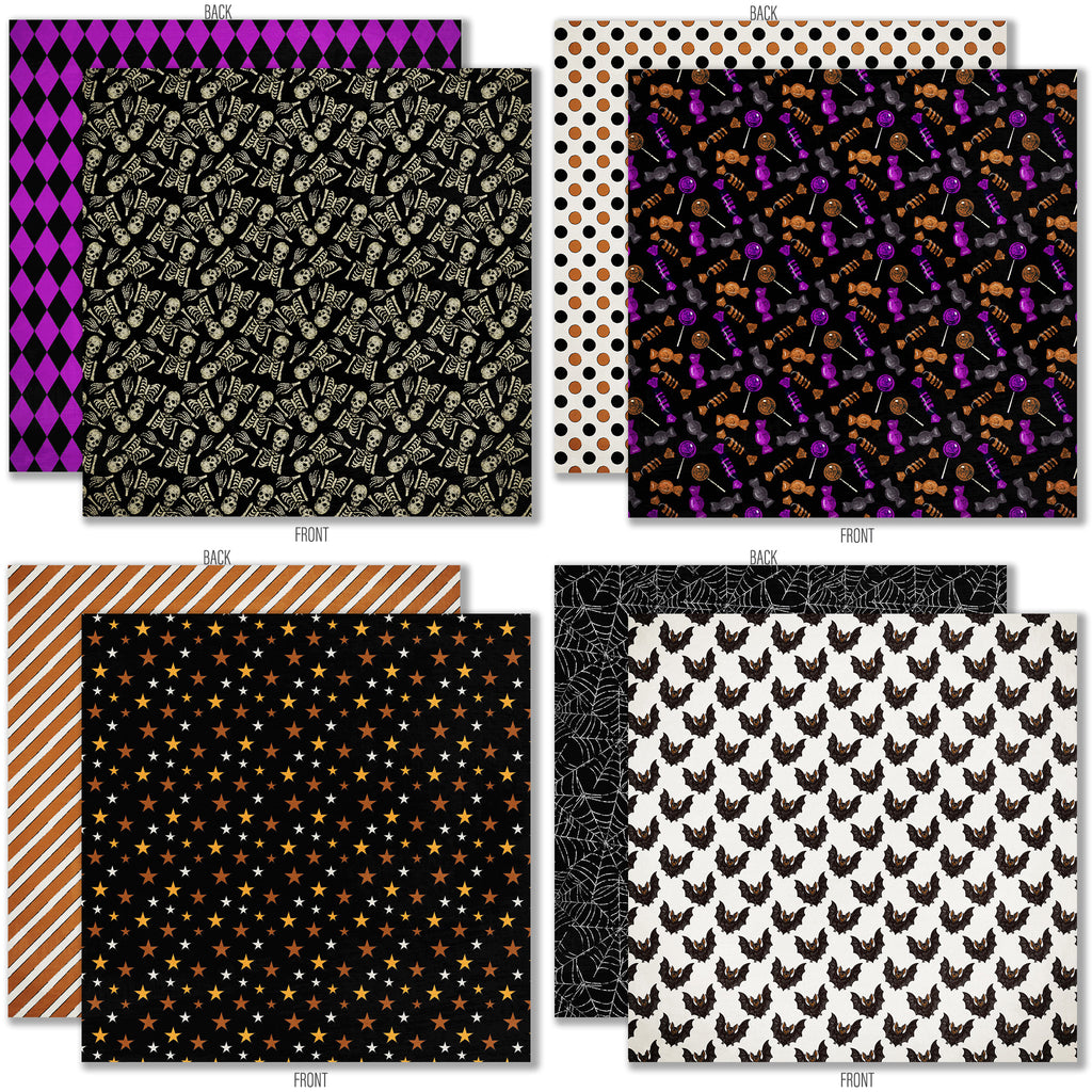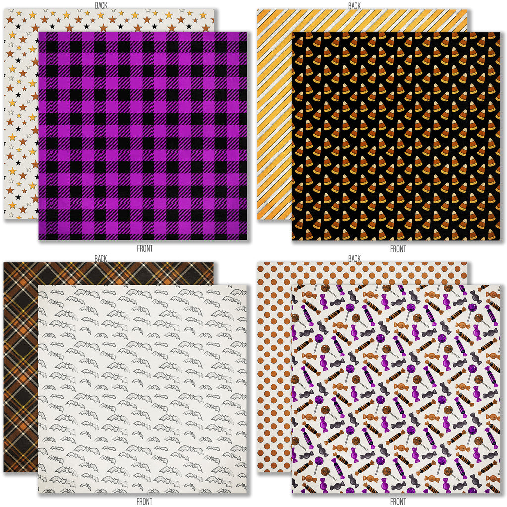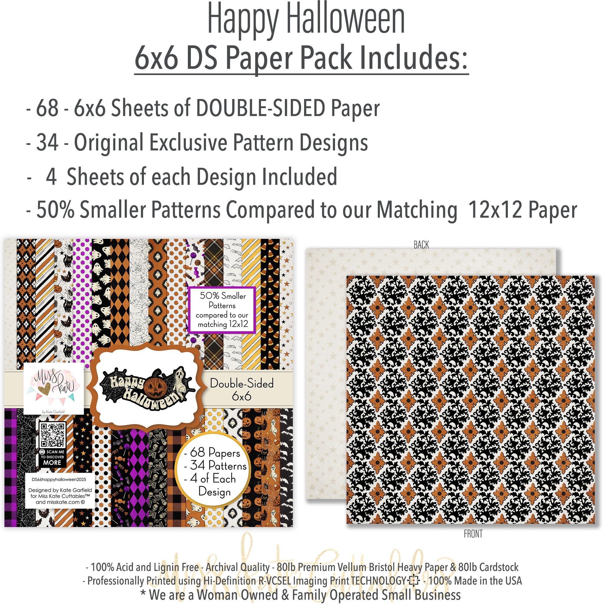 This “Happy Halloween” paper collection is a festive and delightfully spooky crafting kit designed to bring Halloween memories to life. Featuring a rich mix of traditional Halloween tones—pumpkin orange, midnight black, bone white, and pops of purple—this set includes classic seasonal patterns like spiderwebs, candy corn stripes, flying bats, creepy ghosts, bold plaids, and vintage-style diamonds. The collection showcases both playful and eerie artwork, from charming carved pumpkins and friendly ghosts to cauldrons, black cats, witches’ hats, and irresistible Halloween treats. With double-sided 12x12 papers, coordinating stickers, and themed accents like stars, candy, spiderwebs, and cute trick-or-treat characters, this kit offers endless scrapbooking, cardmaking, and DIY decor possibilities. Perfect for capturing costume photos, trick-or-treat adventures, haunted house fun, or October party memories, this set blends classic Halloween nostalgia with whimsical charm to help give your holiday moments a cozy, creative home. This 6x6-inch size is perfect for scrapbooking, card making, journaling, and DIY decor. The smaller scaled patterns work beautifully for photo mats, backgrounds, die cuts, embellishments, and layering in handmade crafts. With 68 sheets total (four of each design), this collection ensures ample variety for multiple creative projects. |