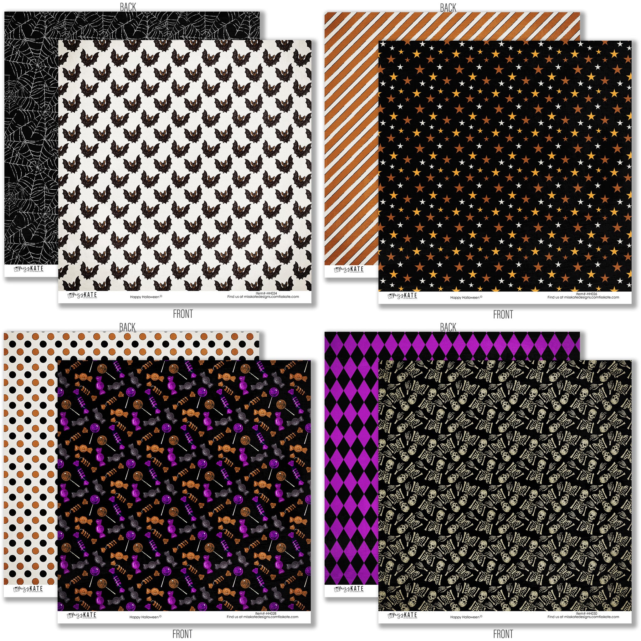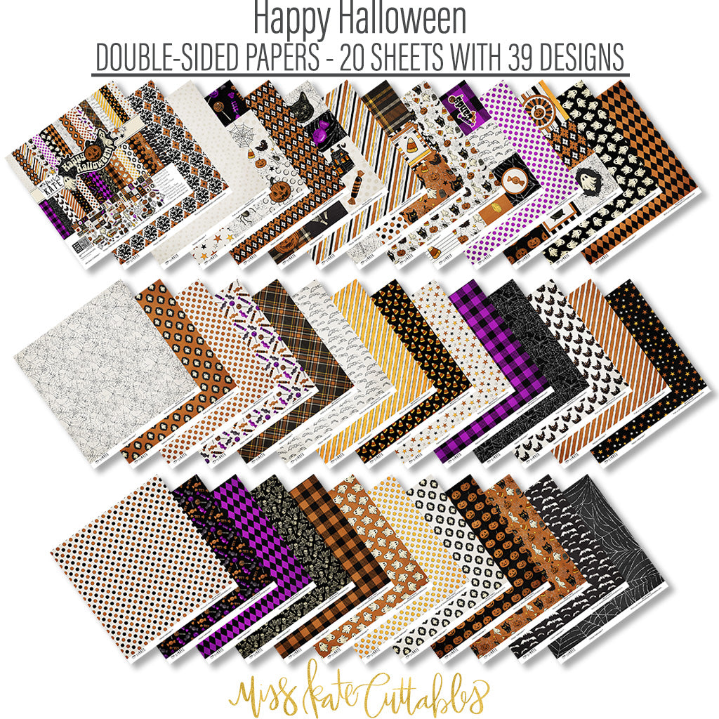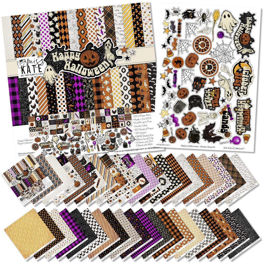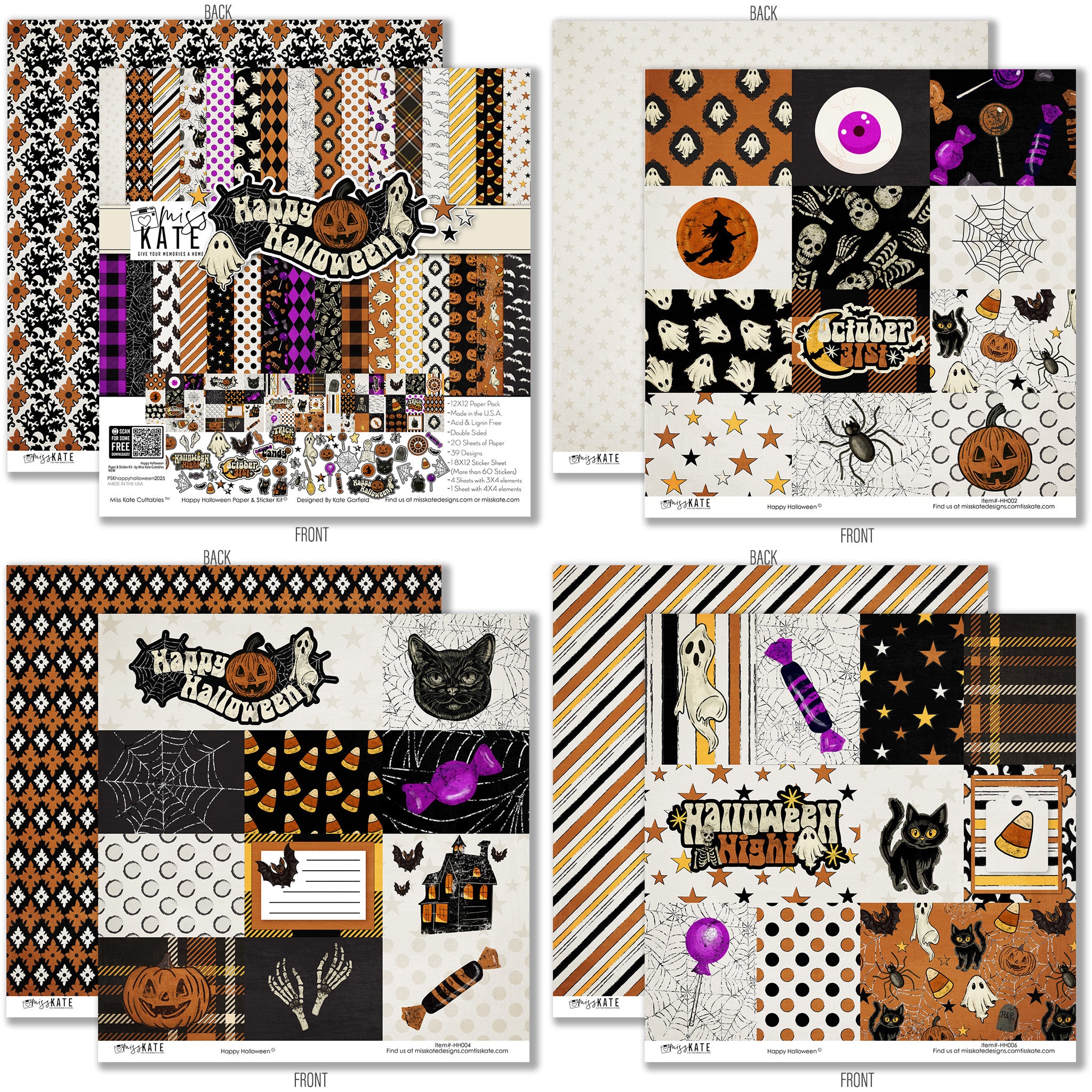 This “Happy Halloween” paper collection is a festive and delightfully spooky crafting kit designed to bring Halloween memories to life. Featuring a rich mix of traditional Halloween tones—pumpkin orange, midnight black, bone white, and pops of purple—this set includes classic seasonal patterns like spiderwebs, candy corn stripes, flying bats, creepy ghosts, bold plaids, and vintage-style diamonds. The collection showcases both playful and eerie artwork, from charming carved pumpkins and friendly ghosts to cauldrons, black cats, witches’ hats, and irresistible Halloween treats. With double-sided 12x12 papers, coordinating stickers, and themed accents like stars, candy, spiderwebs, and cute trick-or-treat characters, this kit offers endless scrapbooking, cardmaking, and DIY decor possibilities. Perfect for capturing costume photos, trick-or-treat adventures, haunted house fun, or October party memories, this set blends classic Halloween nostalgia with whimsical charm to help give your holiday moments a cozy, creative home.