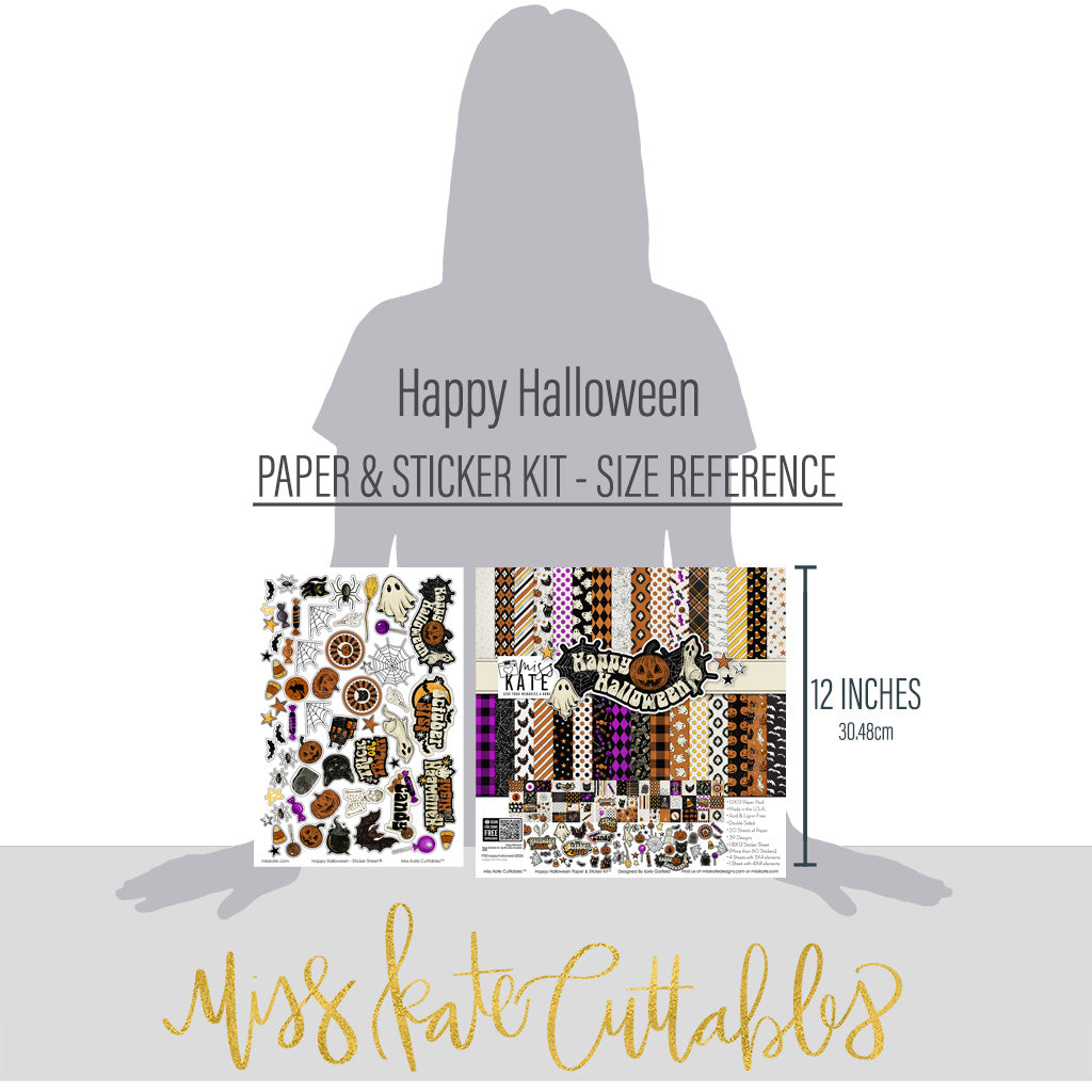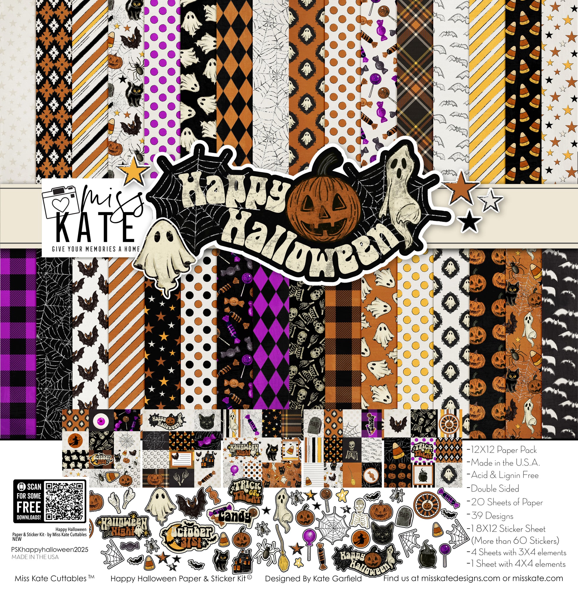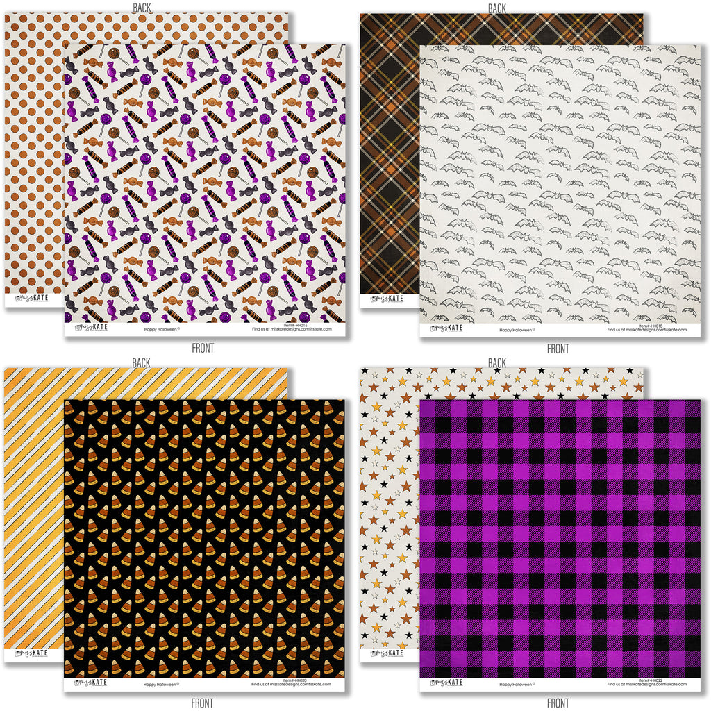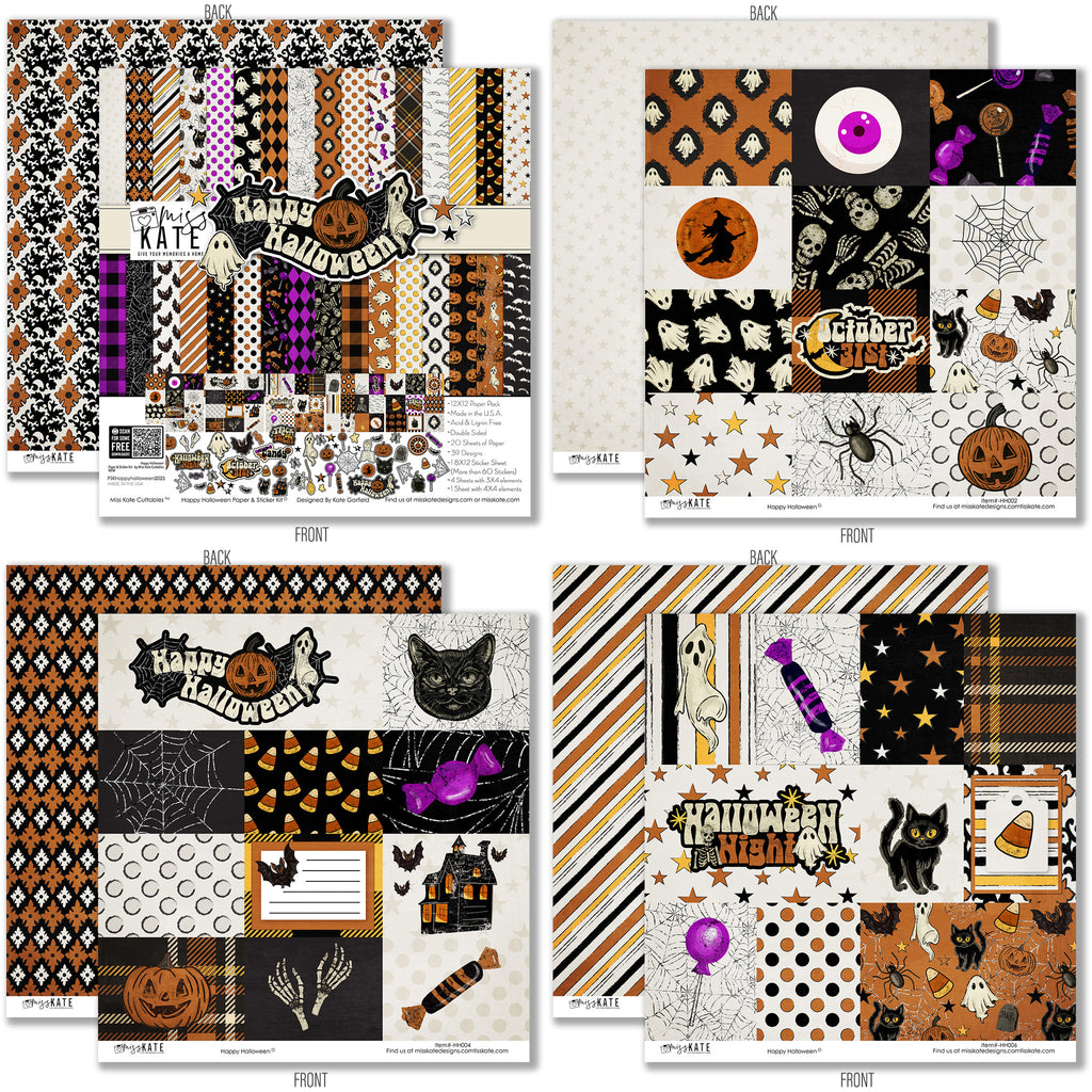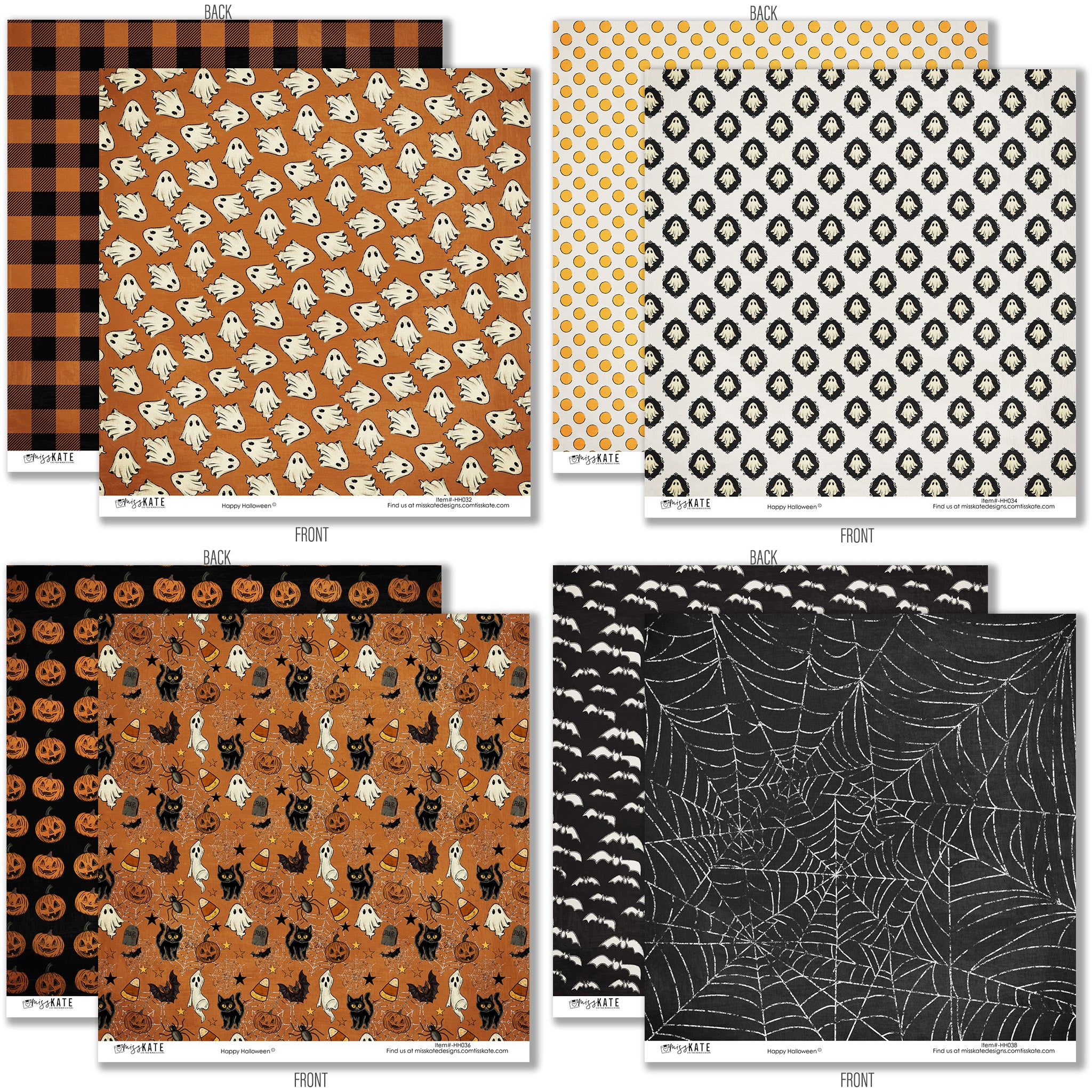 This “Happy Halloween” paper collection is a festive and delightfully spooky crafting kit designed to bring Halloween memories to life. Featuring a rich mix of traditional Halloween tones—pumpkin orange, midnight black, bone white, and pops of purple—this set includes classic seasonal patterns like spiderwebs, candy corn stripes, flying bats, creepy ghosts, bold plaids, and vintage-style diamonds. The collection showcases both playful and eerie artwork, from charming carved pumpkins and friendly ghosts to cauldrons, black cats, witches’ hats, and irresistible Halloween treats. With double-sided 12x12 papers, coordinating stickers, and themed accents like stars, candy, spiderwebs, and cute trick-or-treat characters, this kit offers endless scrapbooking, cardmaking, and DIY decor possibilities. Perfect for capturing costume photos, trick-or-treat adventures, haunted house fun, or October party memories, this set blends classic Halloween nostalgia with whimsical charm to help give your holiday moments a cozy, creative home.