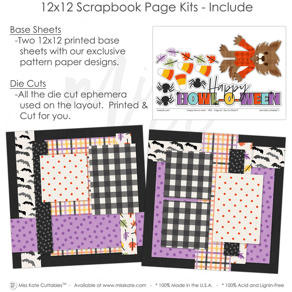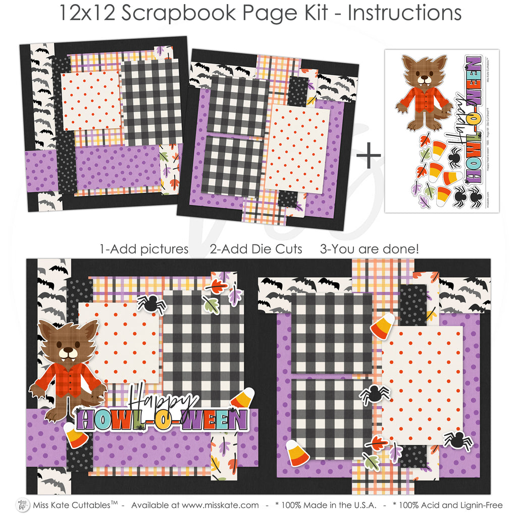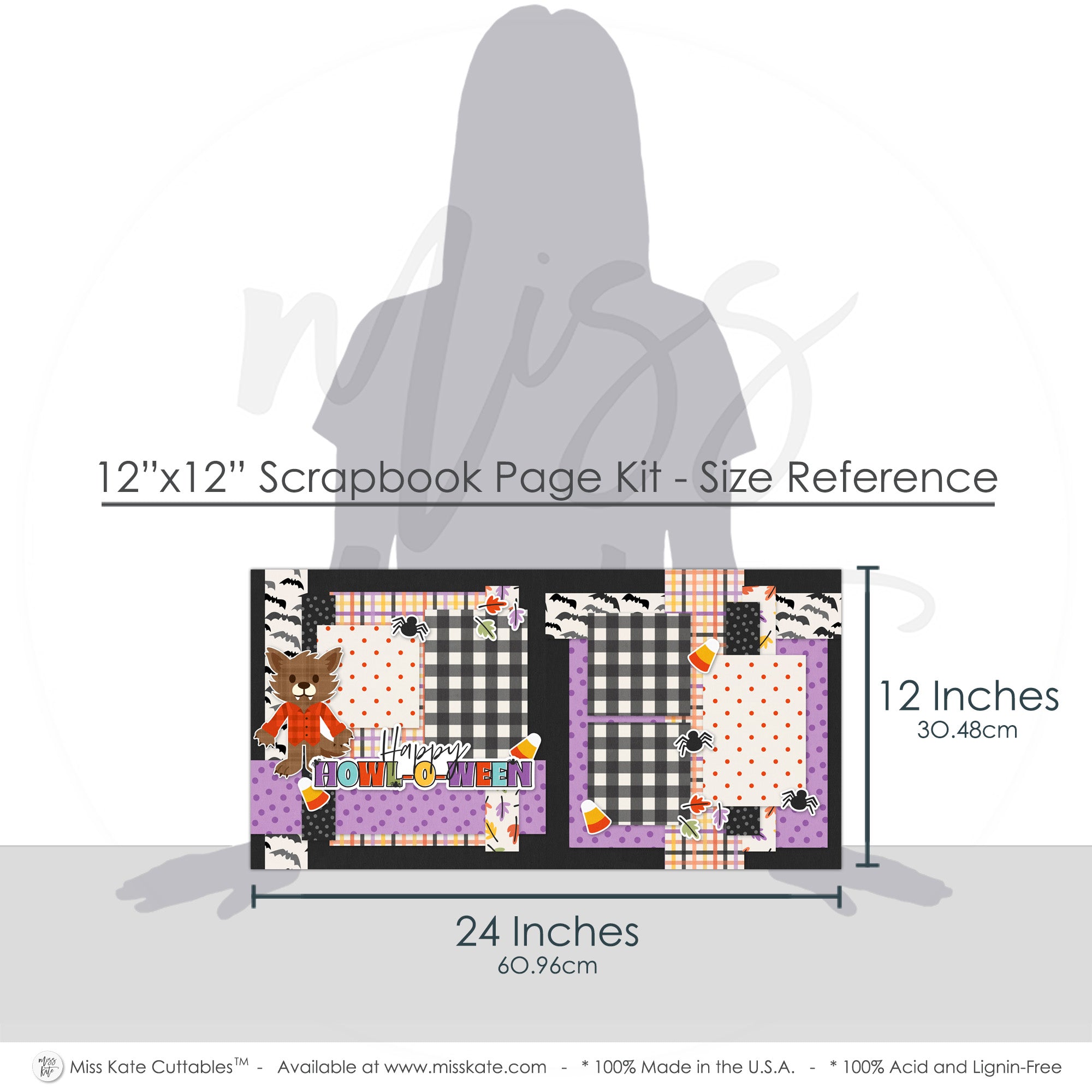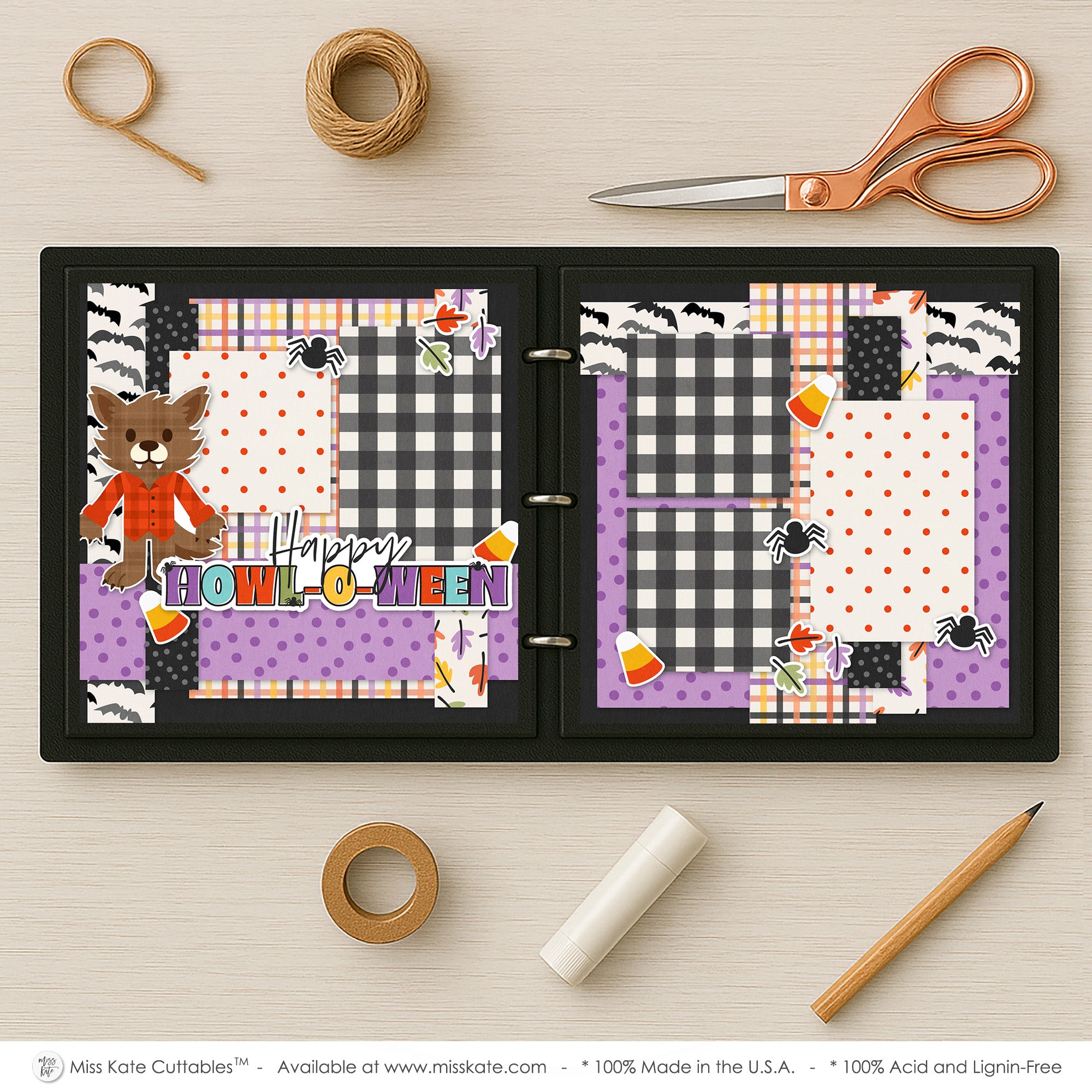This scrapbook layout bursts with festive Halloween cheer in a playful and colorful design. The pages feature a mix of bold patterns — black-and-white buffalo plaid, orange polka dots, and purple with dotted accents — all layered against a dark background for a striking contrast. Pops of orange, yellow, and green from candy corn, leaves, and playful spiders add a whimsical touch. The left page highlights an adorable cartoon werewolf dressed in a red flannel shirt, perfectly tying into the theme with the phrase “Happy Howl-o-ween” in vibrant, multicolored letters. The right page mirrors the same charming balance of patterns and motifs, providing space for photos framed by festive prints and Halloween icons. The overall layout feels fun, cozy, and perfectly spirited — a delightful celebration of Halloween with a friendly, lighthearted twist.