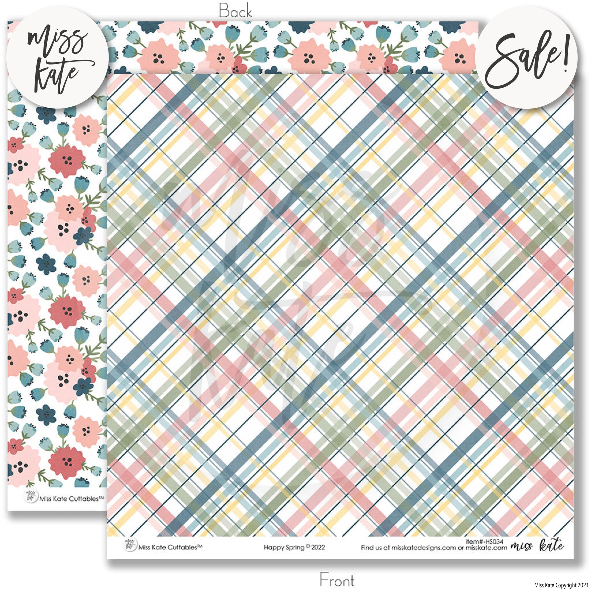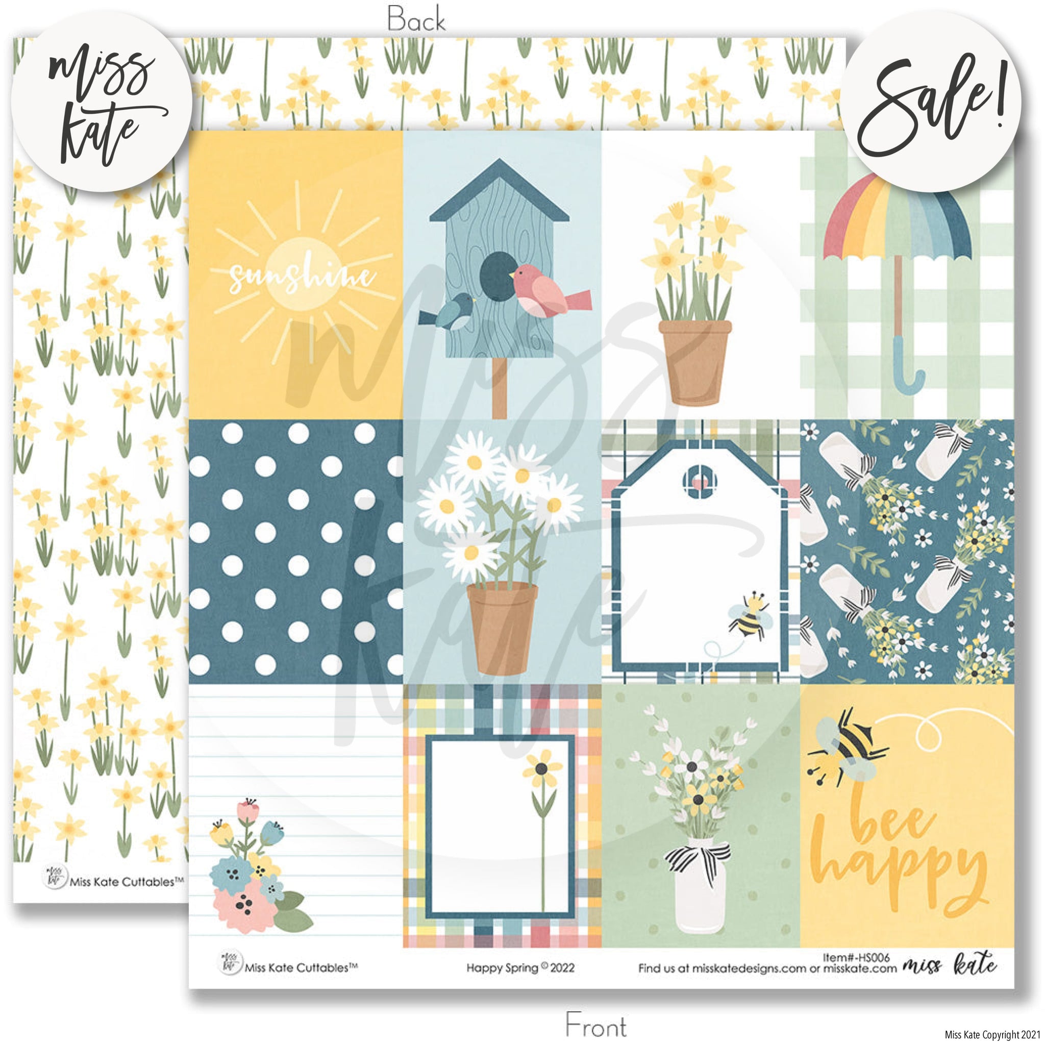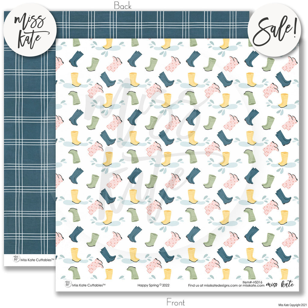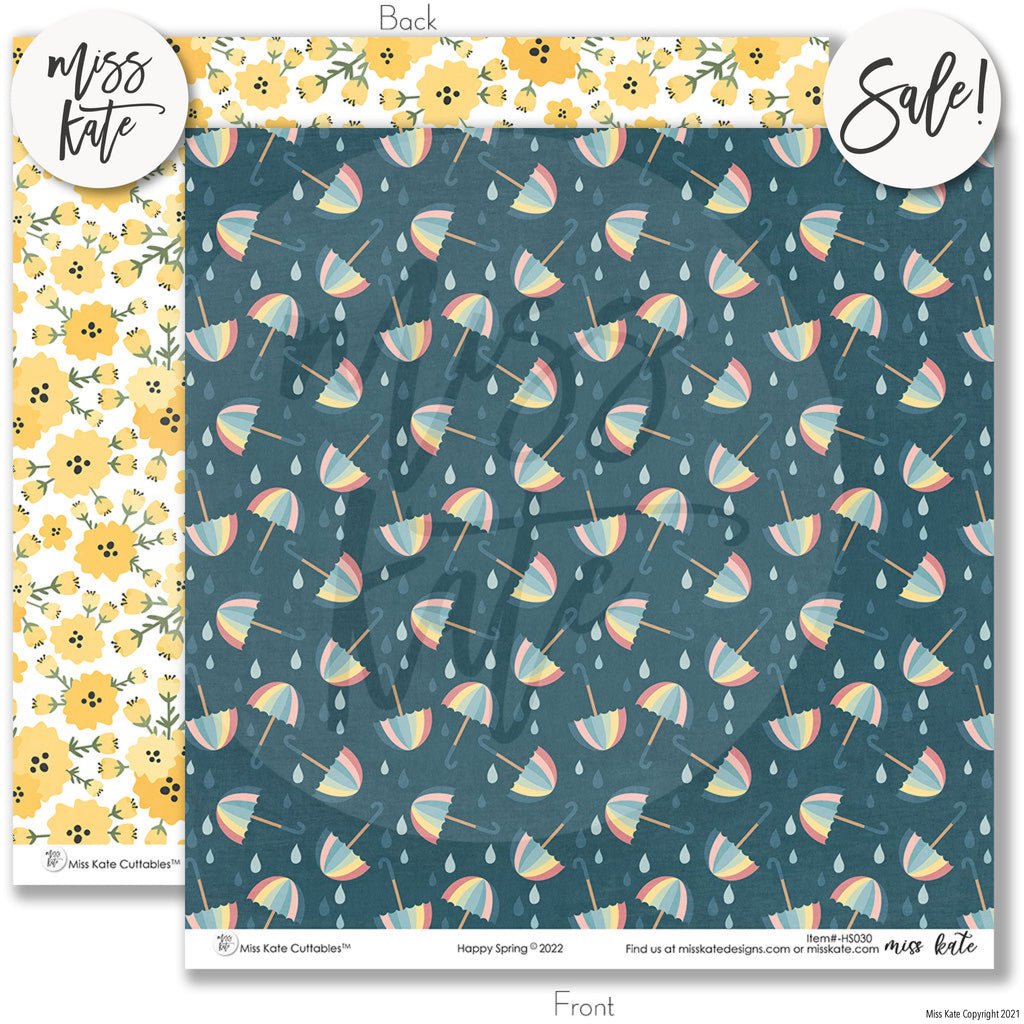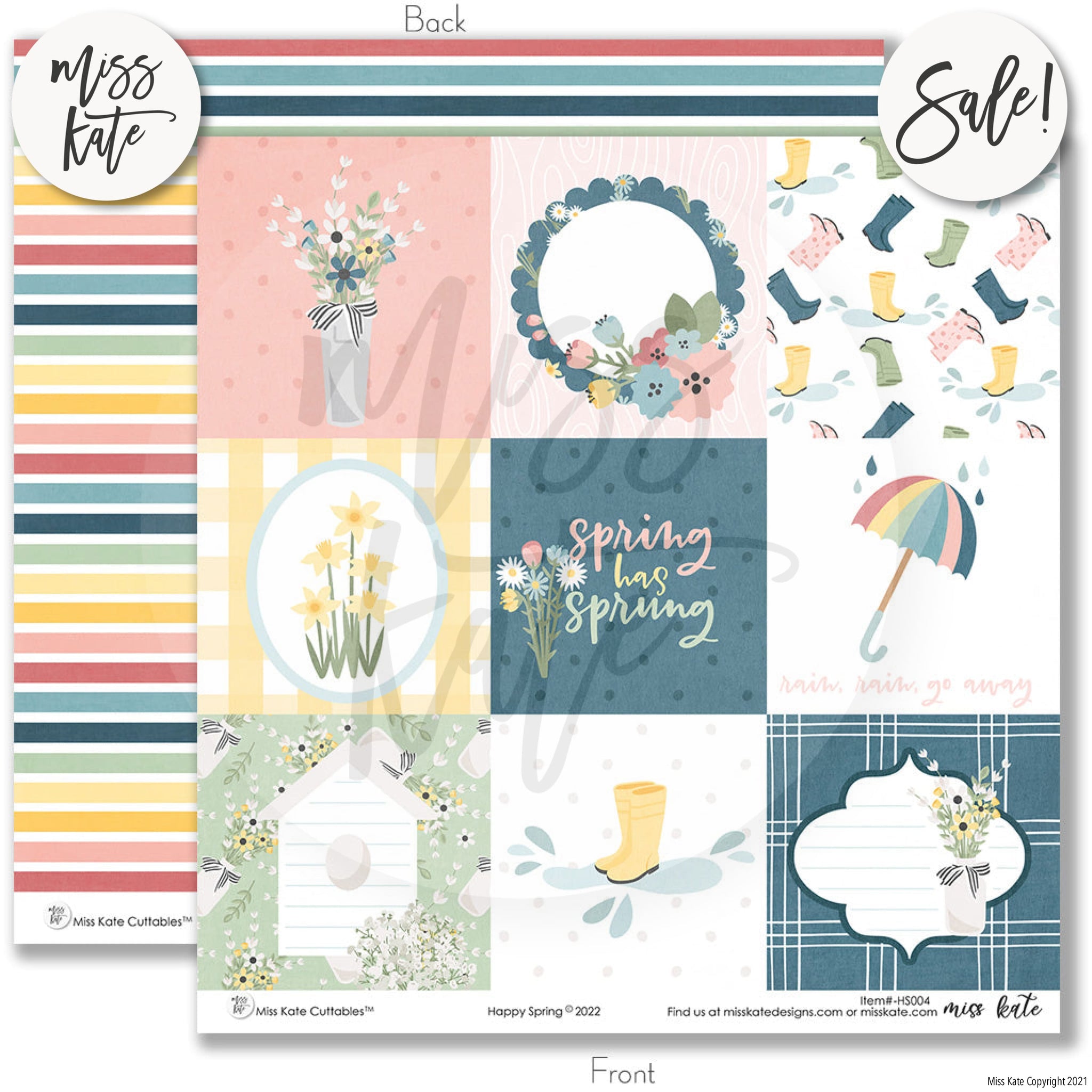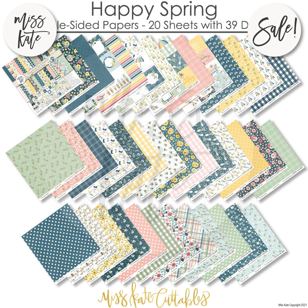 The Happy Spring Paper Pack- has a wide variety of patterns including polka dots, plaid, stripes, spring flowers, rain boots, umbrellas, bees, daffodils, butterflies, rainbows, and birds in cute modern spring colors.