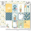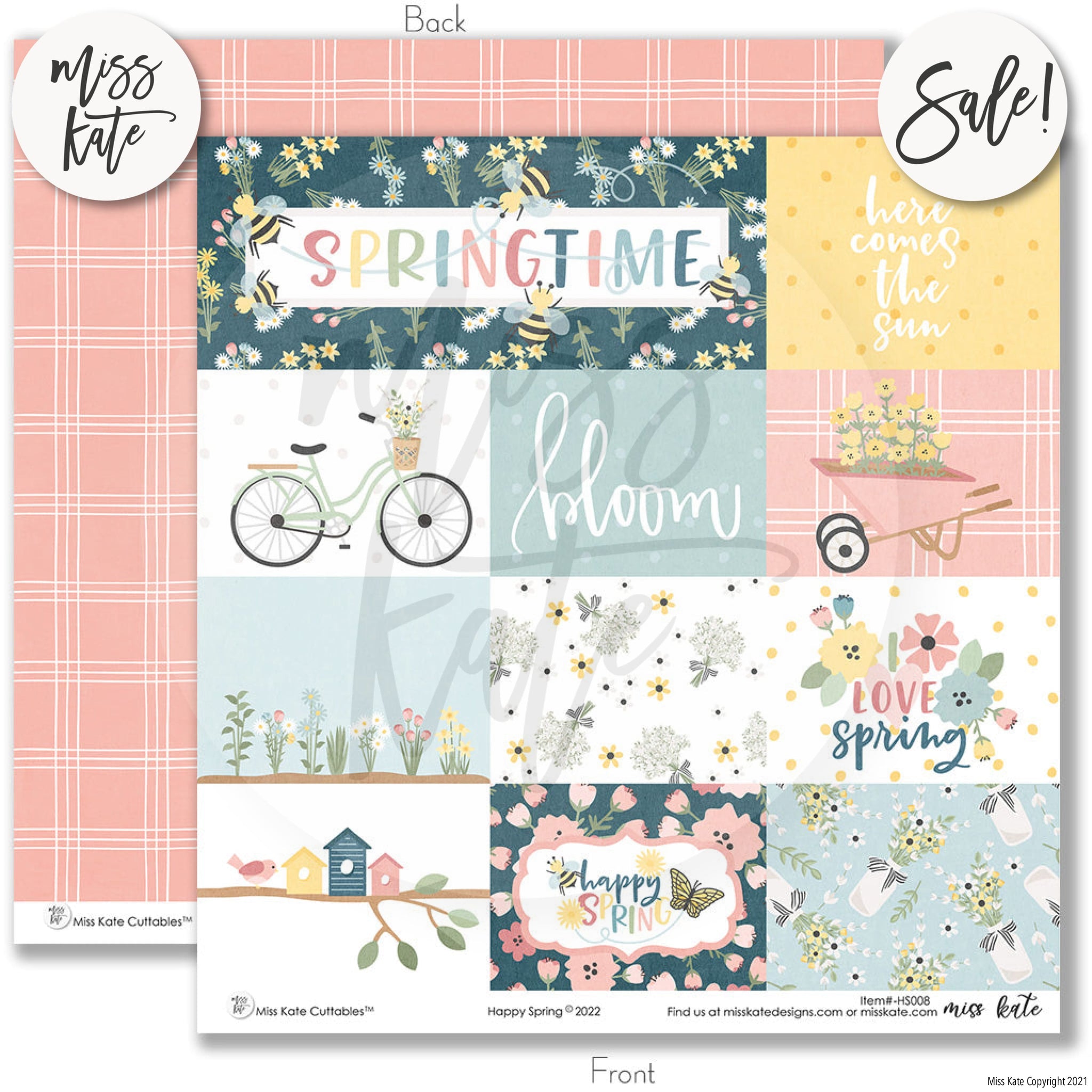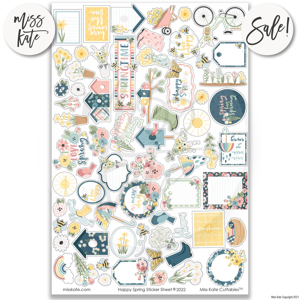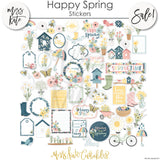 Happy Spring Paper Sticker Sheet- has some spring titles, suns, rainbows, bicycle, potted plants, rain boots, journaling cards, and birdhouses in cute spring colors.
