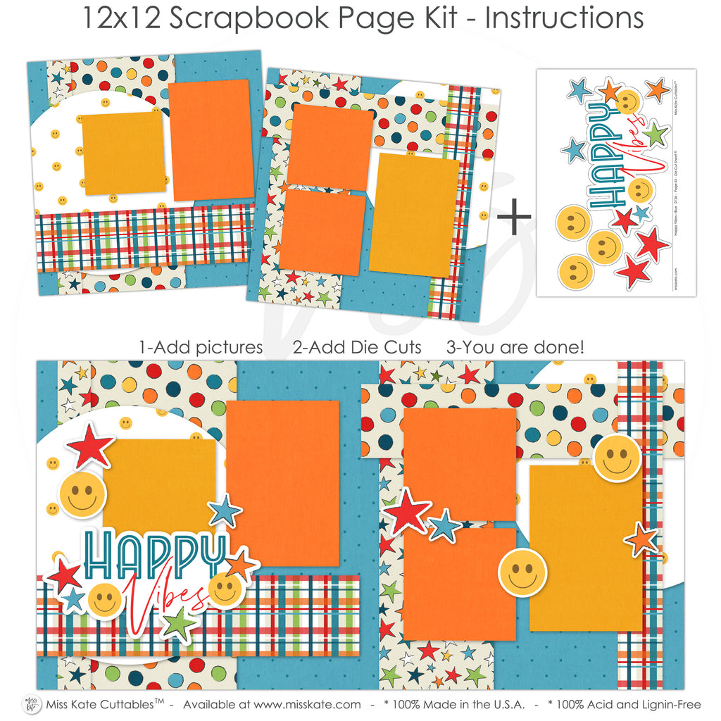 This lively scrapbook layout radiates playful, upbeat energy with its bold mix of teal, sunny yellow, and vibrant orange. Layered photo mats sit atop cheerful patterned papers featuring colorful polka dots, stars, and classic plaid, creating a fun, youthful rhythm across the two-page spread. Smiling face embellishments and star accents are scattered throughout, adding a sense of motion and carefree joy. The “Happy Vibes” title anchors the left page with a modern, hand-lettered feel, tying the design together into a bright, feel-good layout that’s perfect for capturing happy moments, personality-filled photos, and everyday adventures.