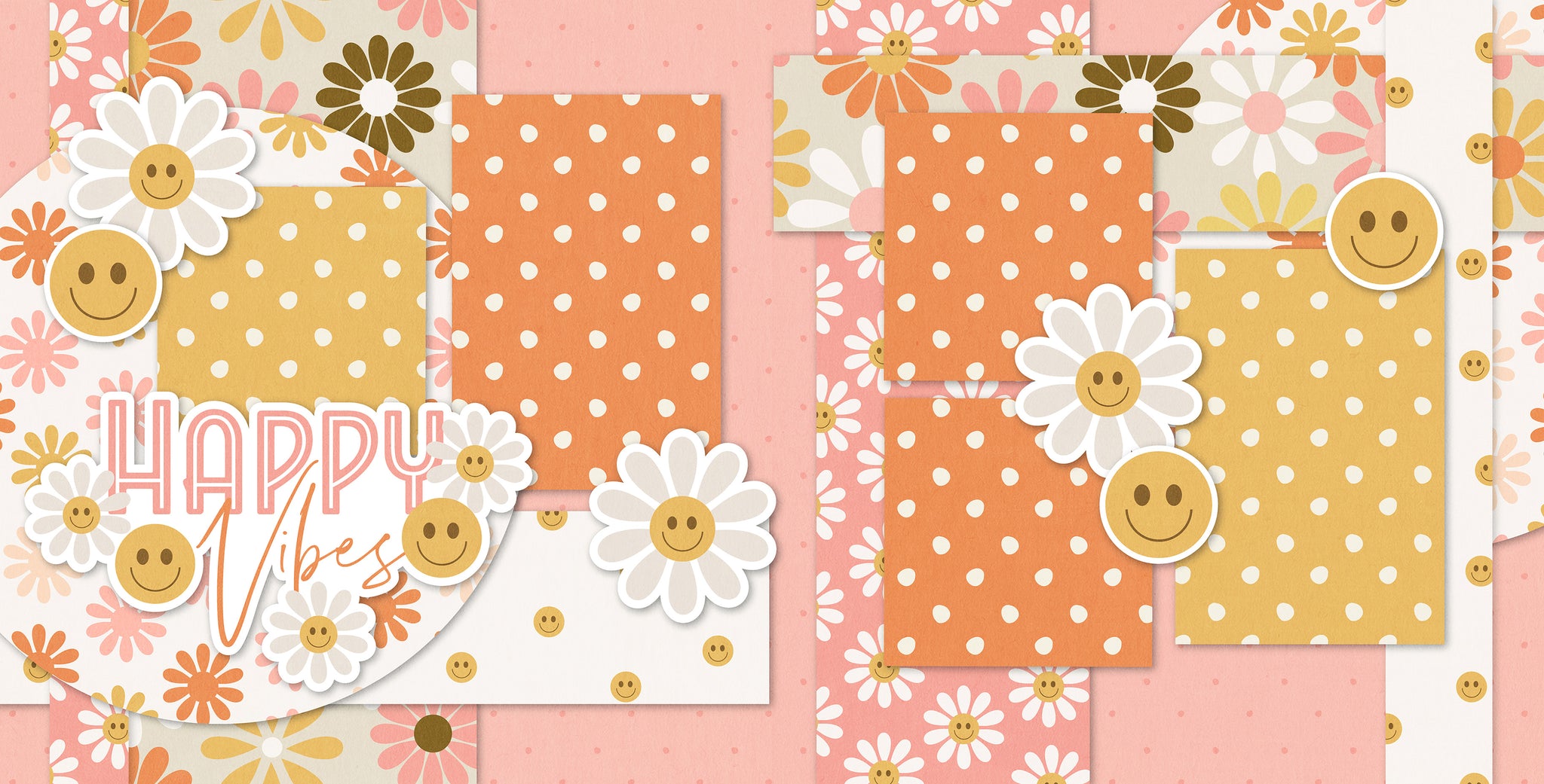 This cheerful scrapbook layout bursts with sunny, feel-good energy, combining warm peach, soft pink, and buttery yellow tones with playful daisy patterns throughout. Layered photo mats in polka dots and florals create a balanced, two-page design, while smiling daisy embellishments and happy face accents add a whimsical, carefree touch. The soft gradients and rounded shapes keep the look light and friendly, perfectly complementing the “Happy Vibes” title that anchors the left page. Overall, the layout feels bright, joyful, and full of positivity—an ideal design for capturing happy moments, everyday smiles, or memories that radiate warmth and fun.