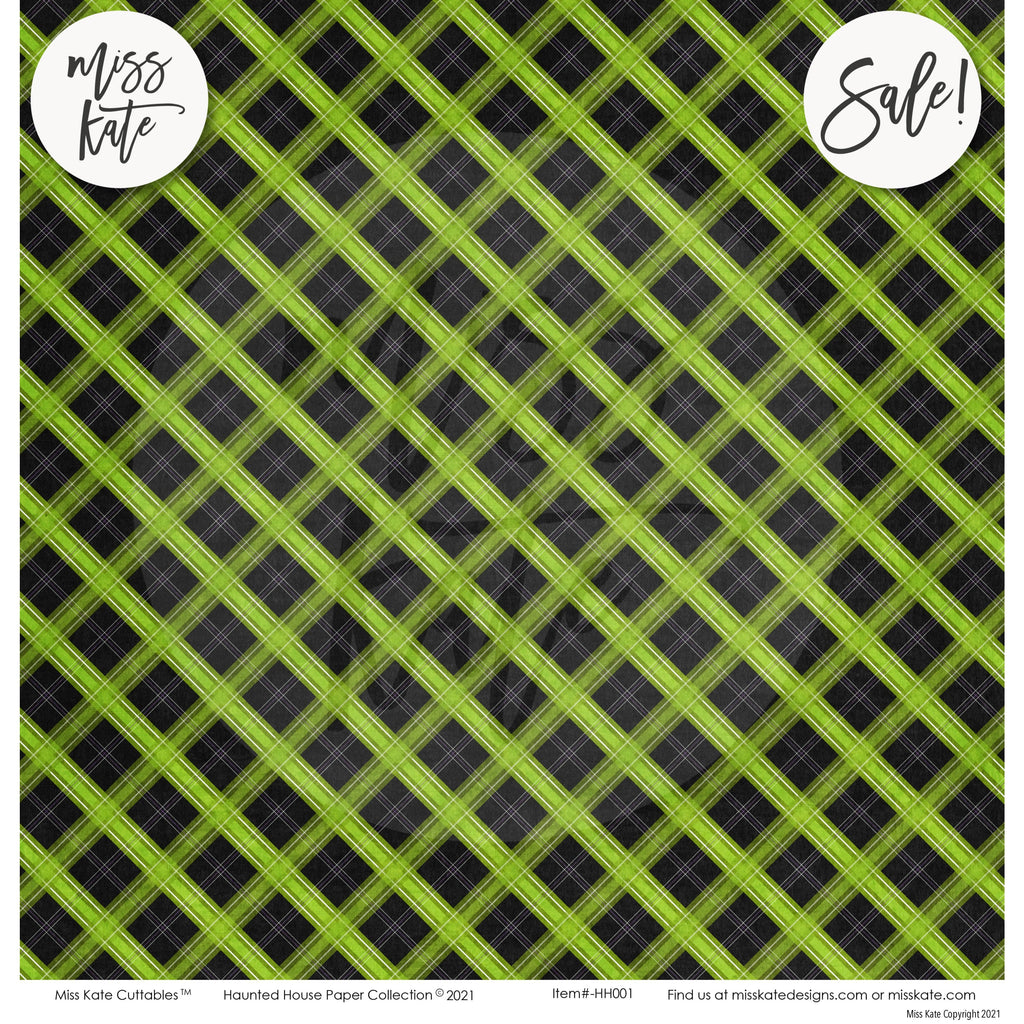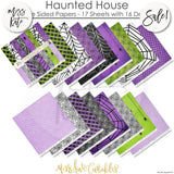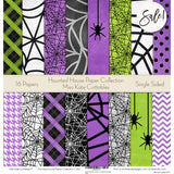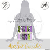 The Haunted House paper pack has a wide variety of Patterns including Argyle, Plaid, Spider Webs, Spiders, Black Widow, Polka Dots, Hounds Tooth, Ric Rac, Green, Purple, Black, White.