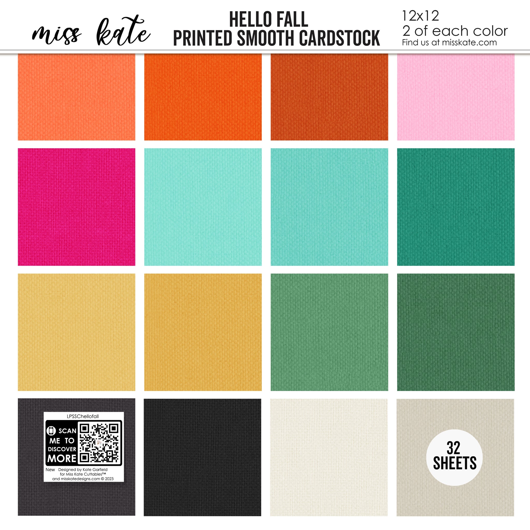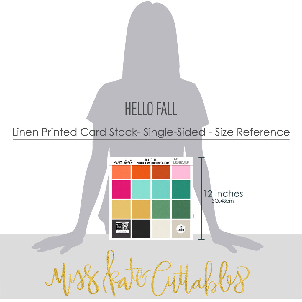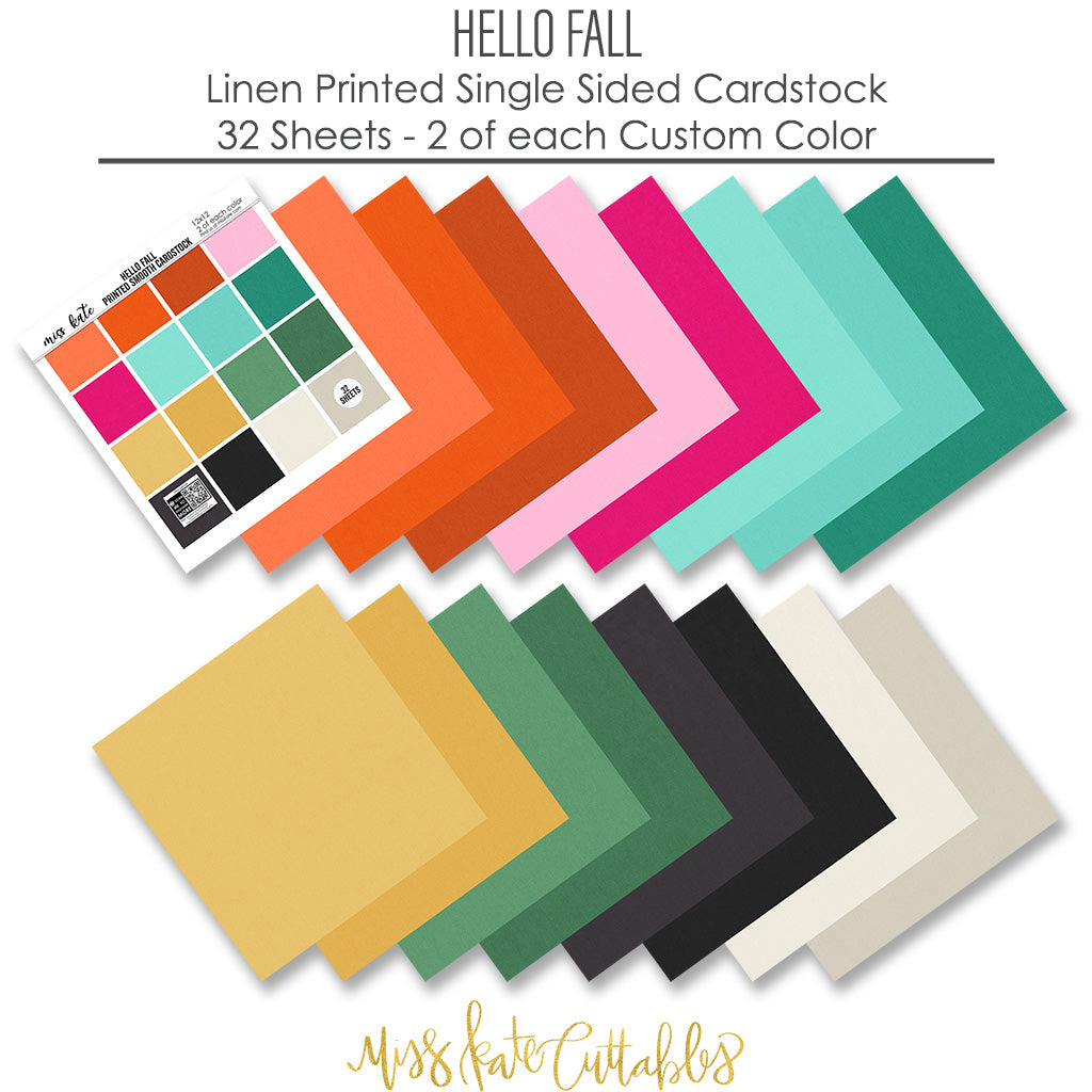 Cardstock Description Single-Sided Linen-Printed Smooth Cardstock Kate created 16 custom colors that perfectly match our Hello Fall designs, added her exclusive Linen Pattern, and combined them for you in this 32 sheet pack. Colors Match It has NEVER been this easy to match cardstock with paper! About our Paper Our cardstock sheets provide a stiff, strong surface to work on that has a linen feel. You will find that it cuts beautifully in your Cricut, Cameo, or any other cutting machine. It is perfect for backgrounds, die cuts, photo mats, and any other crafting project. We love our Linen Printed Card Stock and think you will too! THEME: Fall, Autumn |