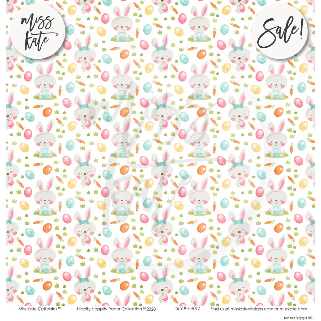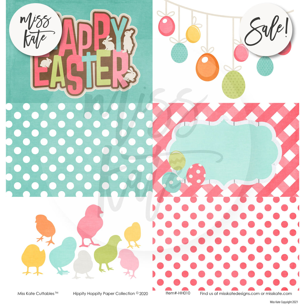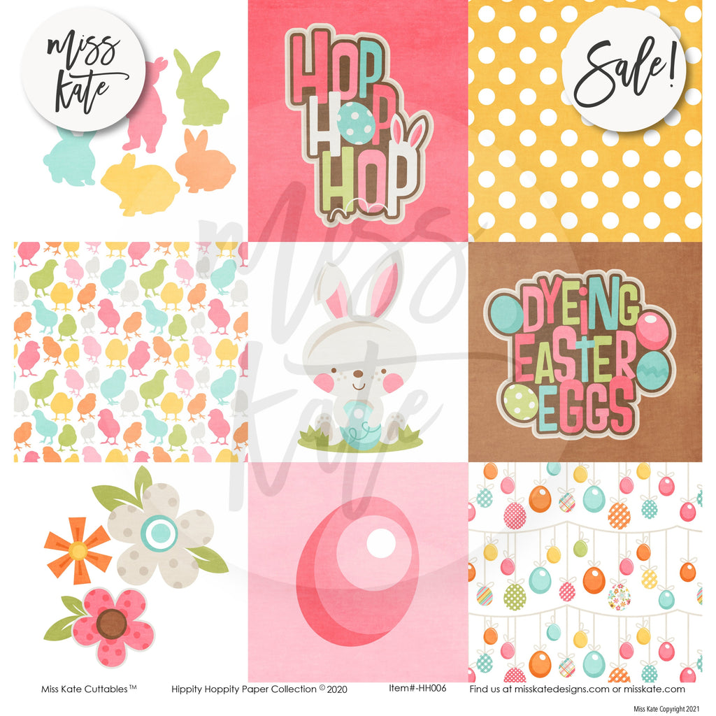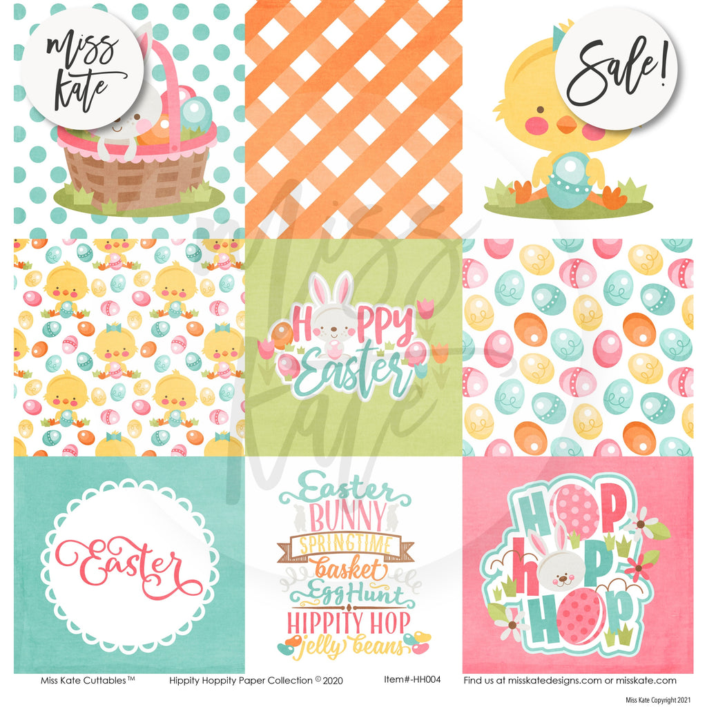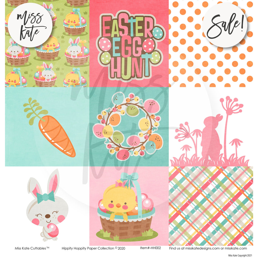 The Hippity Hoppity Paper- The Hippity Hoppity Double-Sided Paper has a wide variety of Patterns including flowers, polka dots, bunnies, chicks, Easter eggs, Stripes, and Carrots. It also includes 4x4 & 4x6 Elements!