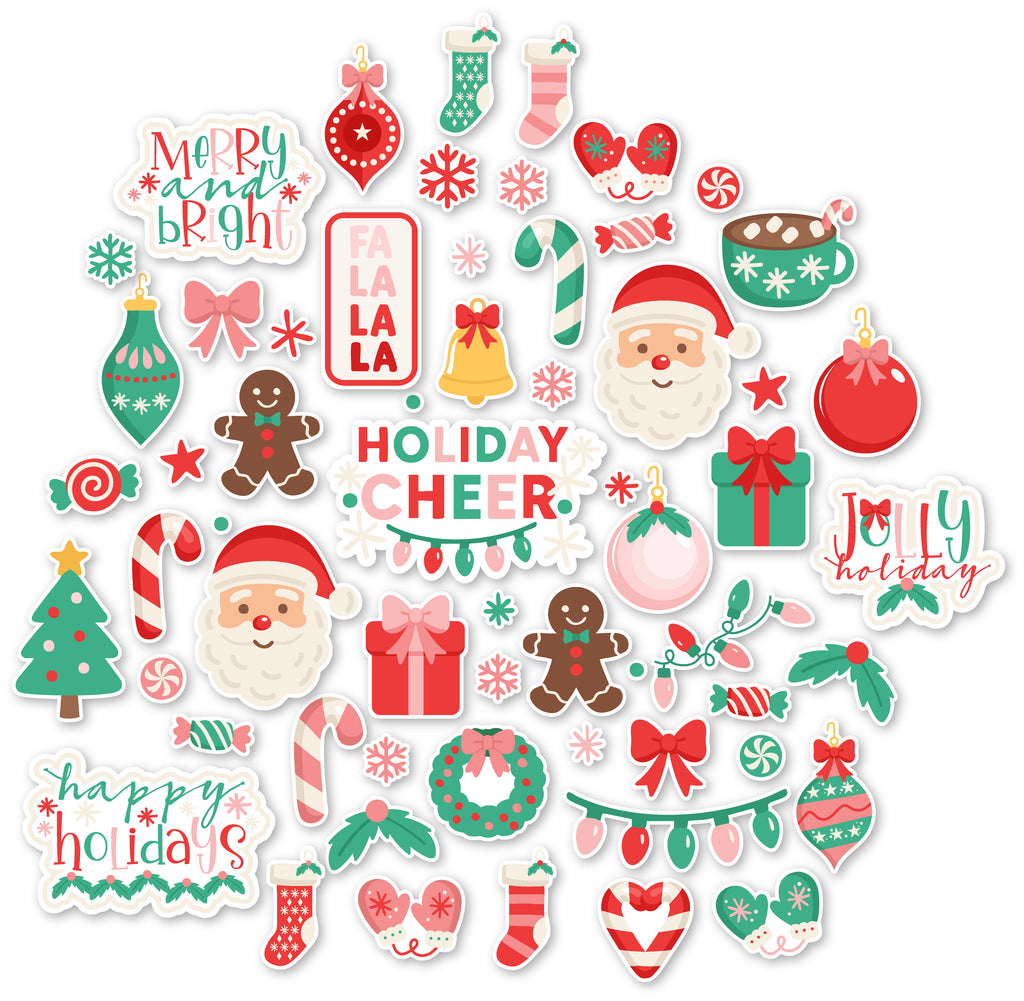 Collection Overview:This festive die cut collection is filled with bright, playful holiday icons and cheerful sentiments in a coordinated red, green, pink, and cream color palette. Whimsical illustrations include smiling Santa faces, gingerbread cookies, candy canes, ornaments, stockings, mittens, wreaths, bows, bells, gifts, and mugs of cocoa, all outlined with a soft white border for easy layering. Scattered snowflakes, stars, candies, and holiday lights add extra sparkle and movement throughout the collection. Sentiments like “Holiday Cheer,” “Merry and Bright,” “Fa La La,” “Happy Holidays,” and “Jolly Holiday” anchor the design with a joyful, hand-lettered feel. Overall, the set feels warm, playful, and nostalgic—perfect for adding charming finishing touches to Christmas scrapbook pages, cards, planners, and holiday crafts.Perfect For: